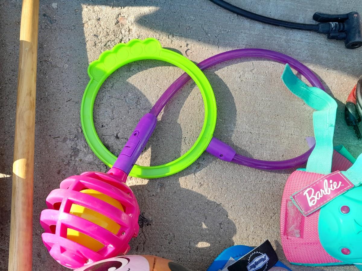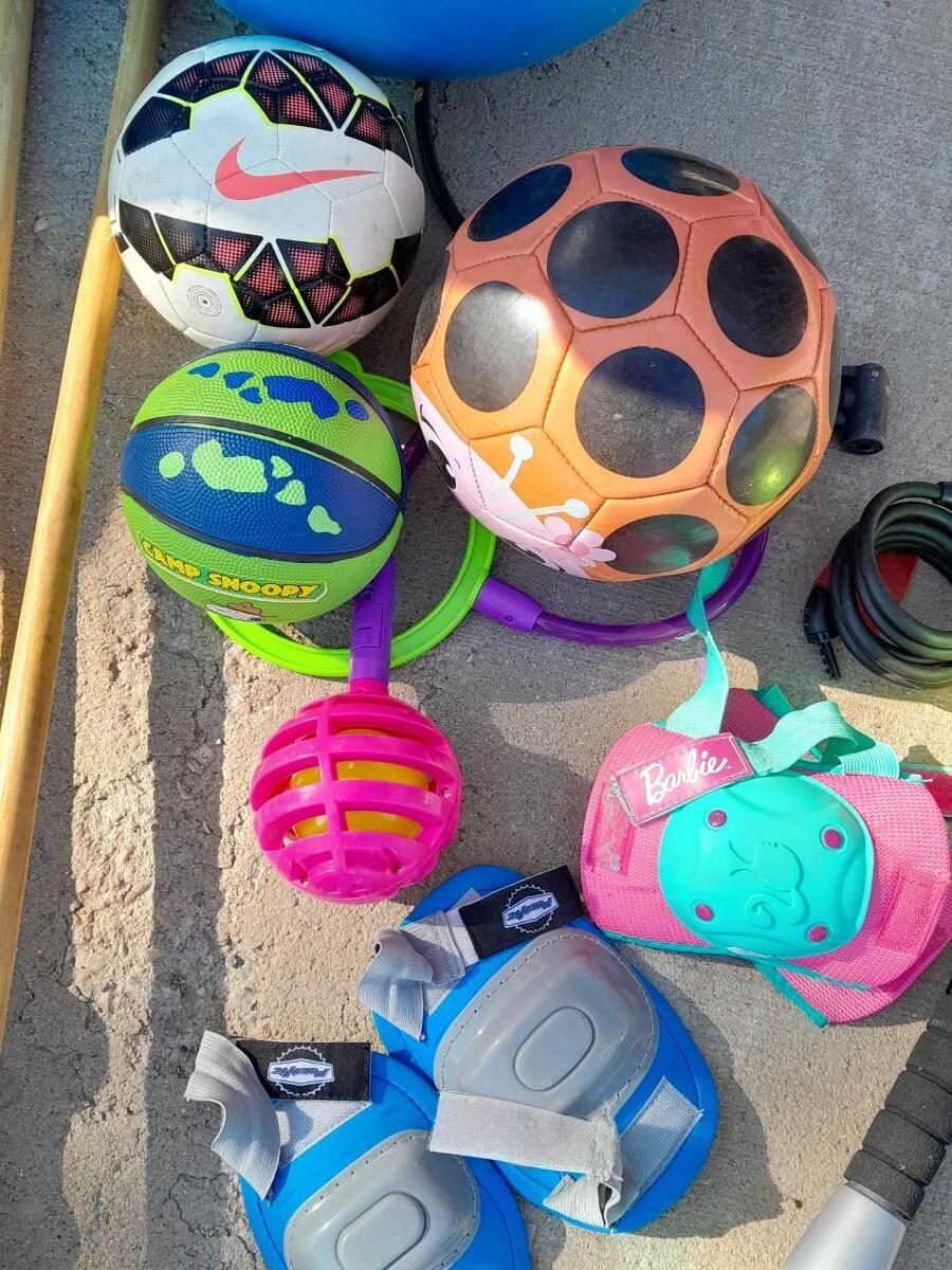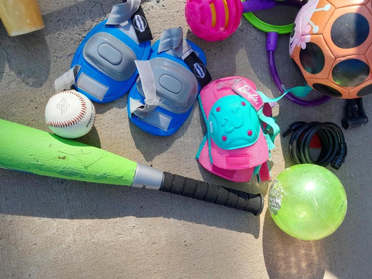 BALLS, KNEE PADS, BAT, BIKE LOCK WITH COMBINATION, SKIP LIGHTUP TOY, AND MORE (does not include the blue bounce ball yellowed out)