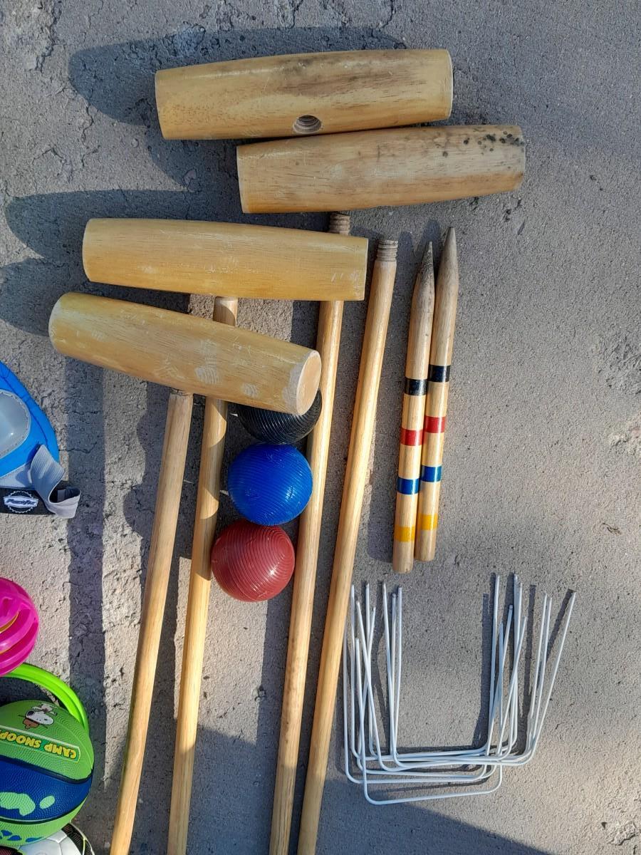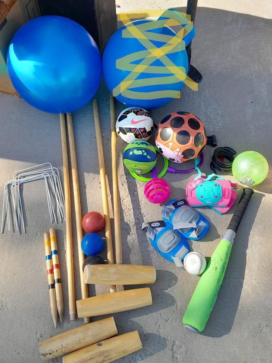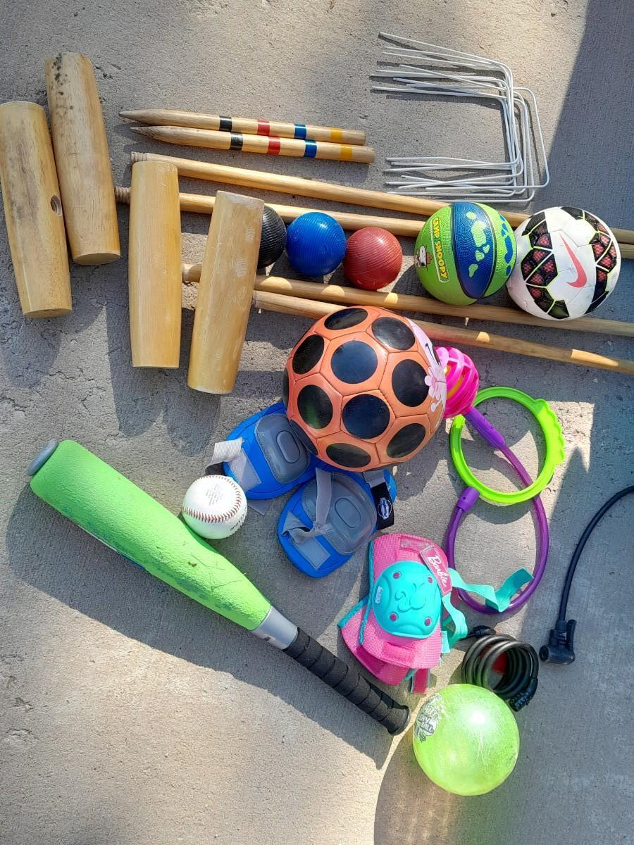 BALLS, KNEE PADS, BAT, BIKE LOCK WITH COMBINATION, SKIP LIGHTUP TOY, AND MORE (does not include the blue bounce ball yellowed out)