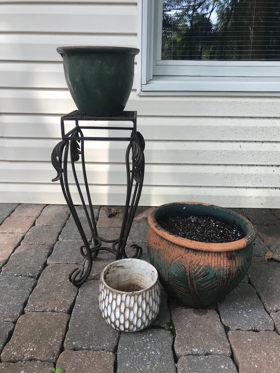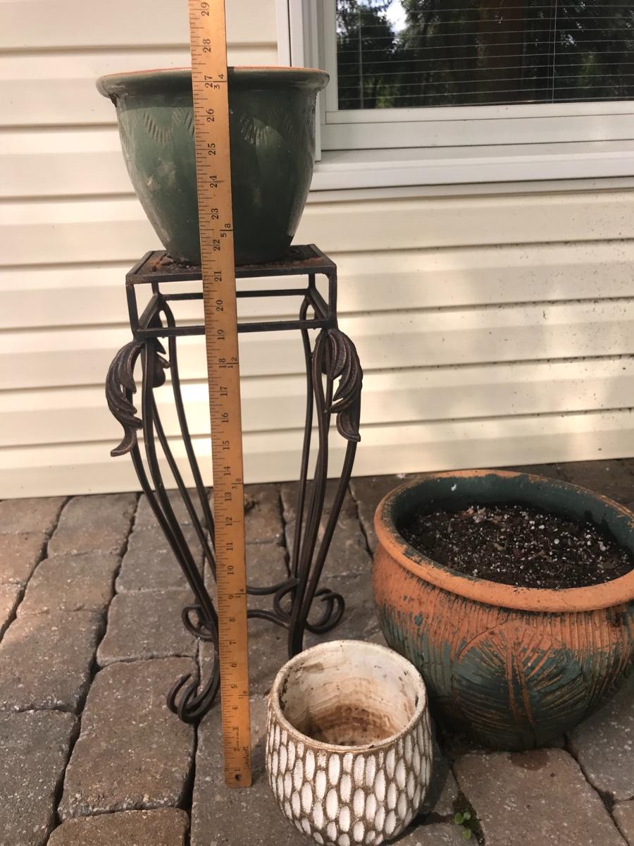 Three pots for your plants, and a wrought iron stand. Please see all pictures as they are the best representation of the items. The pictures show condition, measurements if taken, and what is included in the lot. Due to the large amount that we photograph and the time frame, we are not always able to take measurements. All items unless noted, are pre-owned and have been used. If you purchased furniture, you must bring help. We do not allow one person to carry large furniture out on their own. Bring help, tools and a truck for the safety of our client’s homes, and your personal safety. Company policy. Thank you.