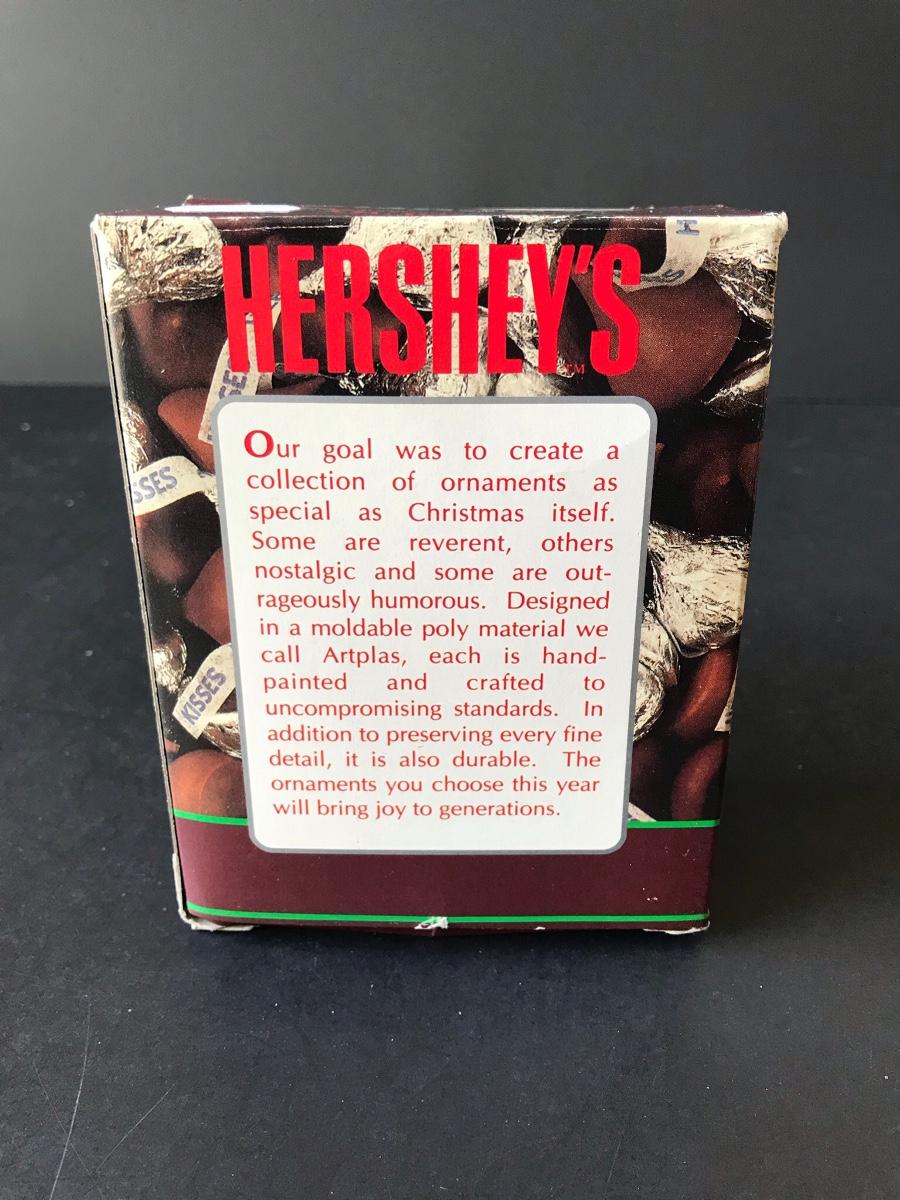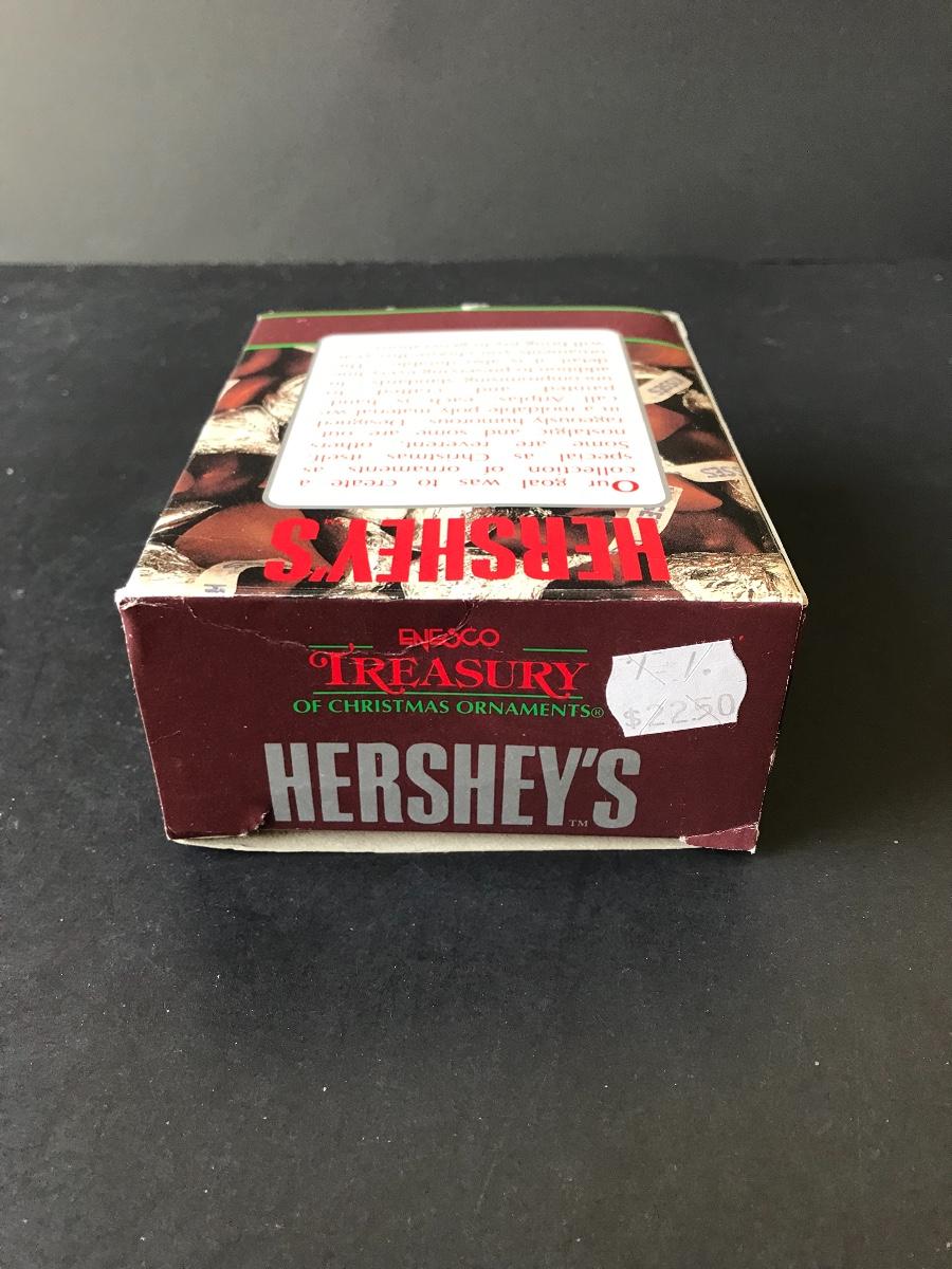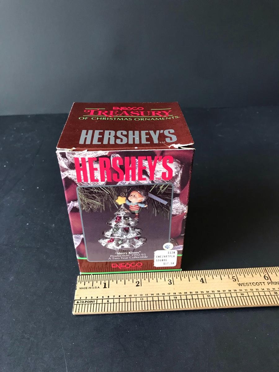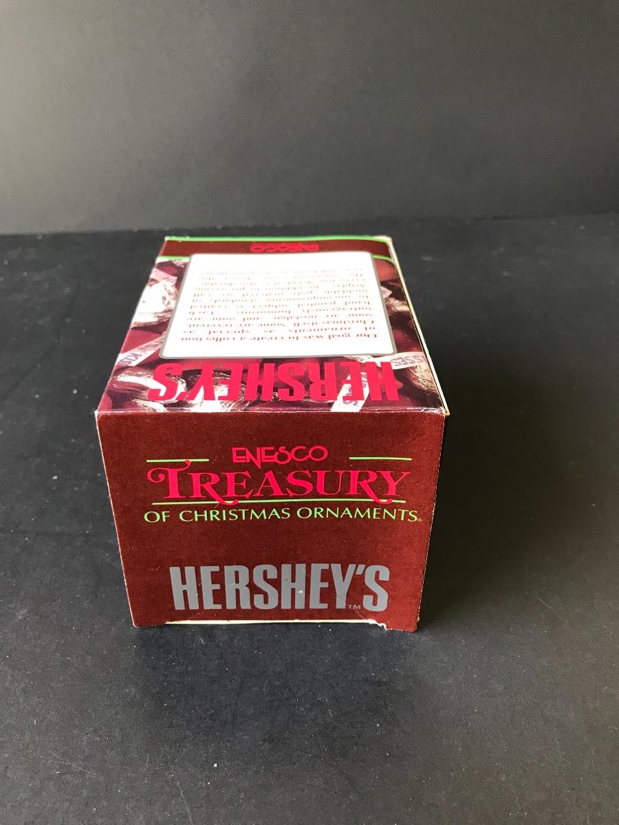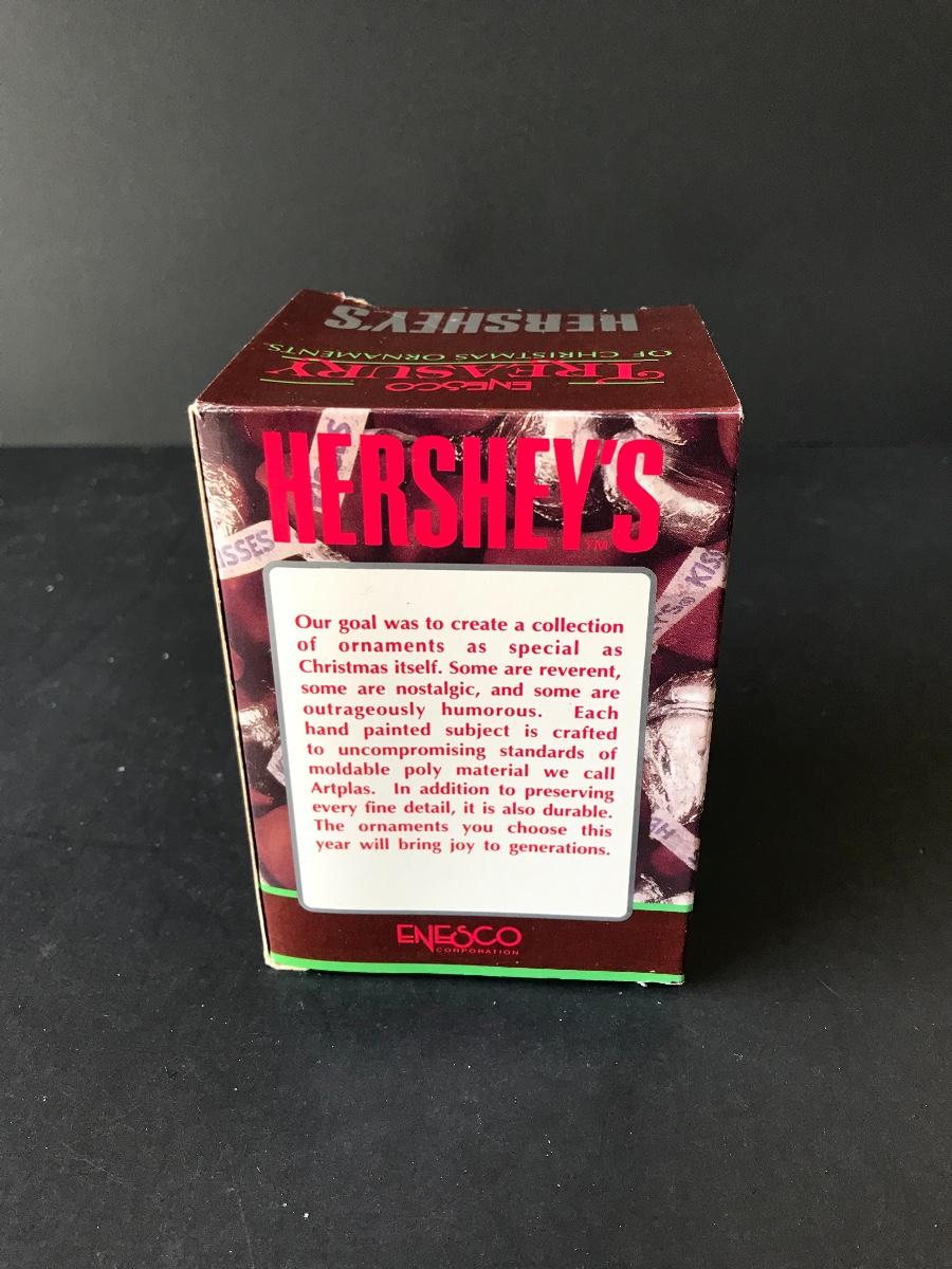 Vintage Hershey's & Baskin Robbins Christmas Ornaments By Enesco. All Holiday items in this auction are as-seen. The client collected a lot of holiday pieces and some are new in box, some were displayed once and come with original box, and some have been displayed and come with no box. They are all pre-owned in some fashion and have been stored in an attic or on shelf in library. Please see all pictures. The pictures show condition, measurements if taken, and what is included in the lot. Due to the large amount that we photograph and the time frame, we are not always able to take measurements. All items unless noted, are pre-owned and have been used. Thank you