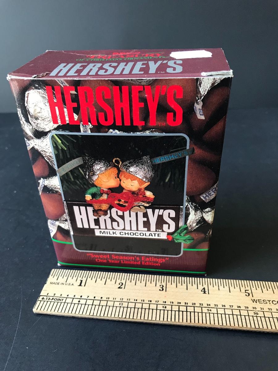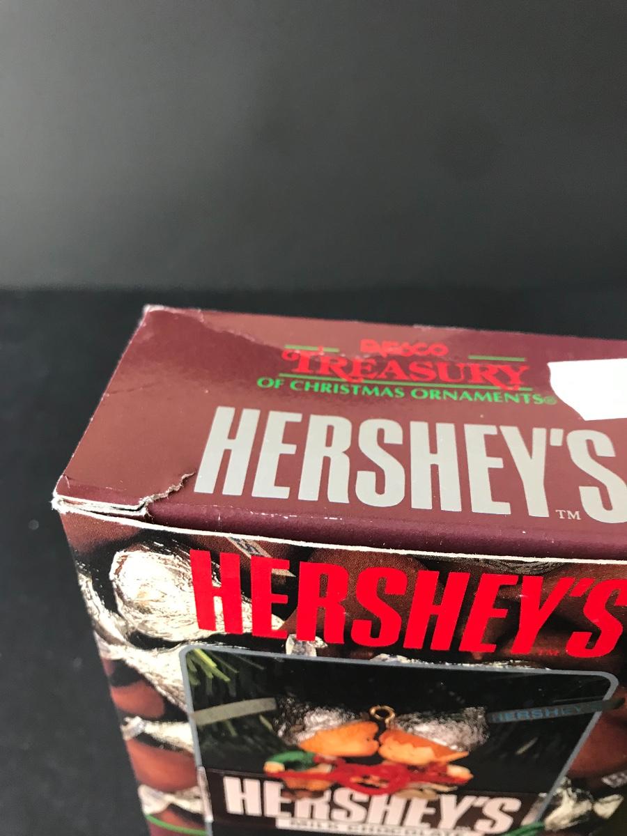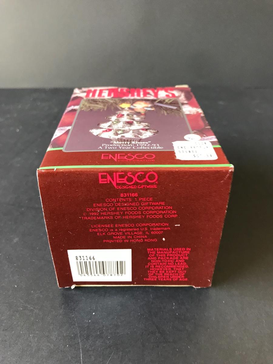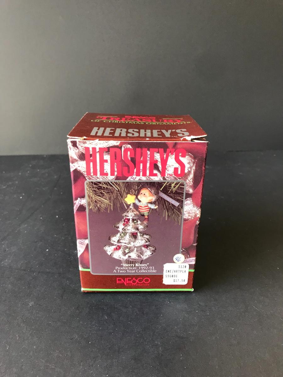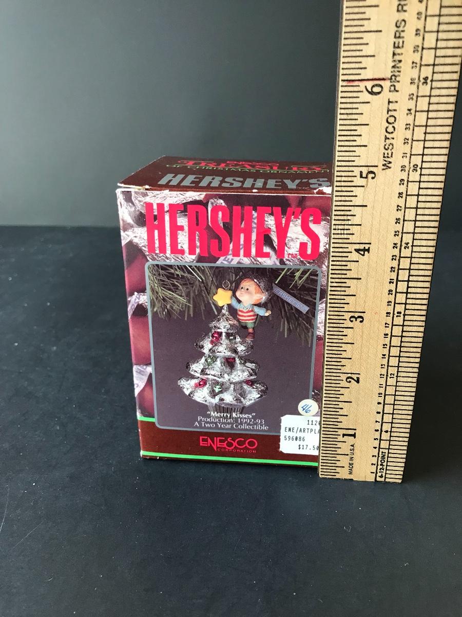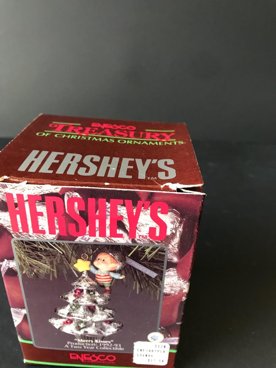 Vintage Hershey's & Baskin Robbins Christmas Ornaments By Enesco. All Holiday items in this auction are as-seen. The client collected a lot of holiday pieces and some are new in box, some were displayed once and come with original box, and some have been displayed and come with no box. They are all pre-owned in some fashion and have been stored in an attic or on shelf in library. Please see all pictures. The pictures show condition, measurements if taken, and what is included in the lot. Due to the large amount that we photograph and the time frame, we are not always able to take measurements. All items unless noted, are pre-owned and have been used. Thank you