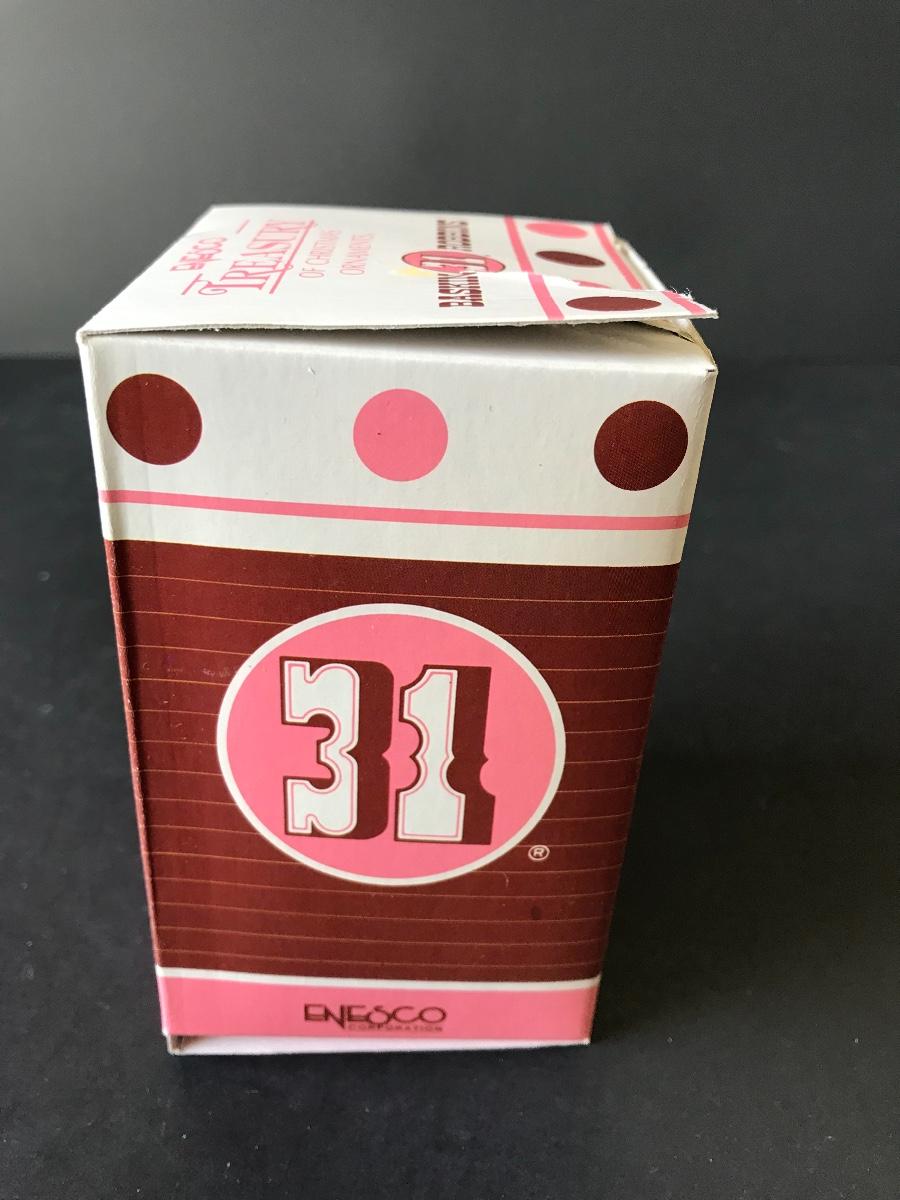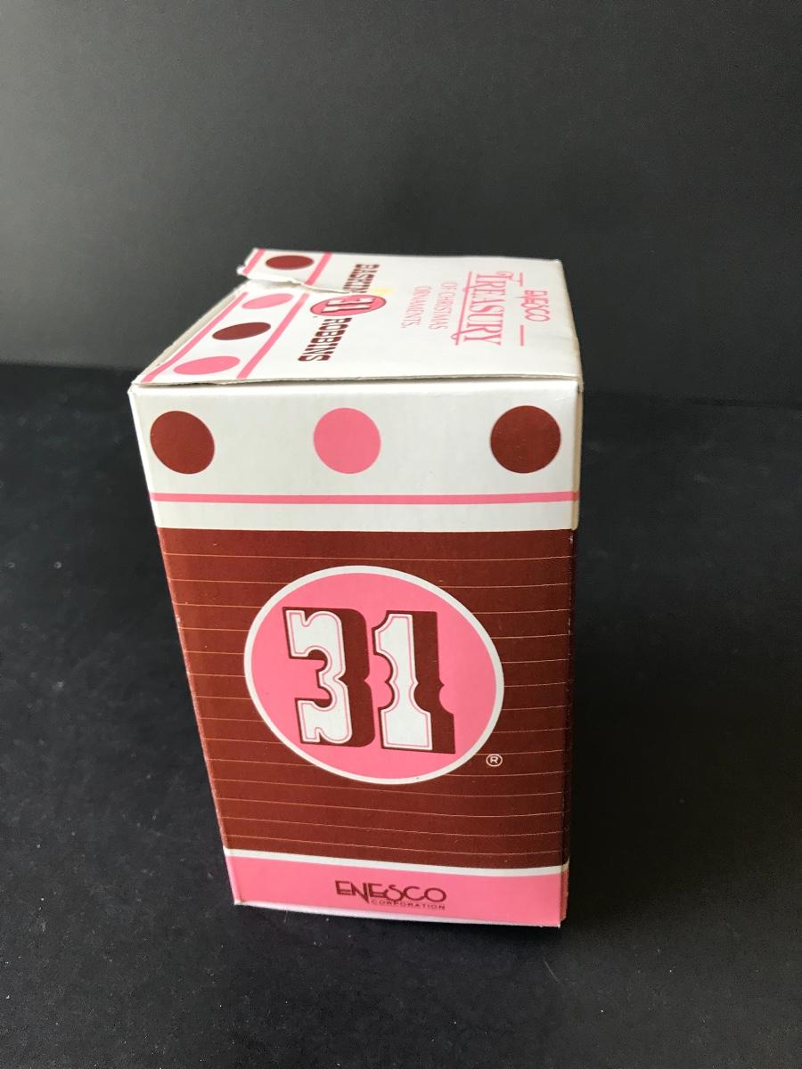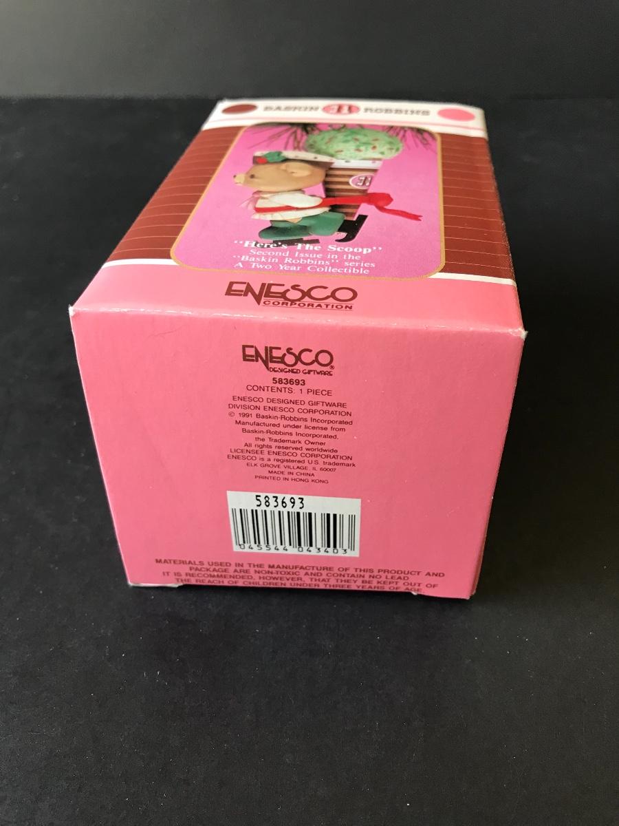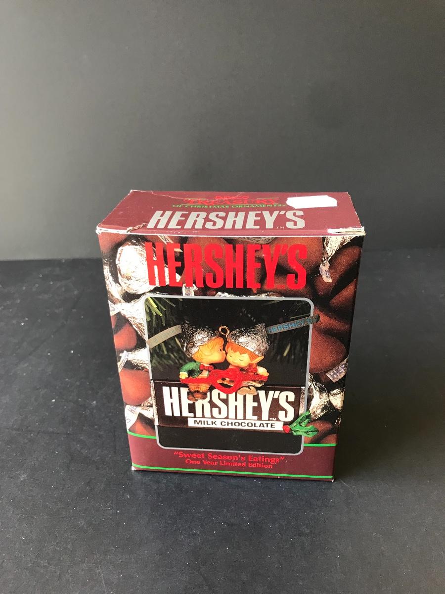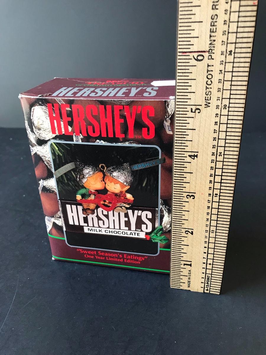 Vintage Hershey's & Baskin Robbins Christmas Ornaments By Enesco. All Holiday items in this auction are as-seen. The client collected a lot of holiday pieces and some are new in box, some were displayed once and come with original box, and some have been displayed and come with no box. They are all pre-owned in some fashion and have been stored in an attic or on shelf in library. Please see all pictures. The pictures show condition, measurements if taken, and what is included in the lot. Due to the large amount that we photograph and the time frame, we are not always able to take measurements. All items unless noted, are pre-owned and have been used. Thank you