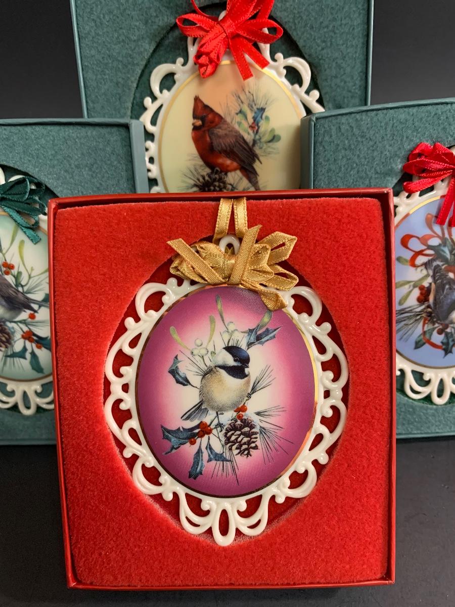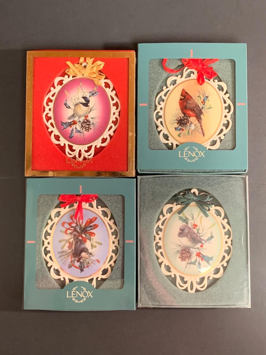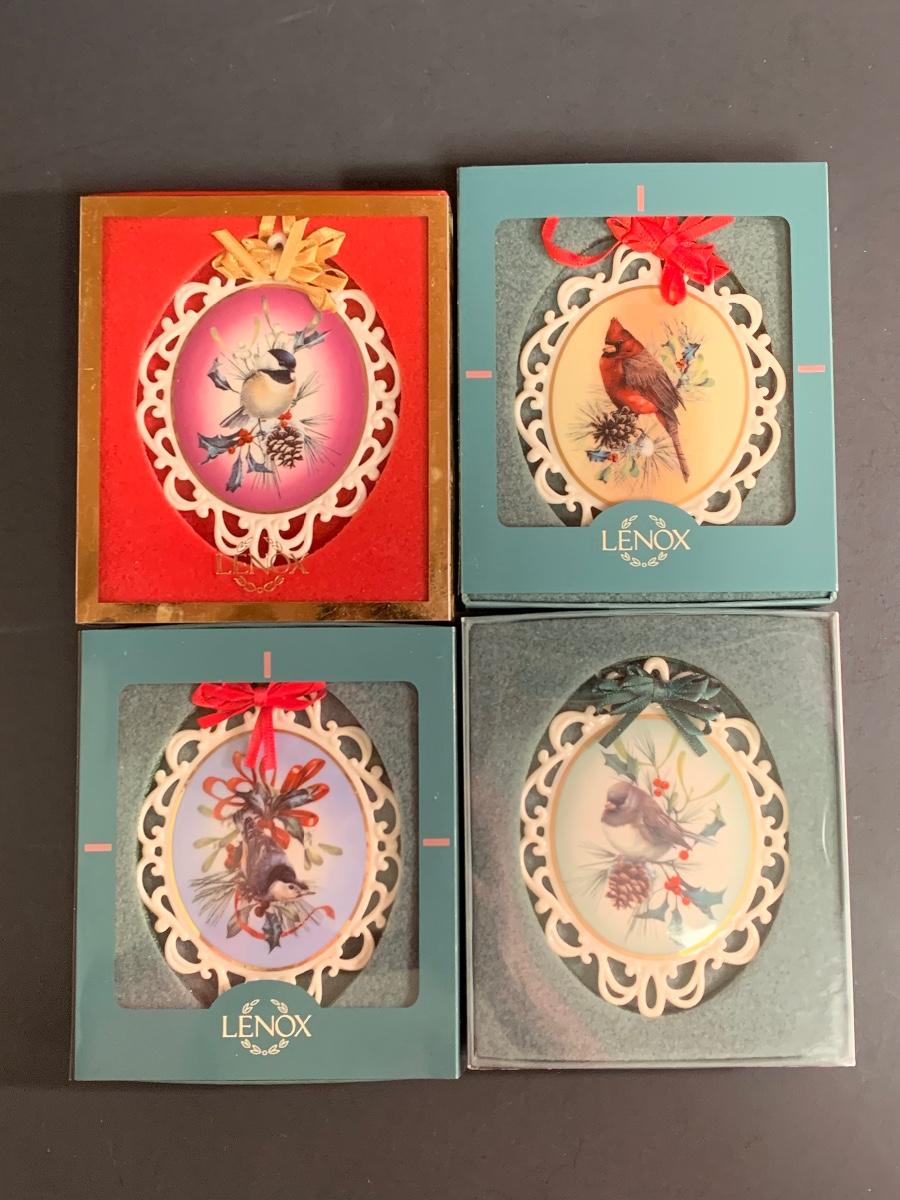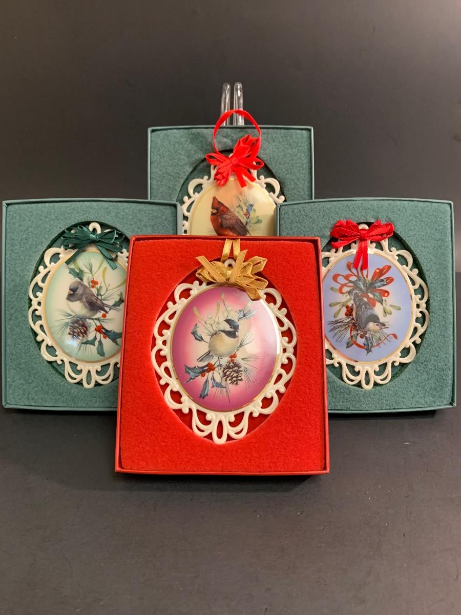 Set of 4 boxed vintage Lenox ornaments with birds.