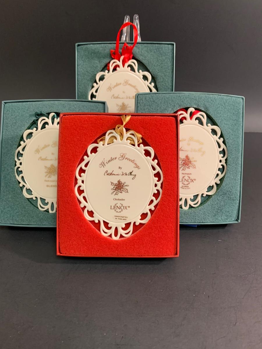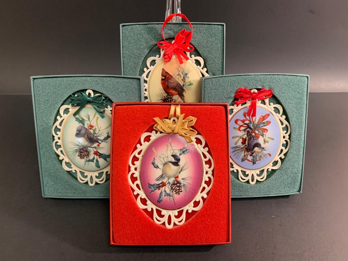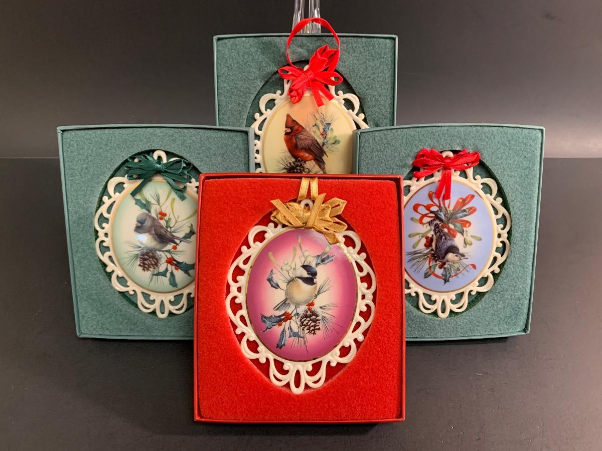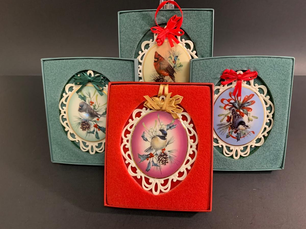 Set of 4 boxed vintage Lenox ornaments with birds.