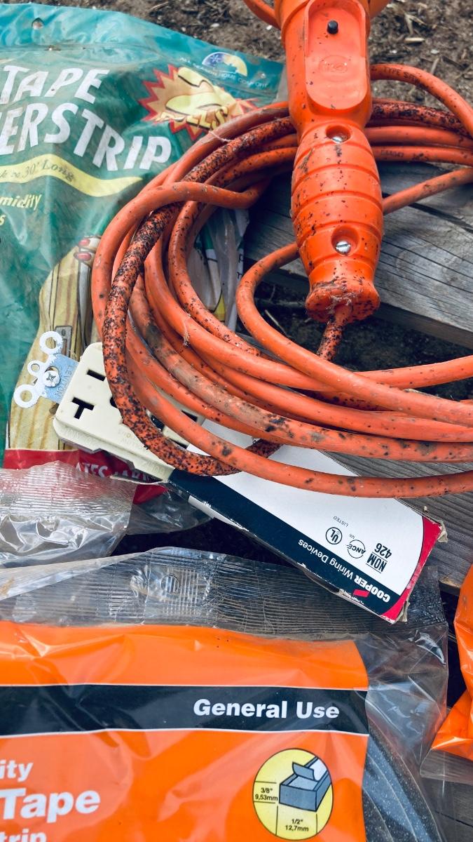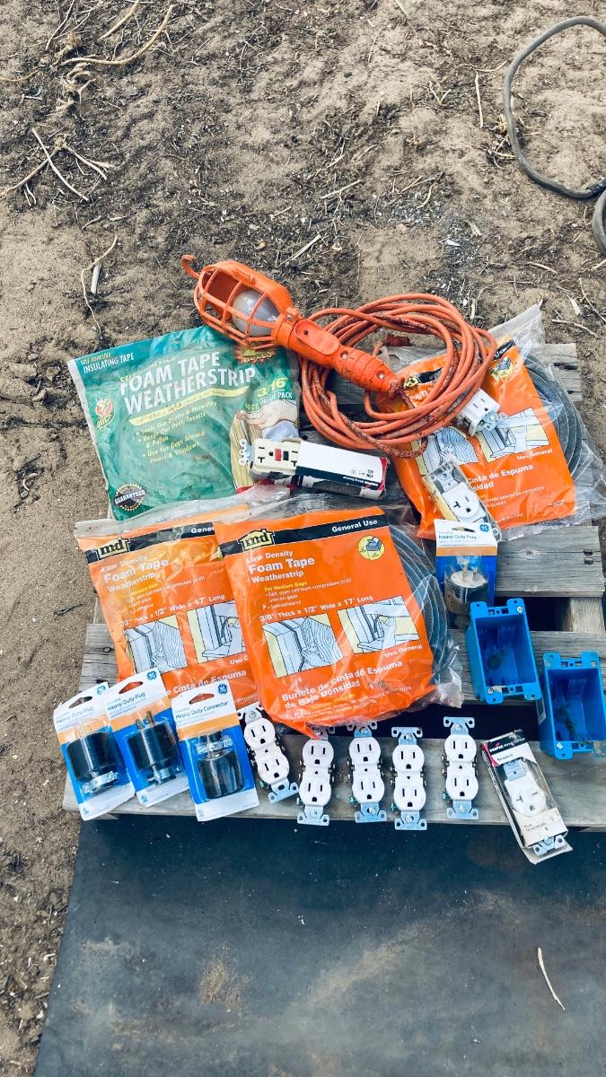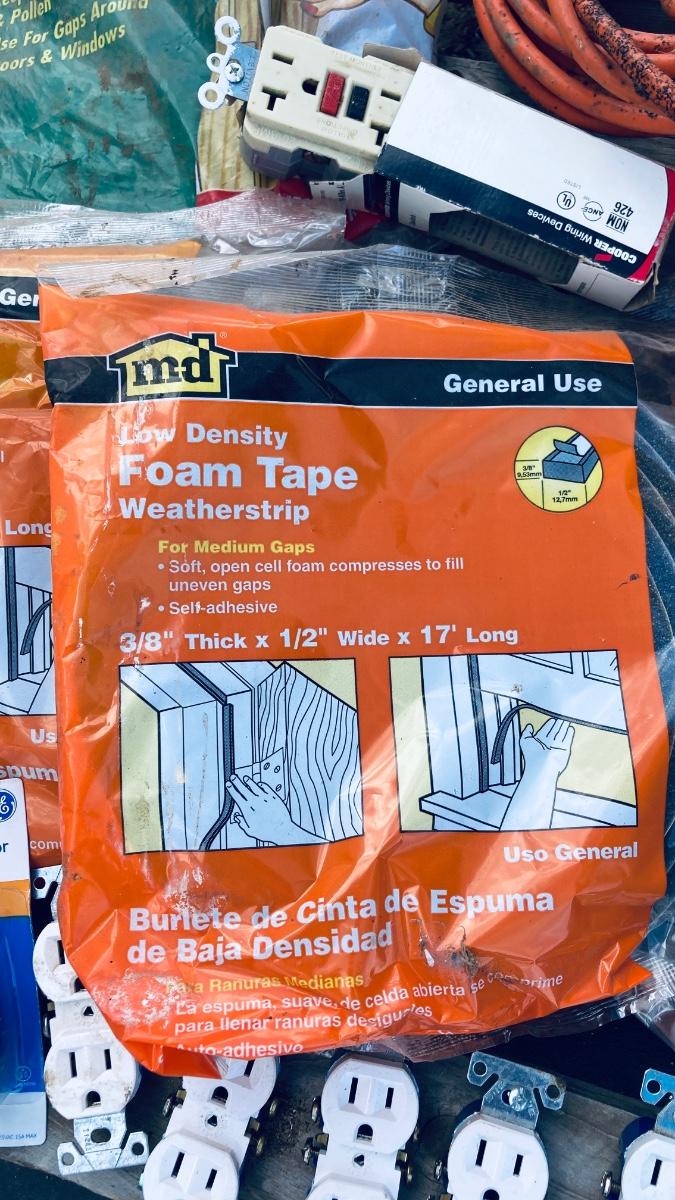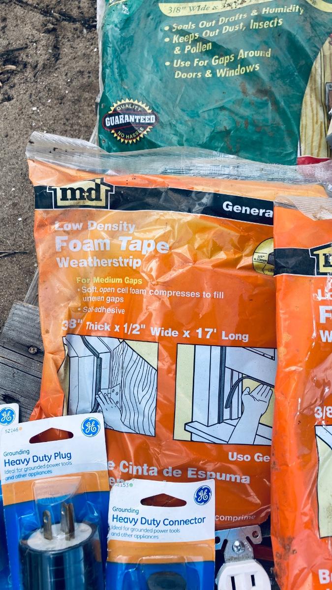 SEVERAL OTLETS, DIFFERENT SIZES OF WEATHER STRIPPING NEW IN BAGS, TREBLE LIGHT AND MORE