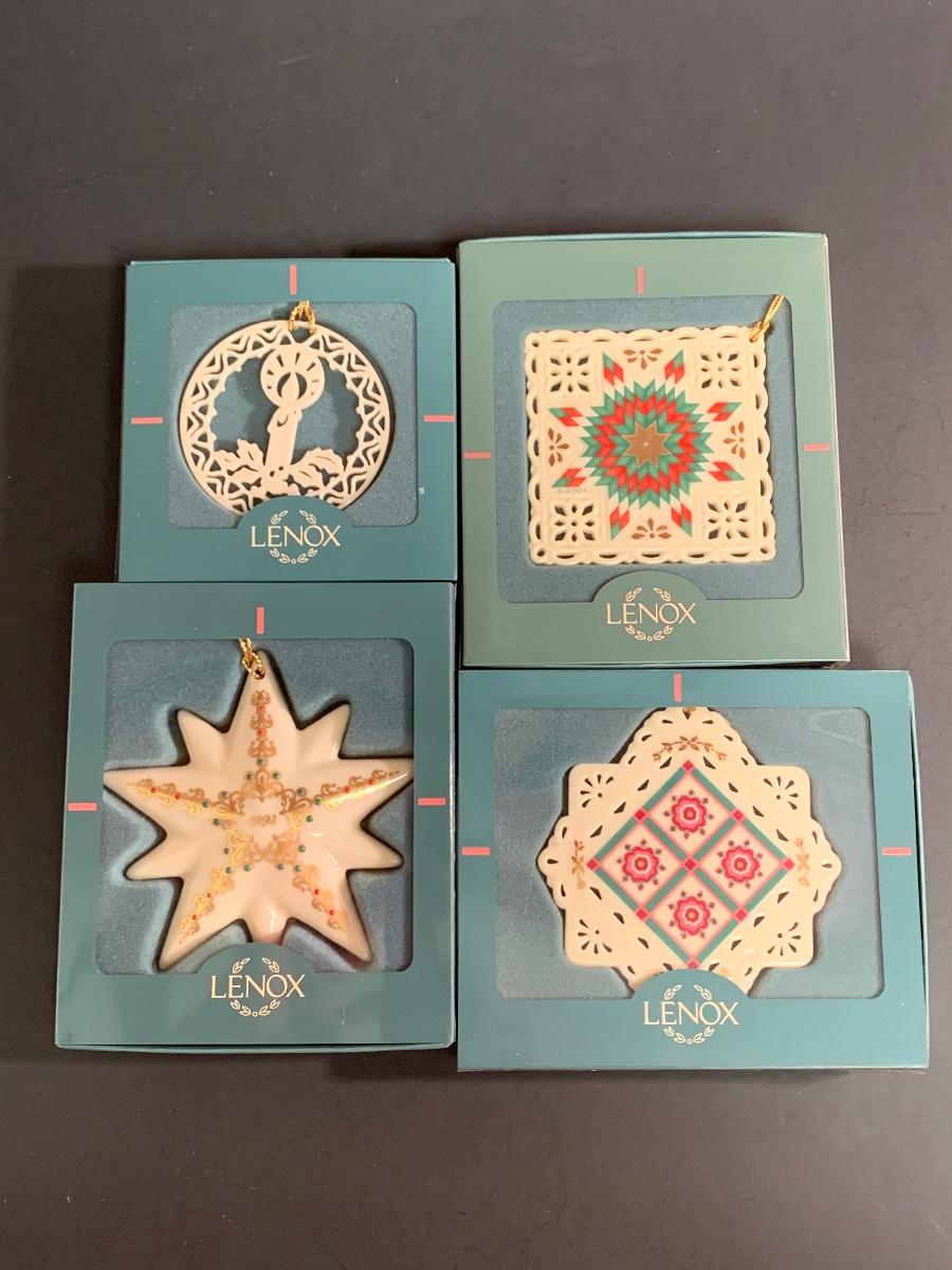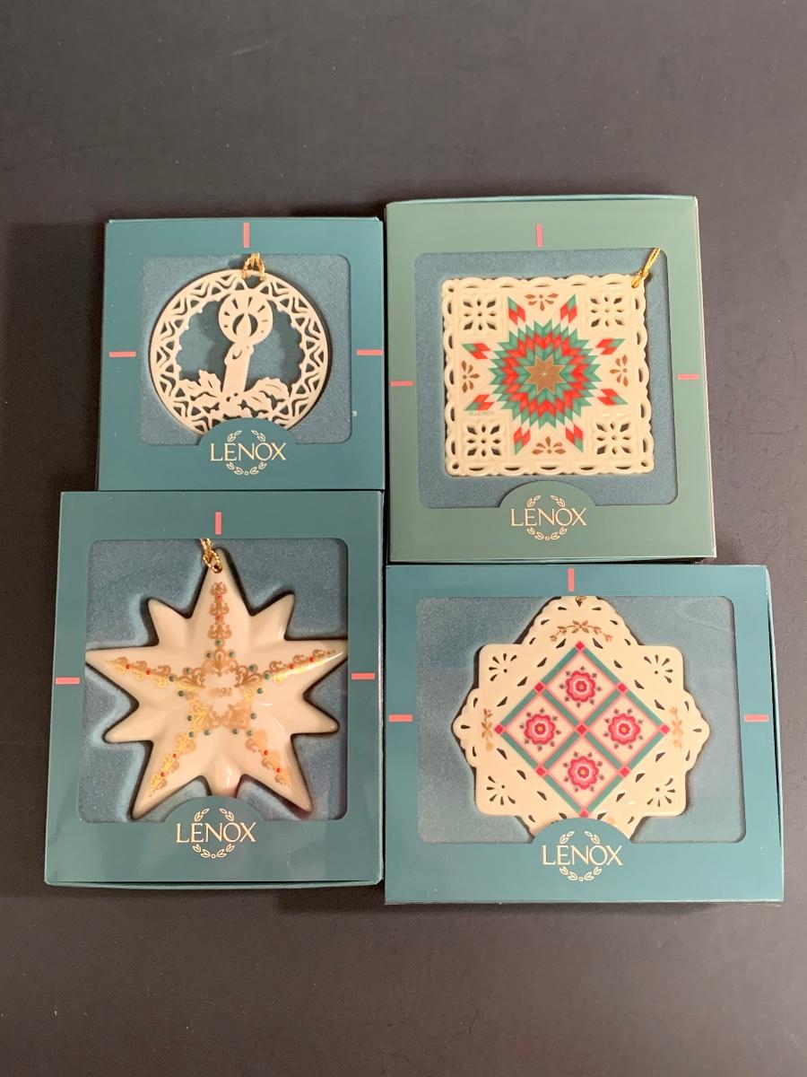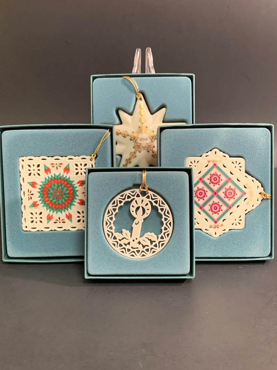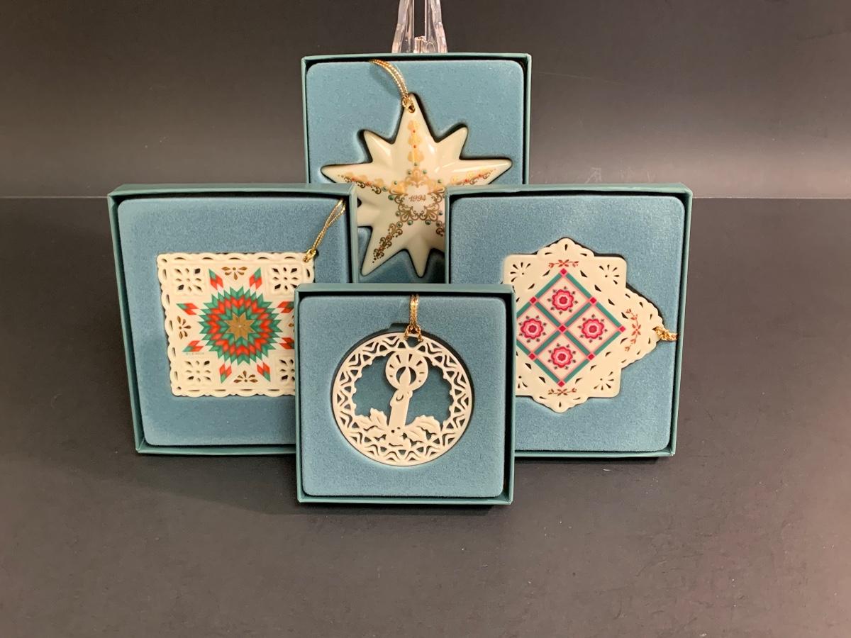 Set of 4 vintage boxed Lenox ornaments: star, candle and quilt patterns.