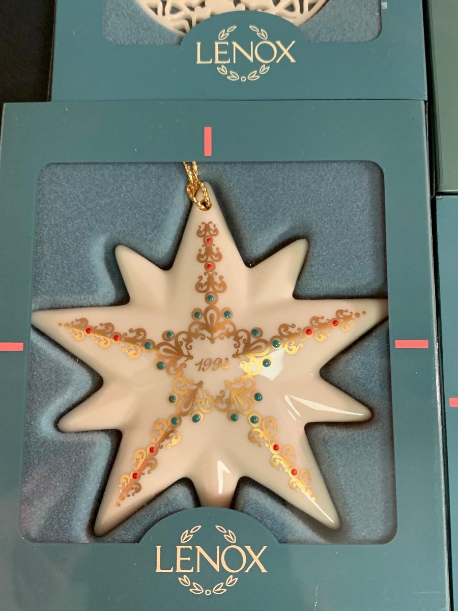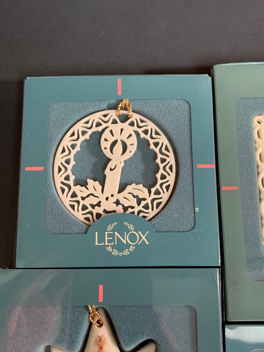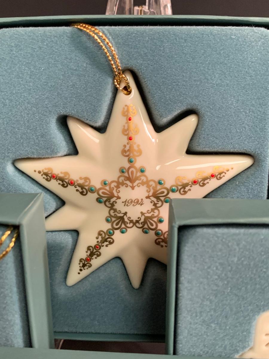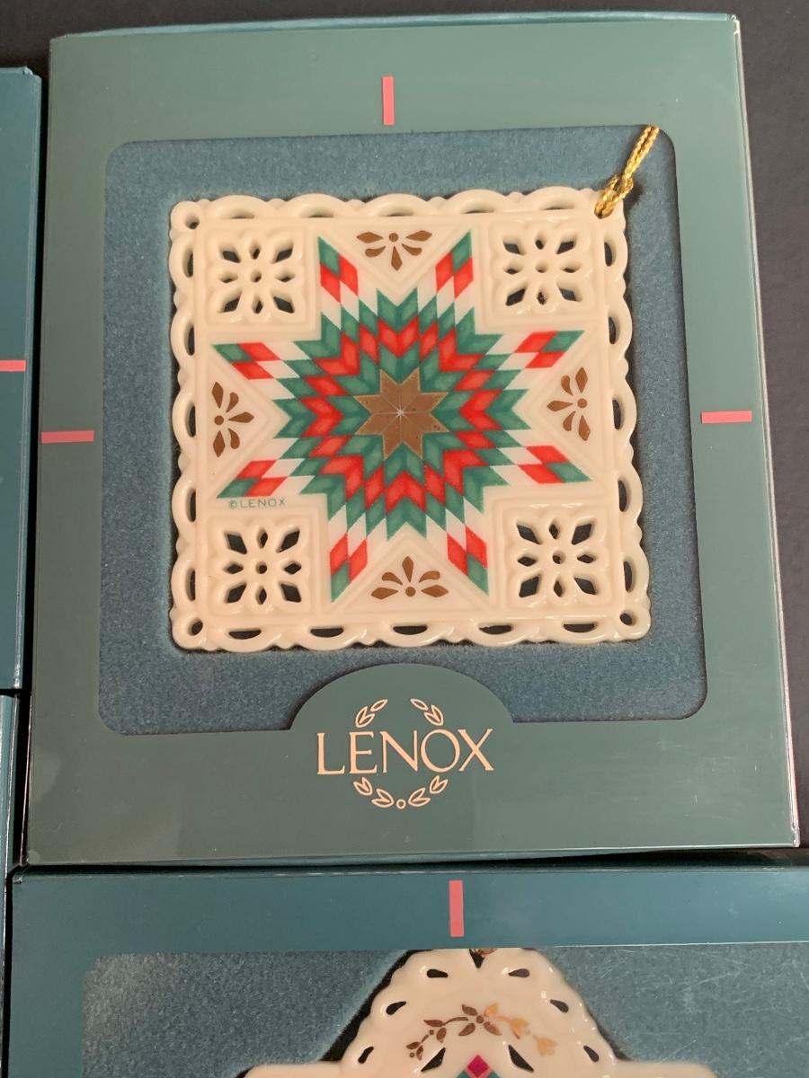 Set of 4 vintage boxed Lenox ornaments: star, candle and quilt patterns.