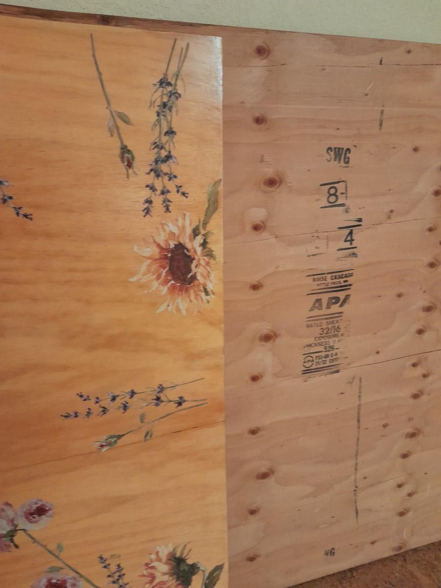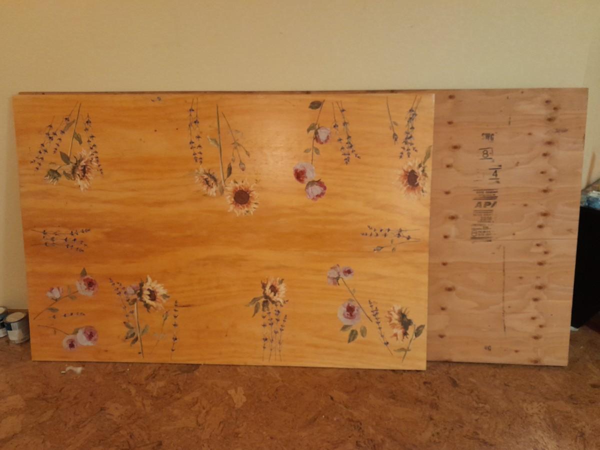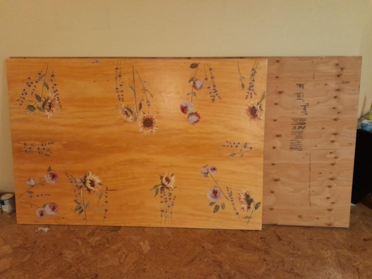 TWO PIECES OF PLYWOOD ONE 4'X8' ONE WITH HANDPAINTED FLOWERS 4' X 6'