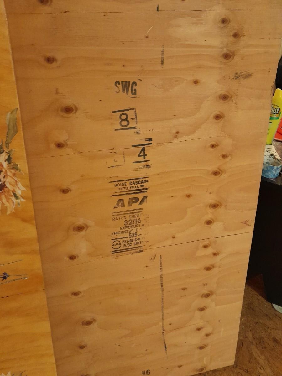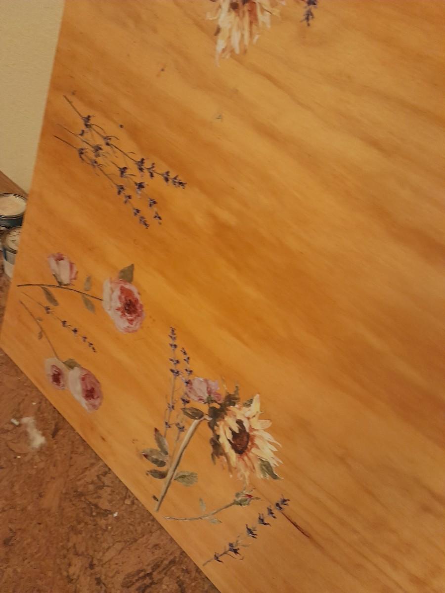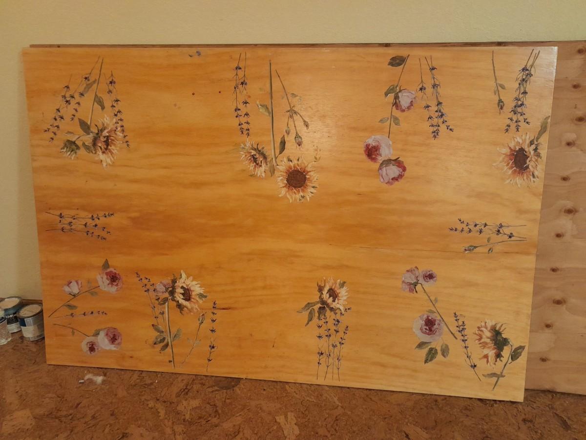 TWO PIECES OF PLYWOOD ONE 4'X8' ONE WITH HANDPAINTED FLOWERS 4' X 6'