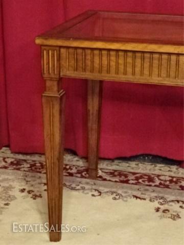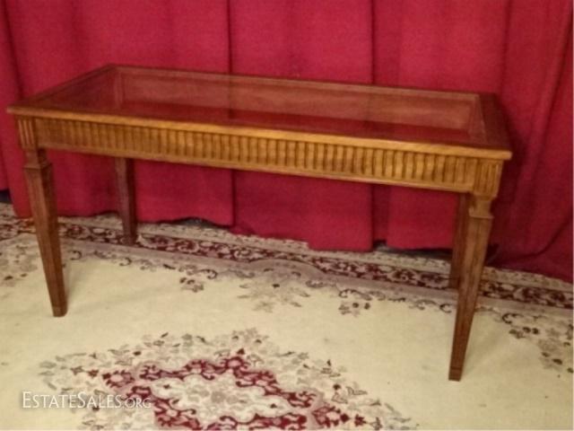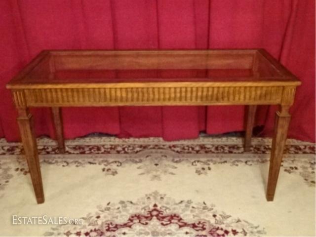 LOT 45C: NEOCLASSICAL WOOD CONSOLE TABLE, GLASS INSET TOP, FLUTED LEGS, VERY GOOD CONDITION, 48"W X 23"H X 22"D, SKU387.66