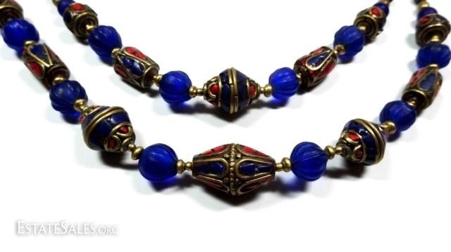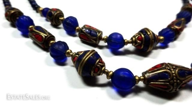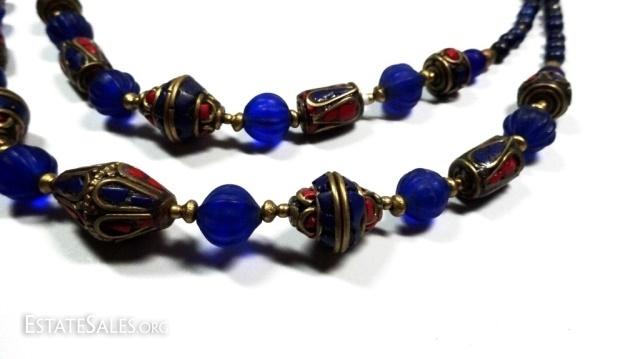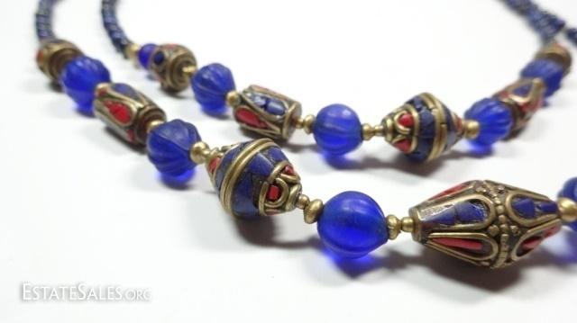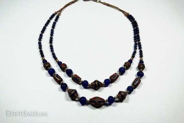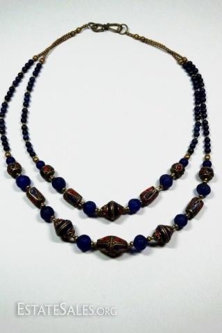 LOT 45D: TIBETAN TURQUOISE, LAPIS & BLUE GLASS BEAD DOUBLE STRAND NECKLACE, BRASS ACCENTS, APPROX 18"L, SKU321.106