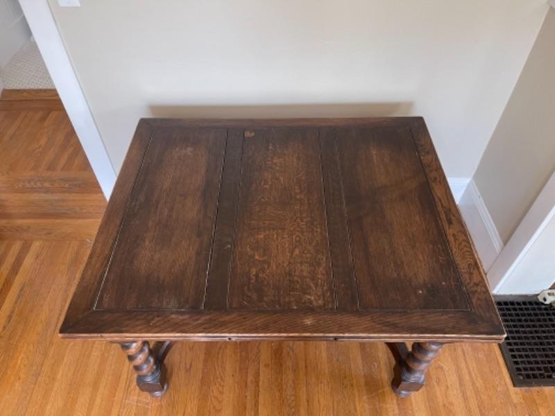 Lot 45LD. Dark oak dining table, closed 50-1/2”; opened 90-1/2”--$137.50