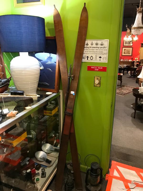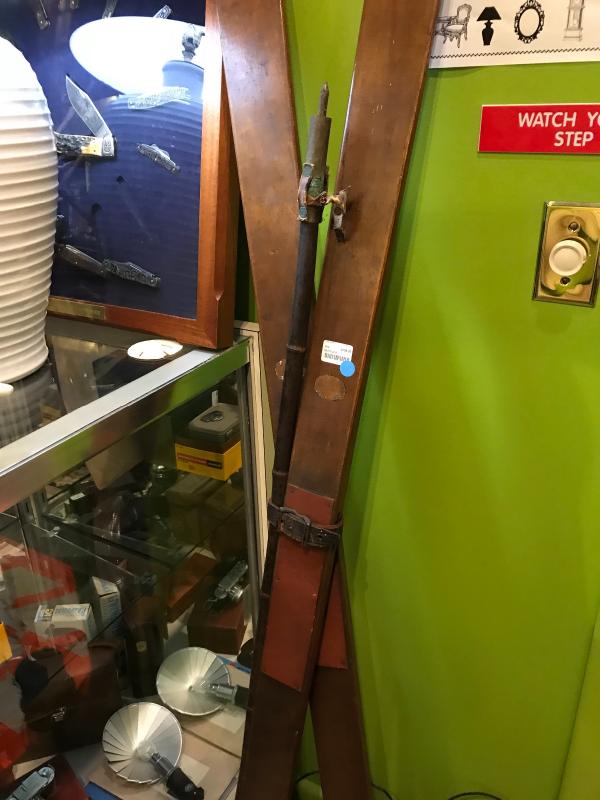 Very nice pair of antique wood skiis with original bamboo pole with brass spike. Original leather strap. 17" x 3 1/2" skiis. 55" pole.