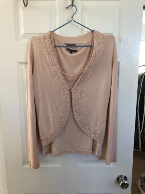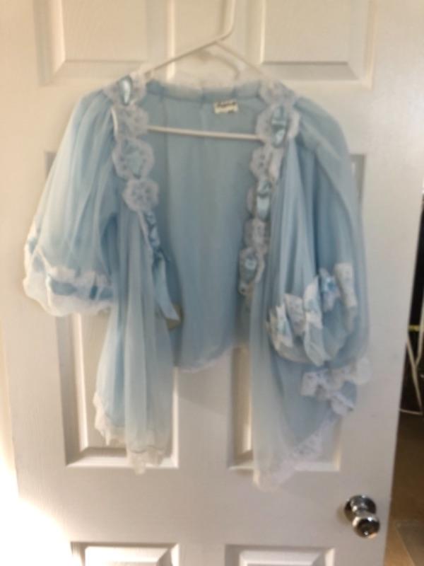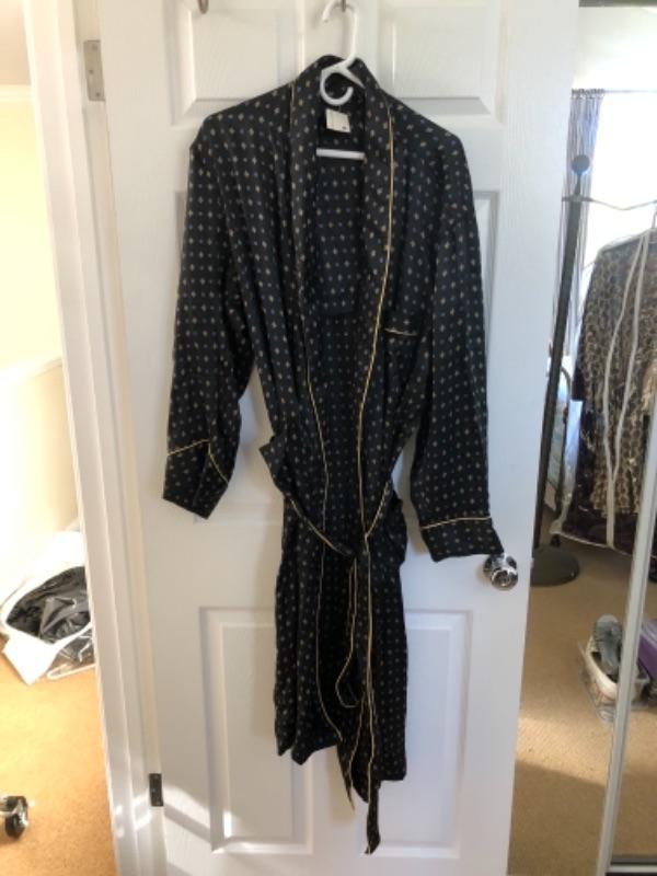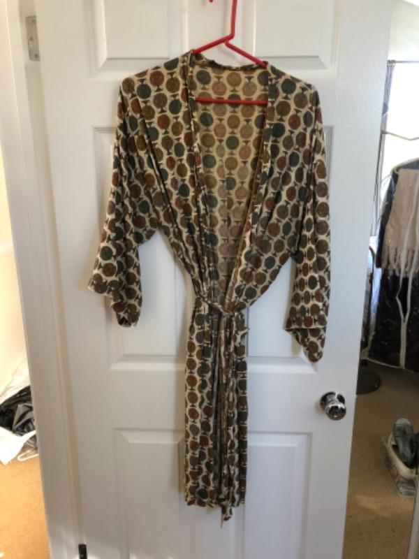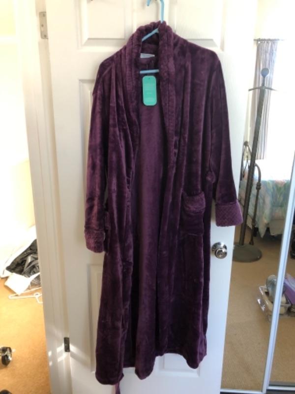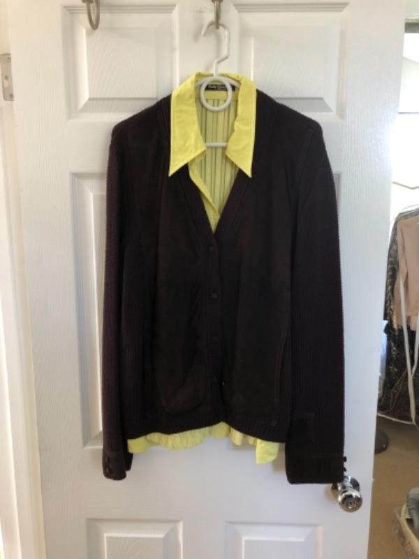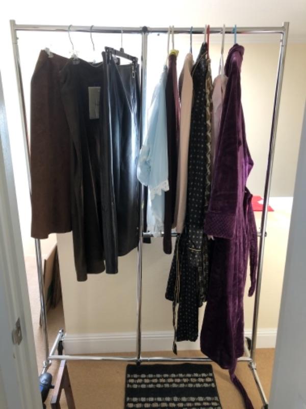 Lot 45U. Three leather skirts (Size 16), 1 sweater set, 1 leather and knit sweater with silk blouse, 1 plush robe (new), 1 silk robe (new),1 bed jacket, chiffon vintage, 1 bed jacket new faux fur--$175
