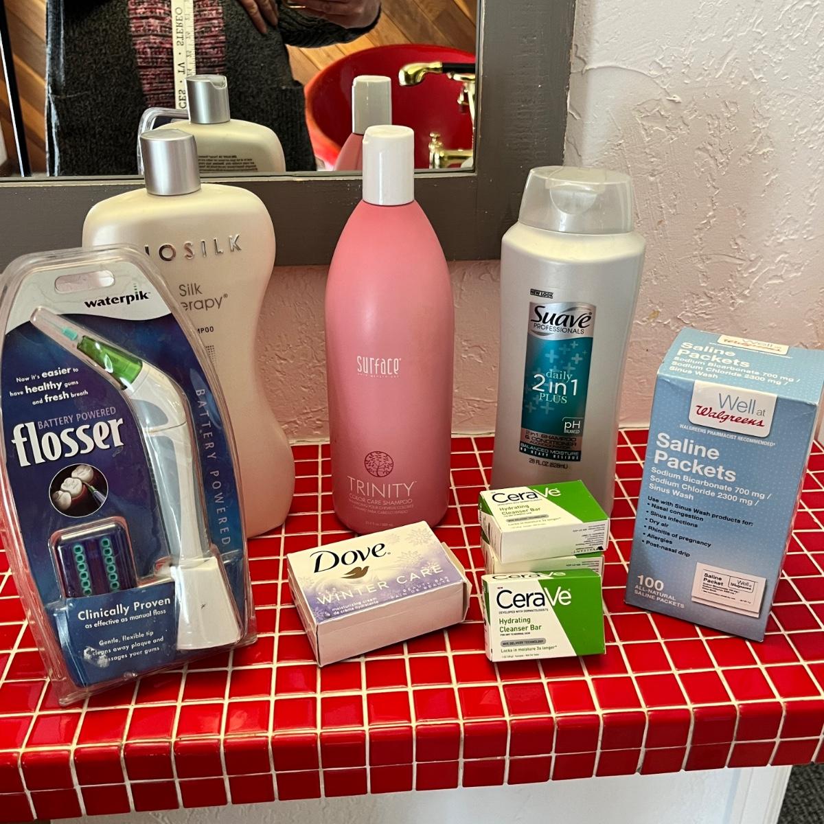 Lot 46 Misc personal care cerave soap bars, shampoos, saline packets, flosser (new in package)