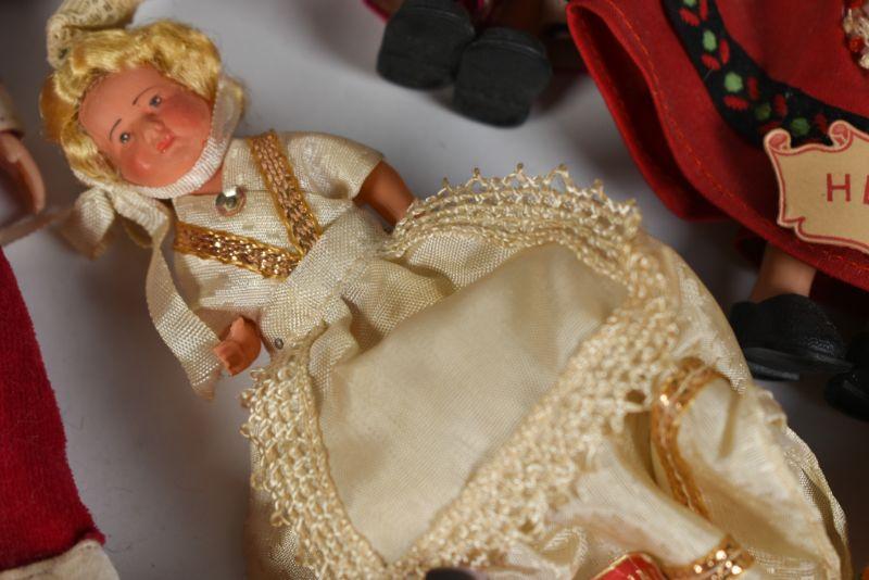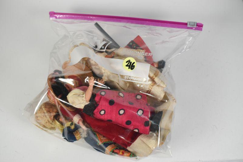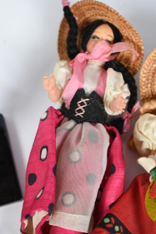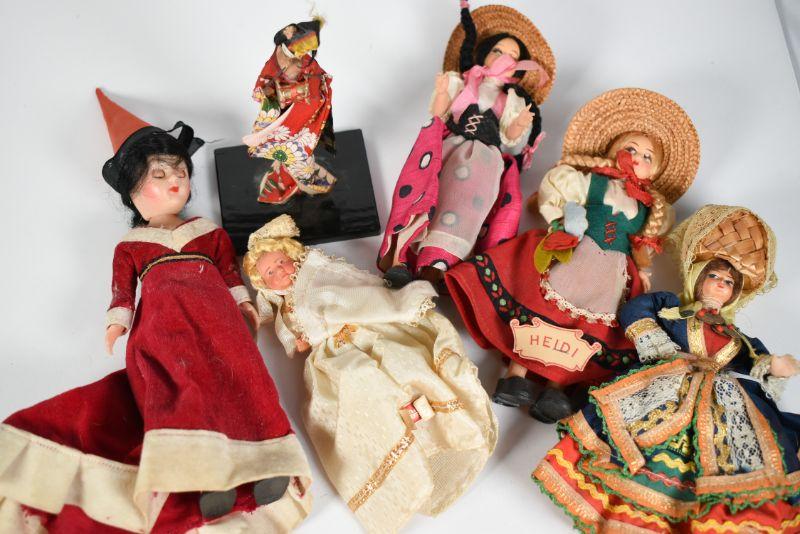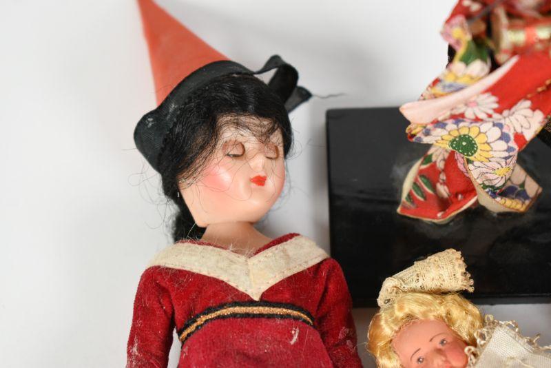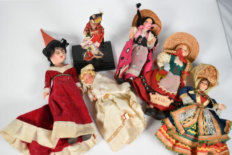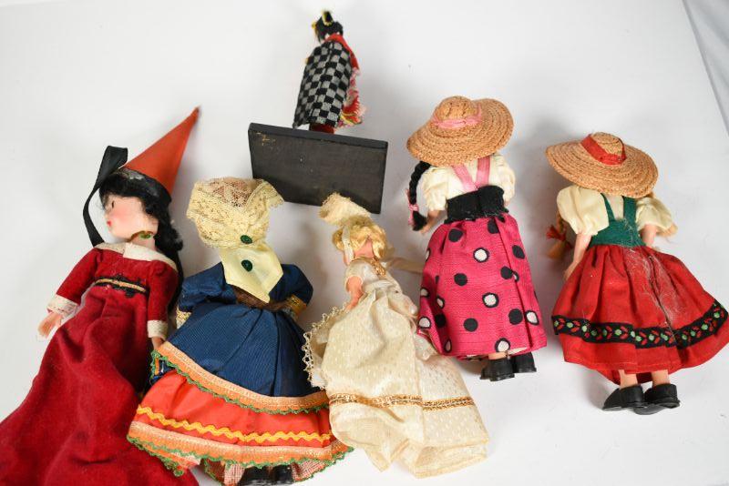 6 antique dolls; one with stand. **Please read Terms and Conditions before placing a bid. Pick up is Sunday, December 22 from 11am to 3pm or Monday, December 23 from 4pm-7pm in Mantua, NJ. All sales are final. All sales are as is, where is. Please review all photos. Props are not included. Measurements are approximate.