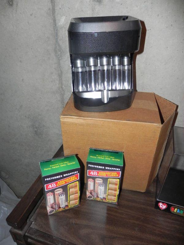 NEW BATTERY OPERATED COIN COUNTER & SORTER MACHINE, 2 BOXES OF COIN WRAPPERS AND 3 PLASTIC DISPLAY BOXES FOR YOUR SMALLER TREASURES