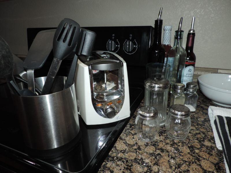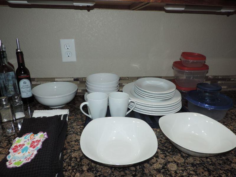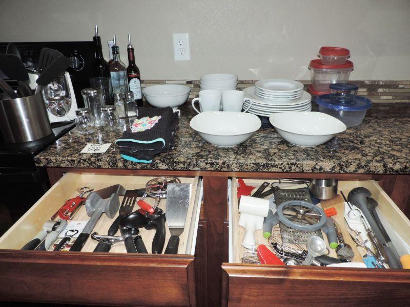 2 DRAWERS OF KITCHEN UTENSILS AND STAINLESS STEEL HOLDER, INCOMPLETE DINNERWARE SET, FEW FOOD STORAGE CONTAINERS, TOASTER, SALT & PEPPER SHAKERS AND MORE