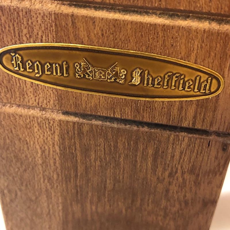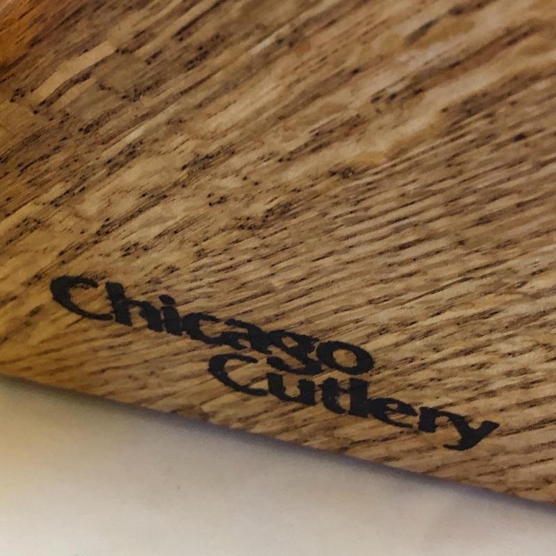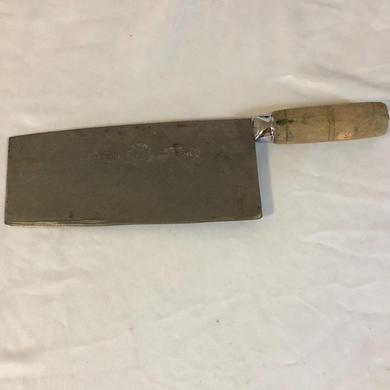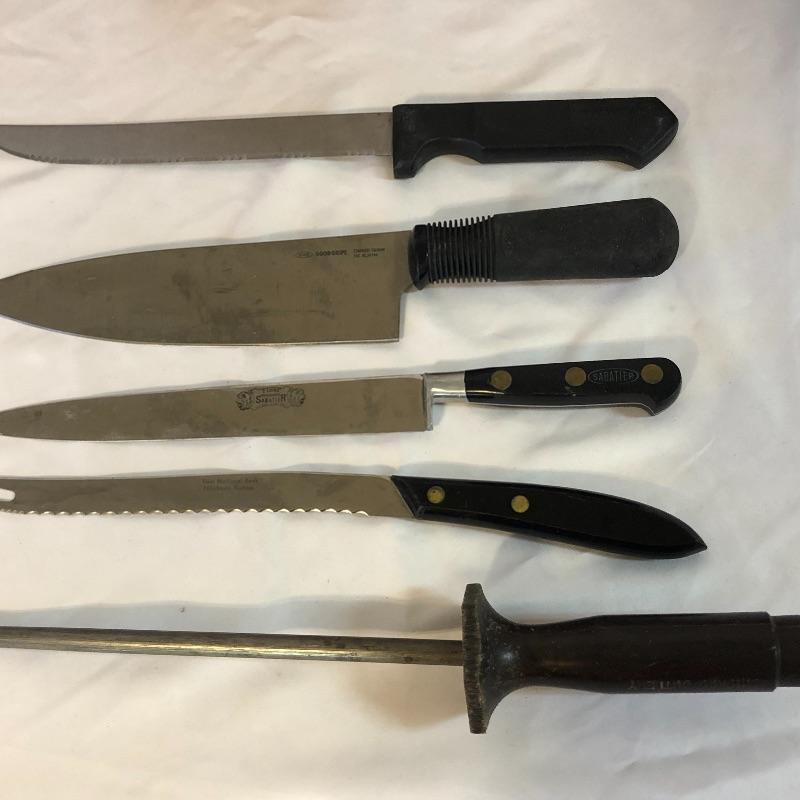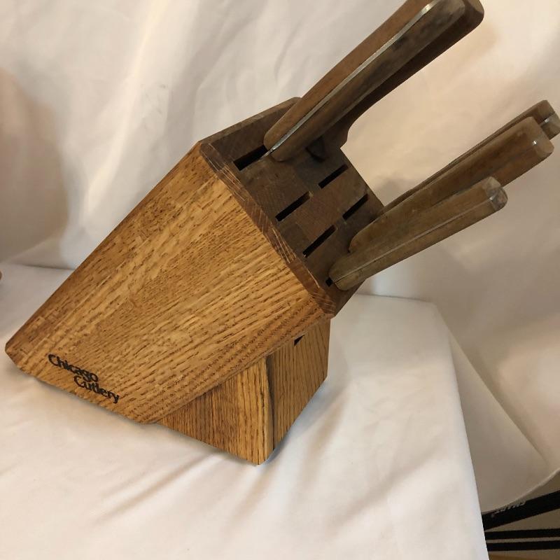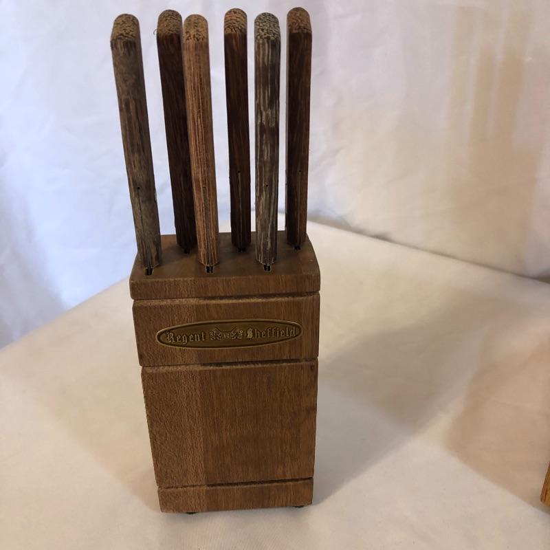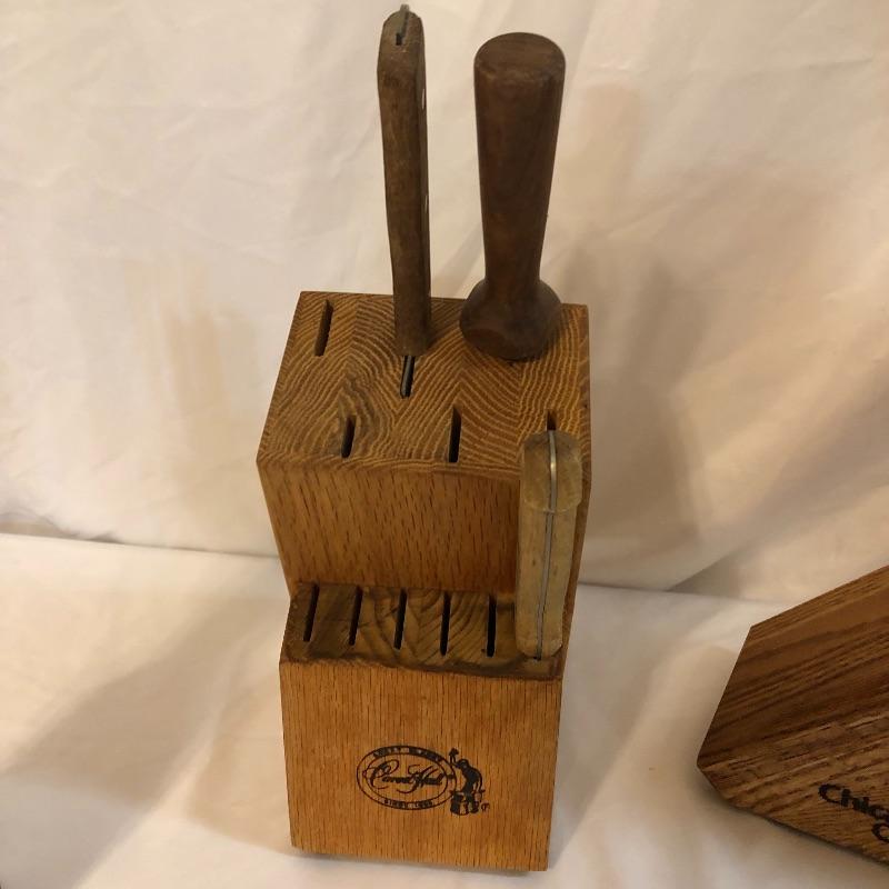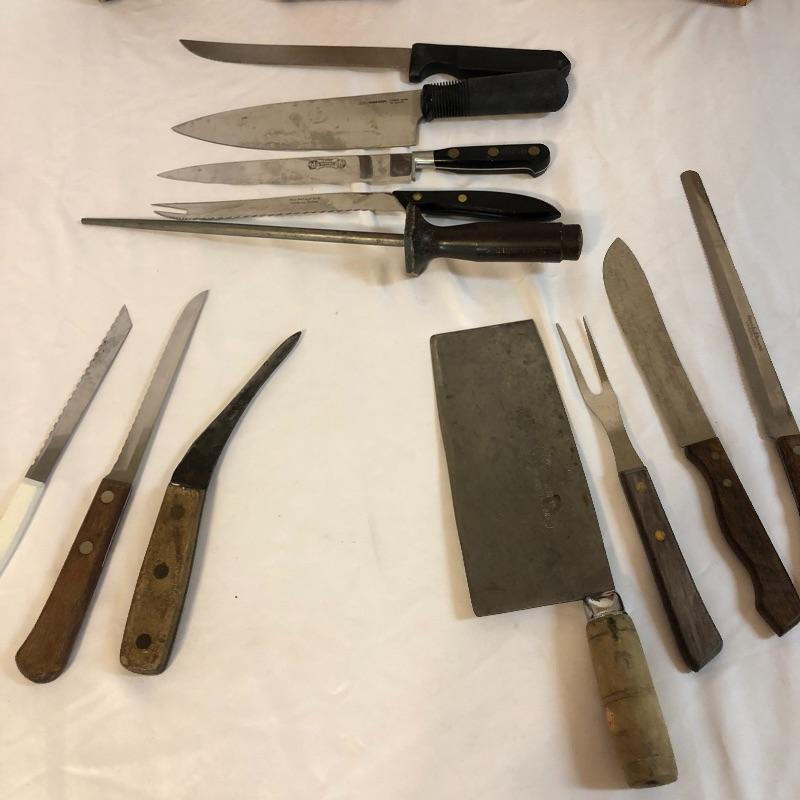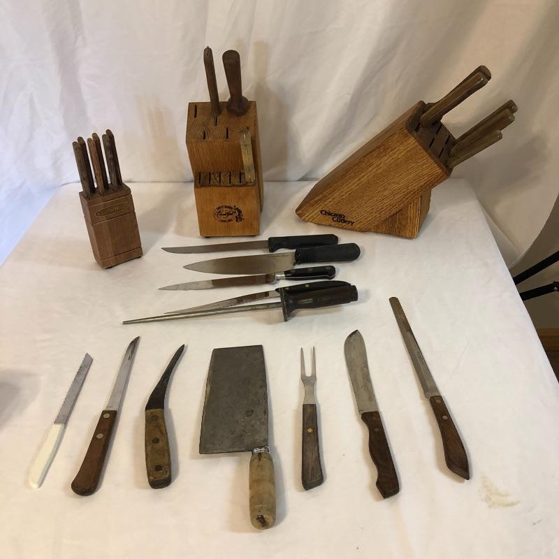 Lot includes Chicago cutlery knife holder, Regent and Sheffield knife holder and Carver Hall. Chicago cutlery Includes four Chicago cutlery knives and sharpener. Lot also includes steel three name brand meat cleaver and another knife sharpener. There are nine additional knives and one serving fork. Shipping available.