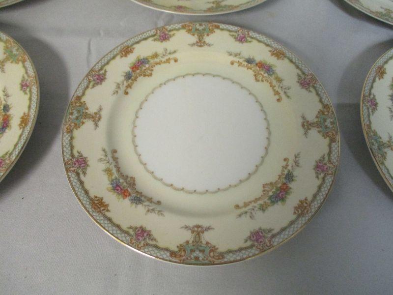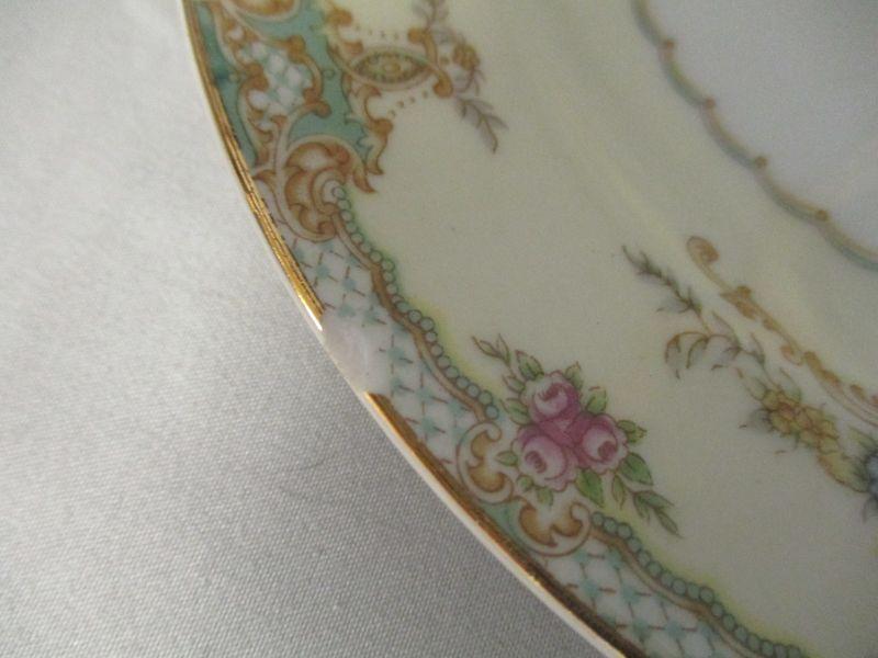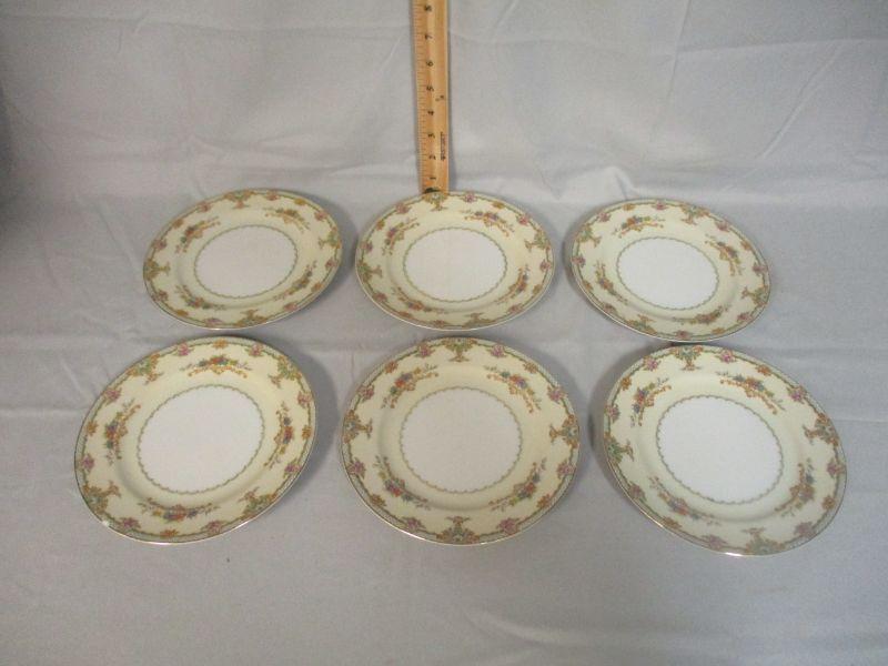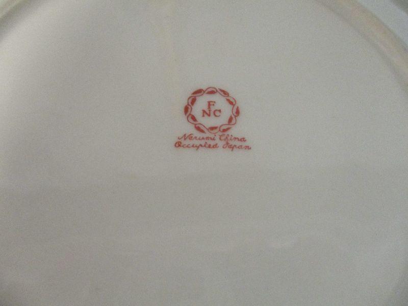 The plates are marked "FNC Narumi China Occupied Japan" and all are in excellent condition except for one that has a pea size chip along the rim. They are 7.5" in diameter.