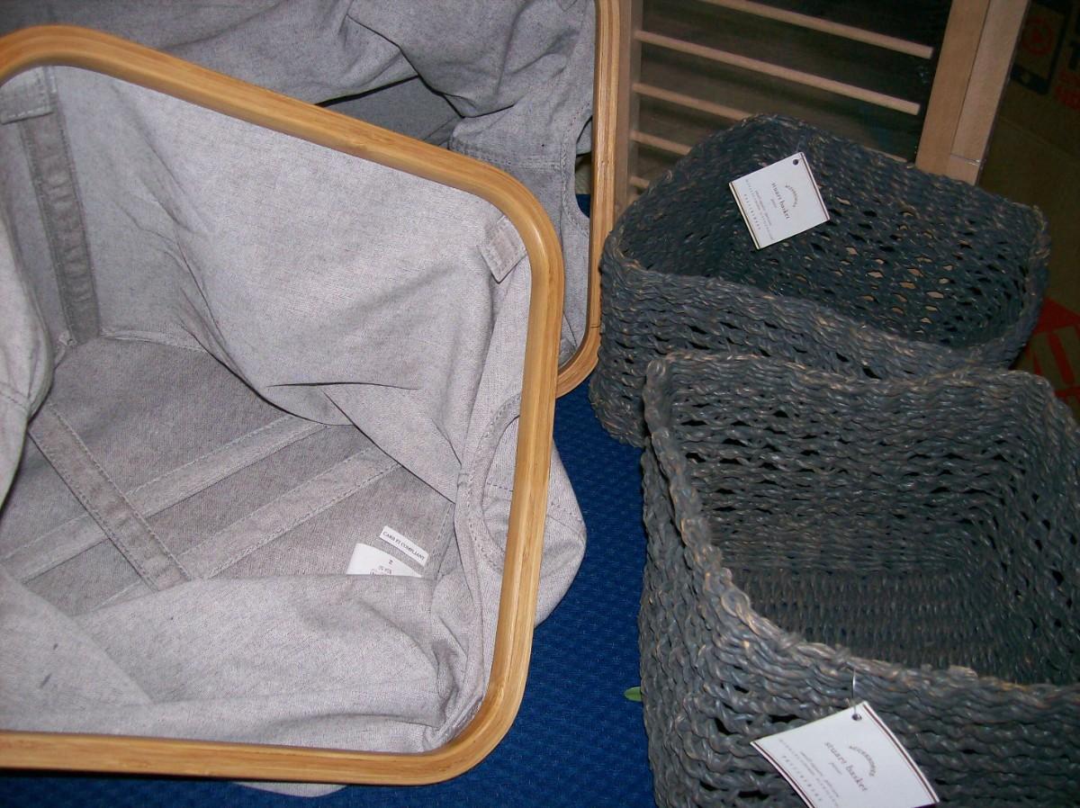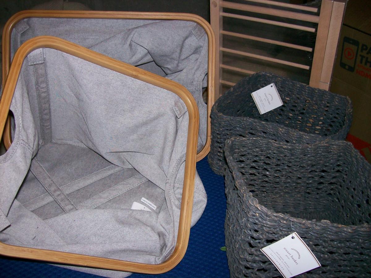 TWO LINEN BASKETS WITH WOODEN RIMS THAT FOLD-FLAT FOR STORING AND THEY MEASURE 18X14", THE BASKETS ARE NEW