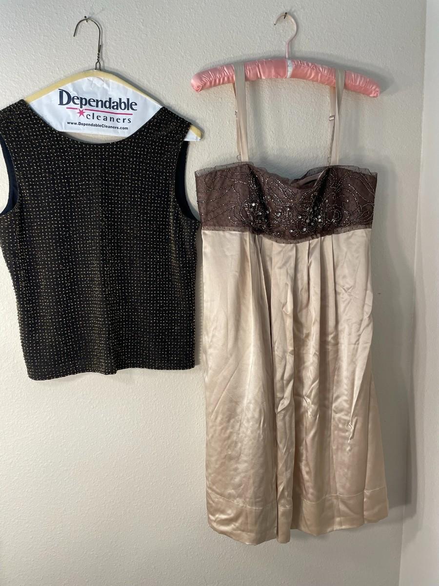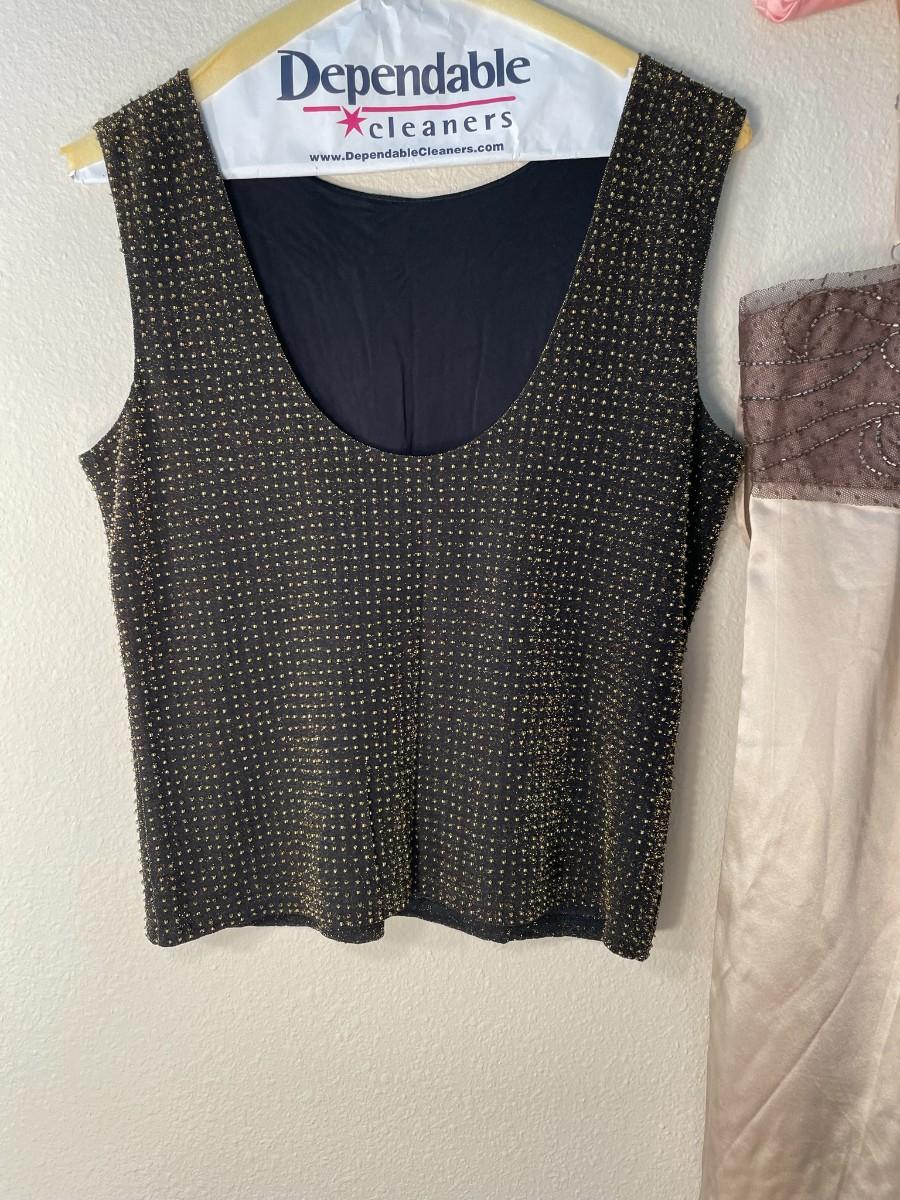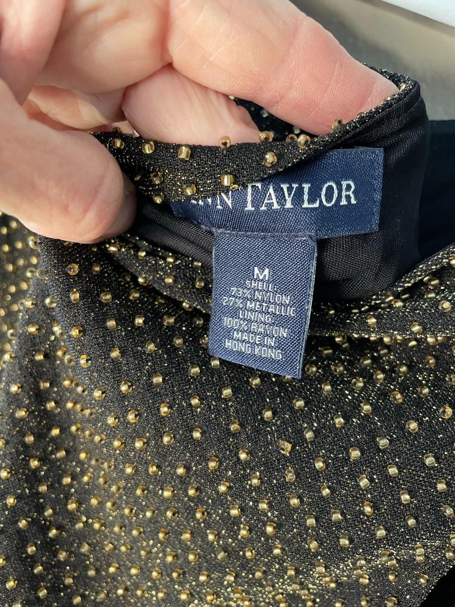 Ann Taylor medium, beaded top. 73% nylon & 27% metallic.