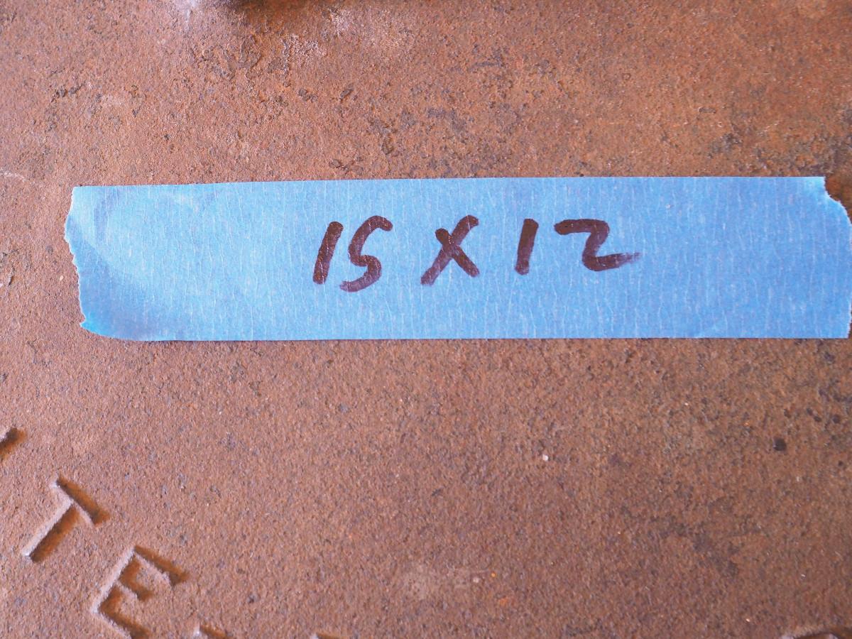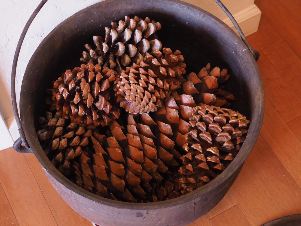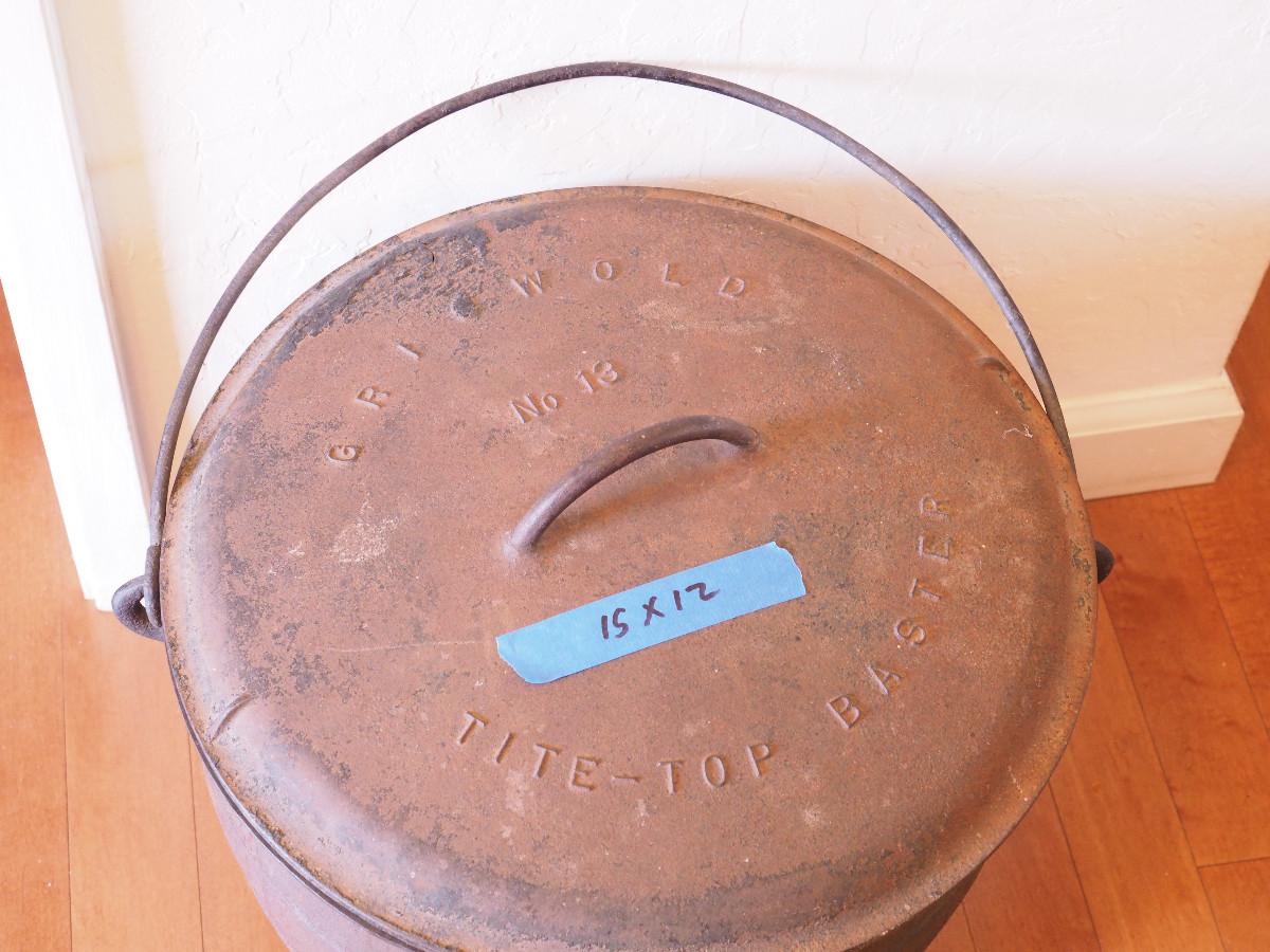 Lot 46 VERY RARE Antique Griswold caldron with Cross logo and Erie PA logo. Filled with pine cones, has heat rings inside lid, One crack in lid. Cast iron, very unusual No 15, could be refinished or display as is.