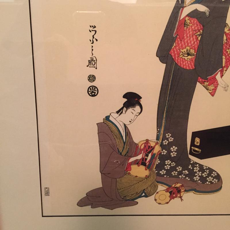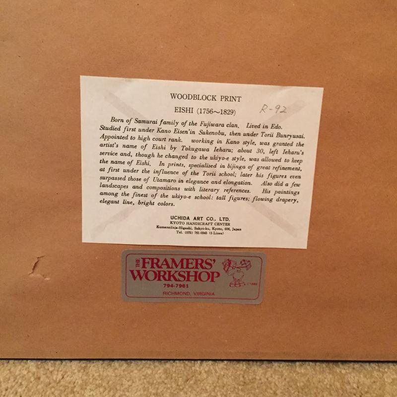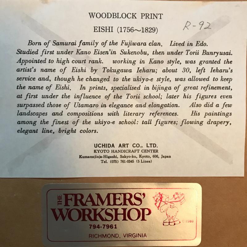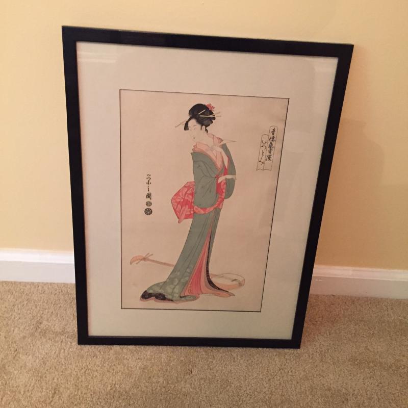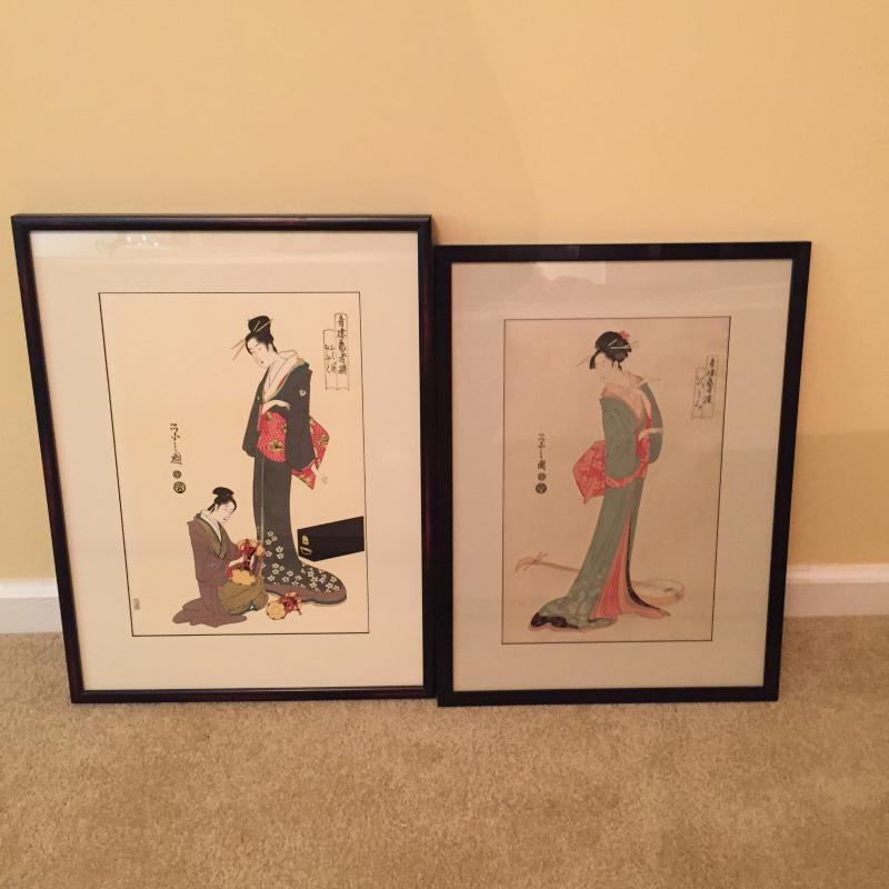 Two framed Japanese Wood Block Prints to add to your collection. These Geishas are lovely and were purchased at auction.. One has paperwork attached that says it is a wood block and that artist is Eishi. Both have similar signatures on art. Can not verify if authentic wood block. Matching Frames. One is slightly larger than the other. Largest Measures 17”x22.5”. Shipping is available but can be costly so please check with UPS for quote prior to bidding