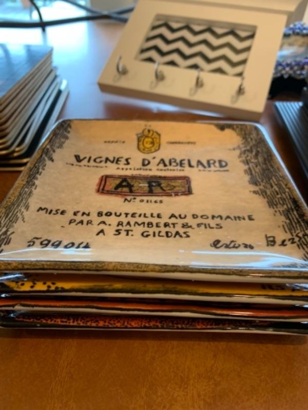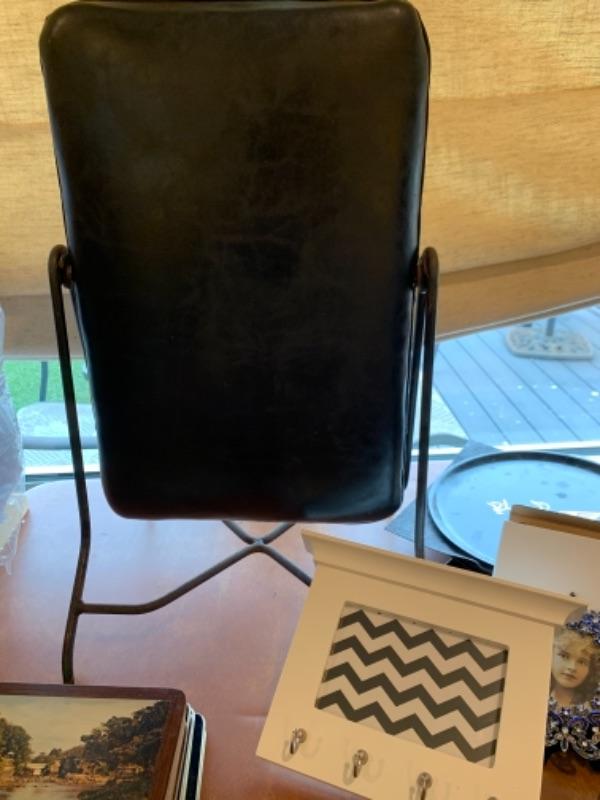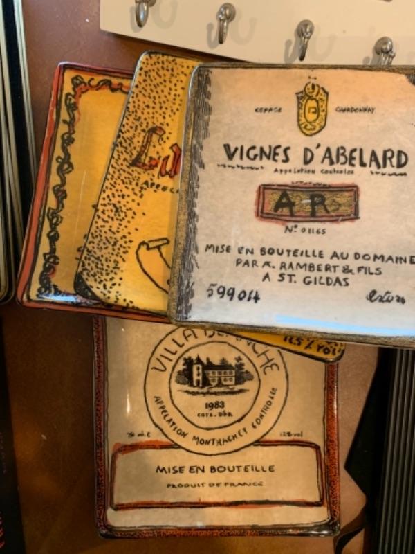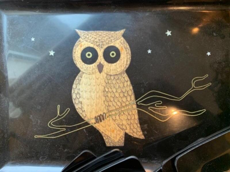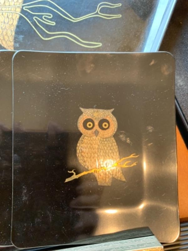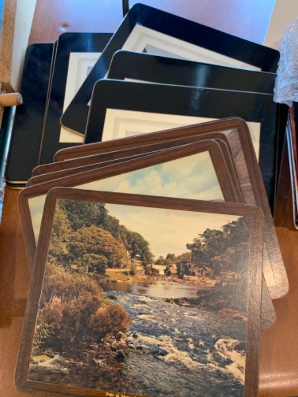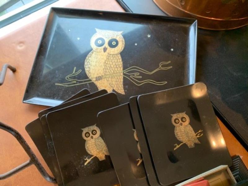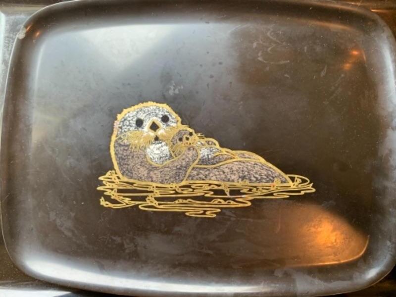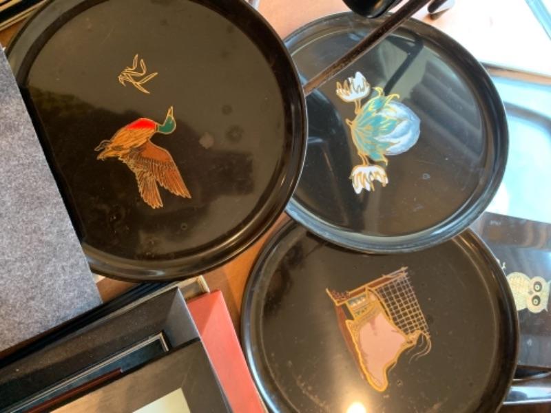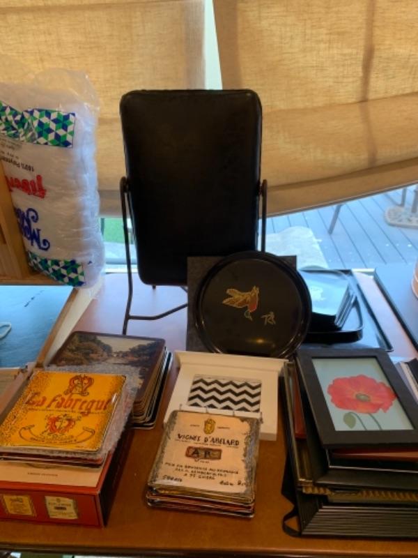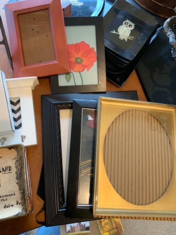 Lot 46. Assorted frames, lacquer serving trays, cheese plates, large coasters, luncheon placemats, pair of mid-century otter figures, etc.--$45