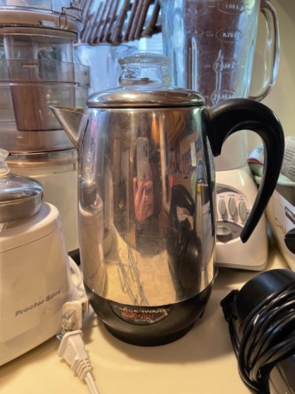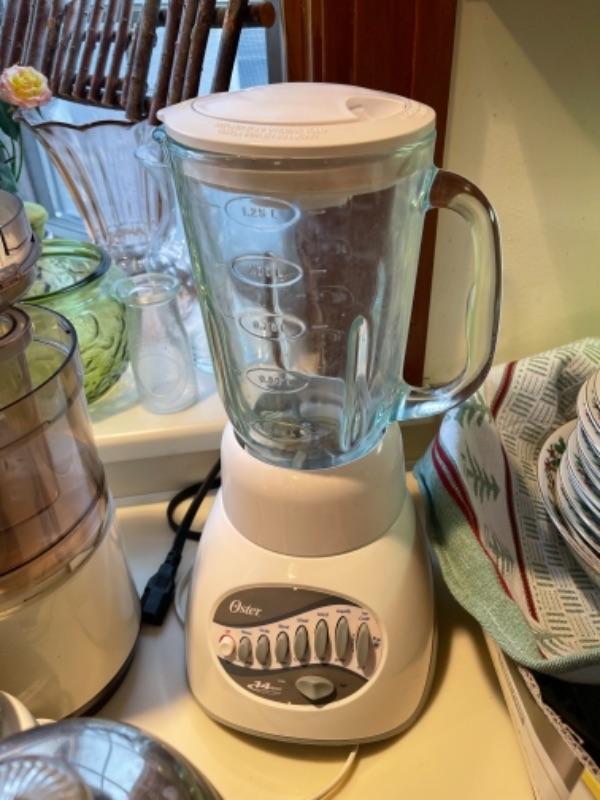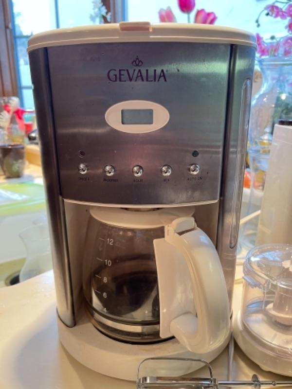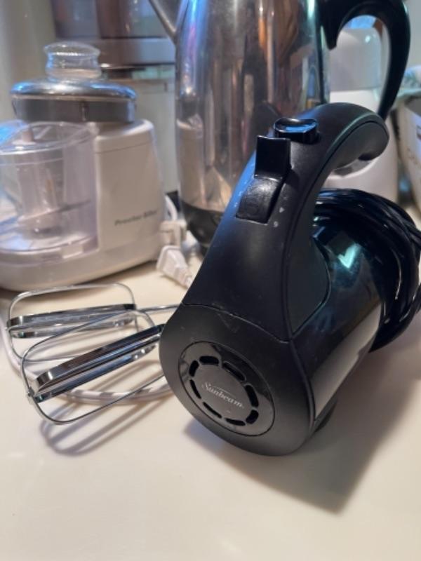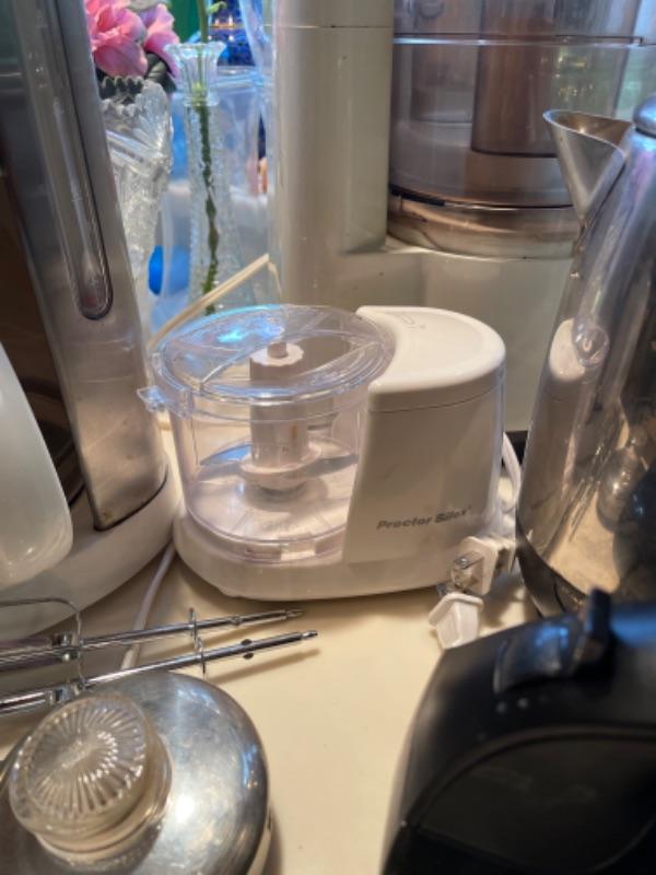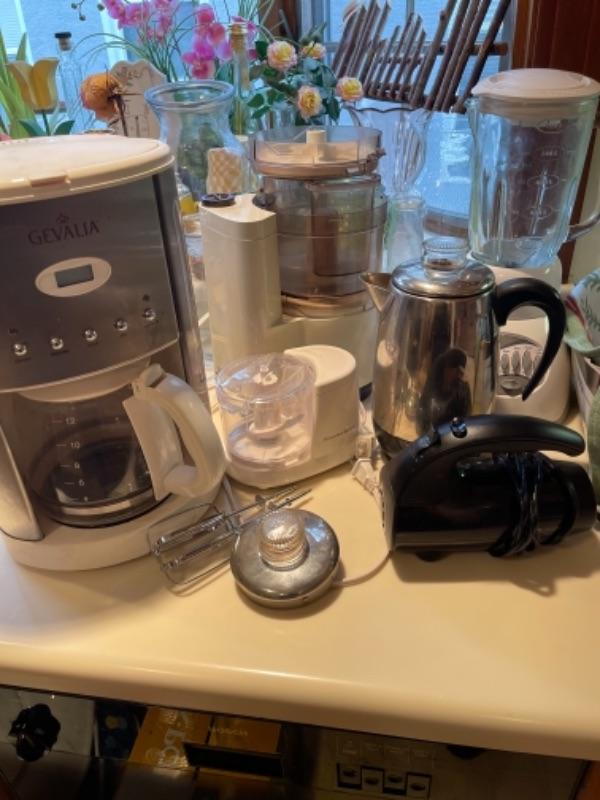 Lot 46. Assorted small appliance--Gevalia coffee maker, food processor, Sunbeam hand mixer, Farberware food processor, Oster blender, Regal food processor, etc.--Was $45 - - Now $25