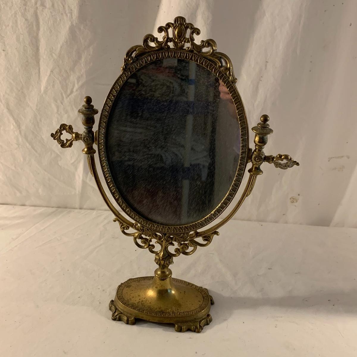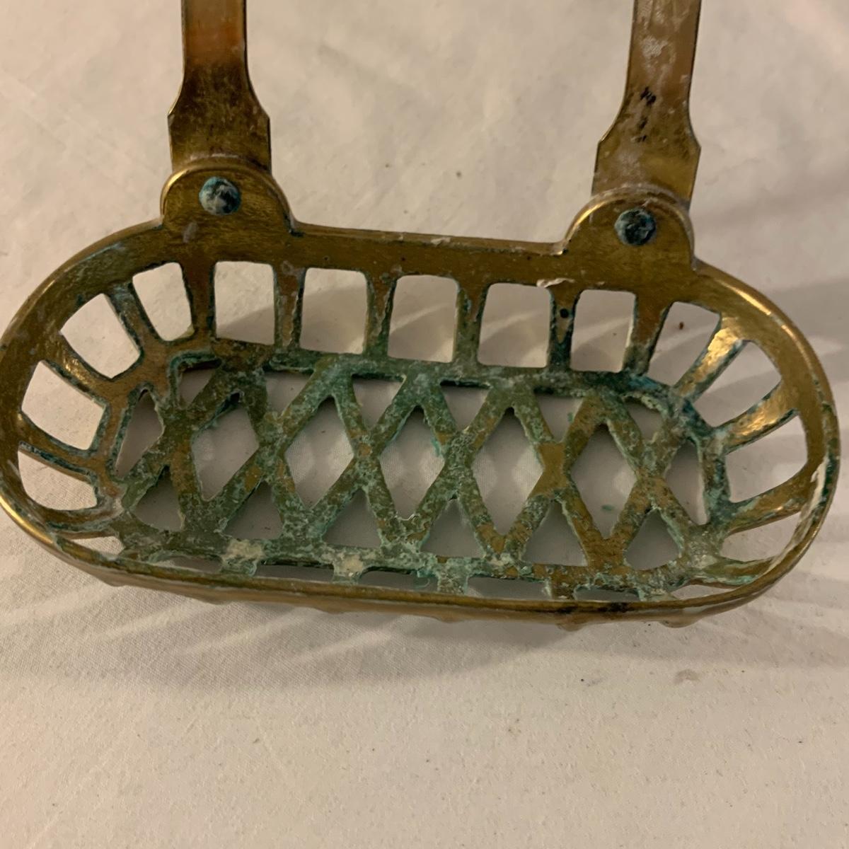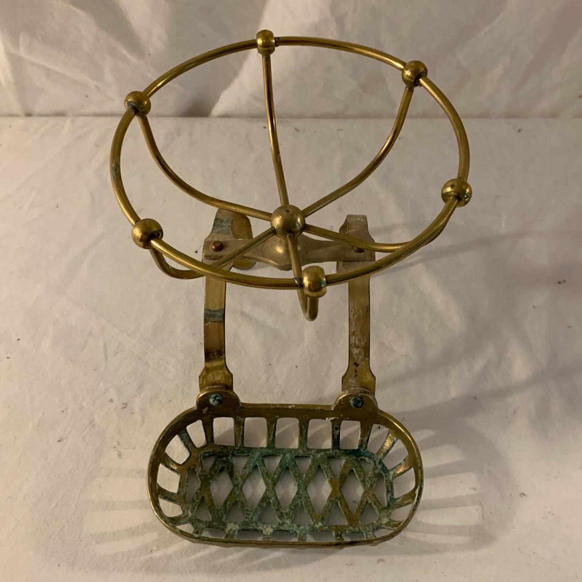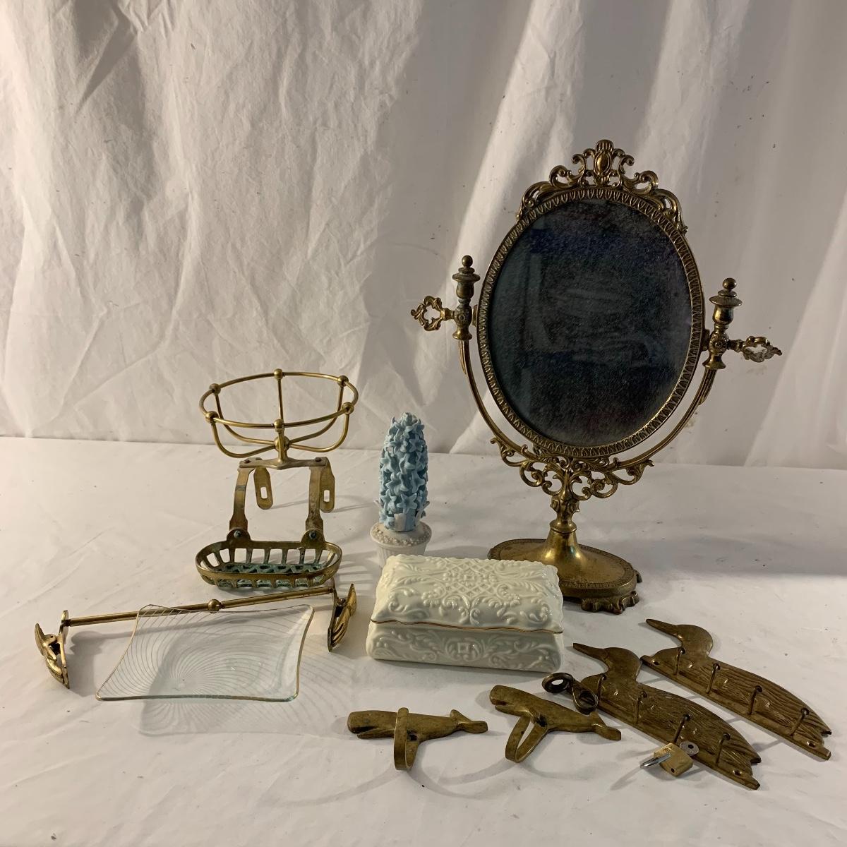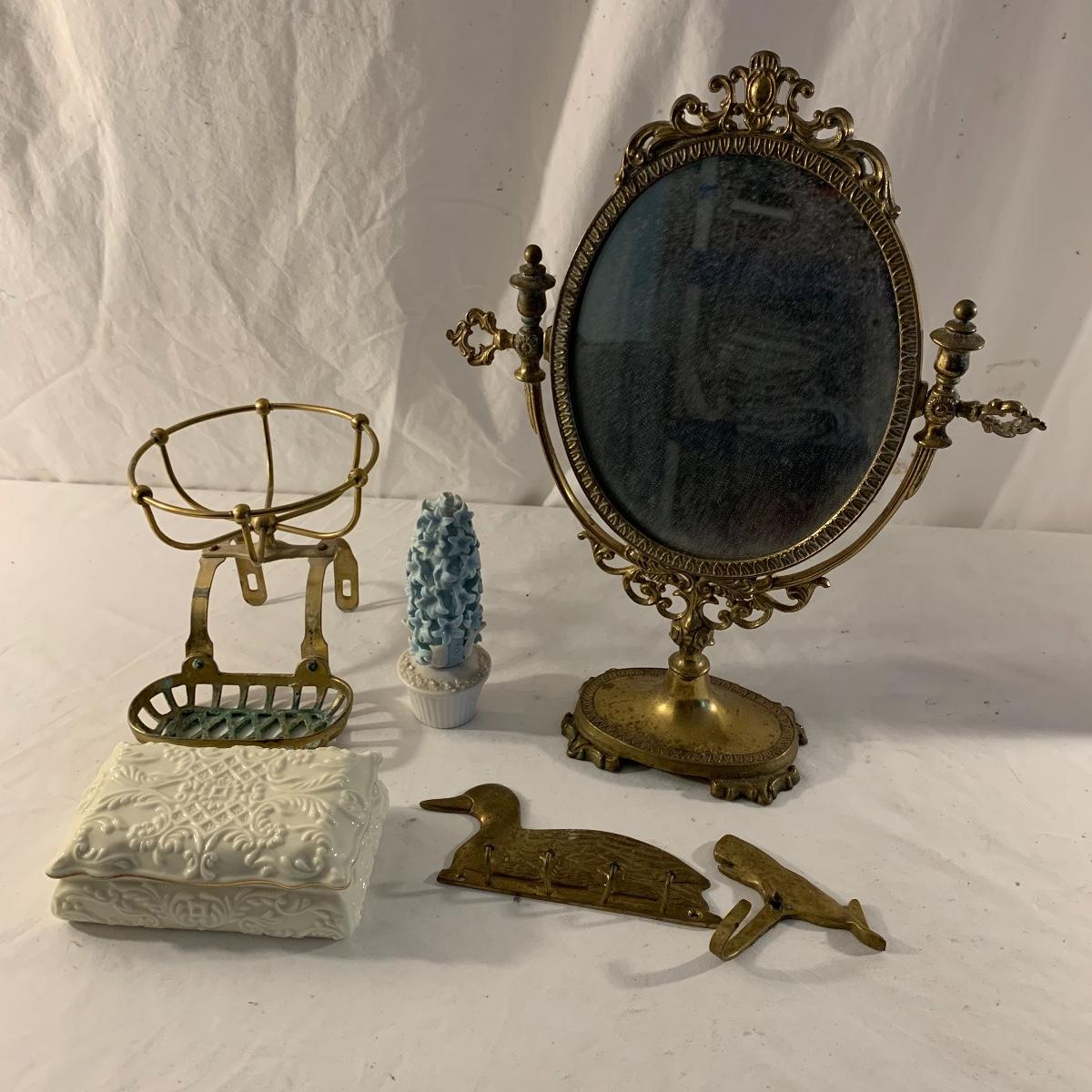 This lot contains an eclectic collection of brass and vanity items. There is a lovely antique countertop mirror in an ornate brass frame and stand. It can stand straight or be at an angle. It’s a little dusty and has some tarnishing from its age, but is overall in good condition. It is 15.5” tall. You’ll also find a brass soap holder that can be mounted to the wall. It’s attached to a little baskets that you can put other bathroom items in. There is some oxidation present on the soap holder. There are two brass duck key hooks that mount to the wall. They feature little baby ducks swimming alongside their mama and each have four hooks and are 7” long. There are two brass whale shaped hooks as well, that each have one hook and are 4” long. There is also an item that has a brass bar and two hand-shaped clips on the end that measures about 10” long. In addition to the brass items there is a ceramic box, a glass dish, and a ceramic perfume bottle. The ceramic box is an ornate white box with a lid, perfect for holding jewelry or other small items. The lid is lined with a gold edge. It measures 6” x 4” x 2”. The glass dish is translucent with a neat spiral design and has a gold border. The perfume bottle is in the shape of a floral topiary. Some of the flowers have broken off. It still as a lovely aroma emanating from it. Shipping available.