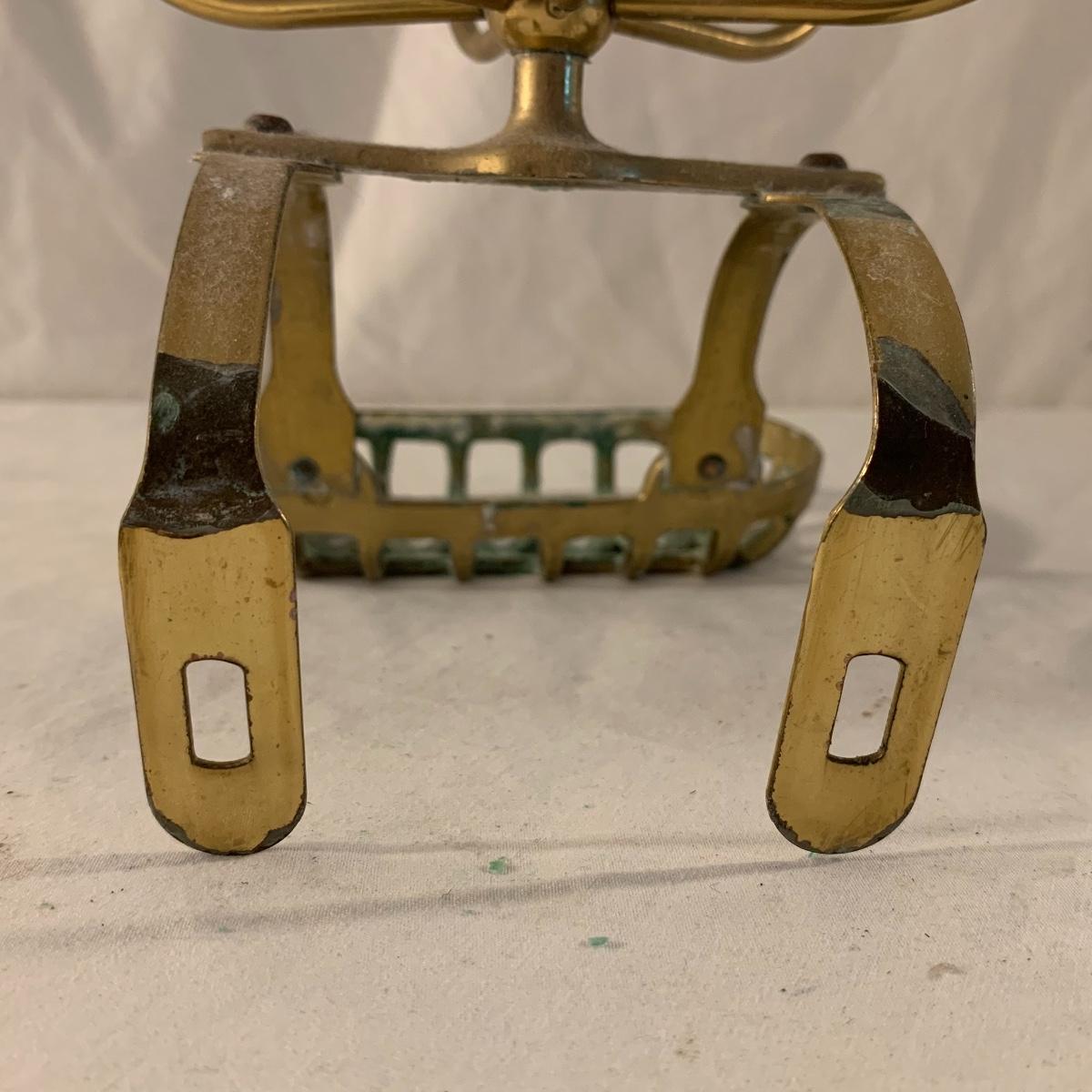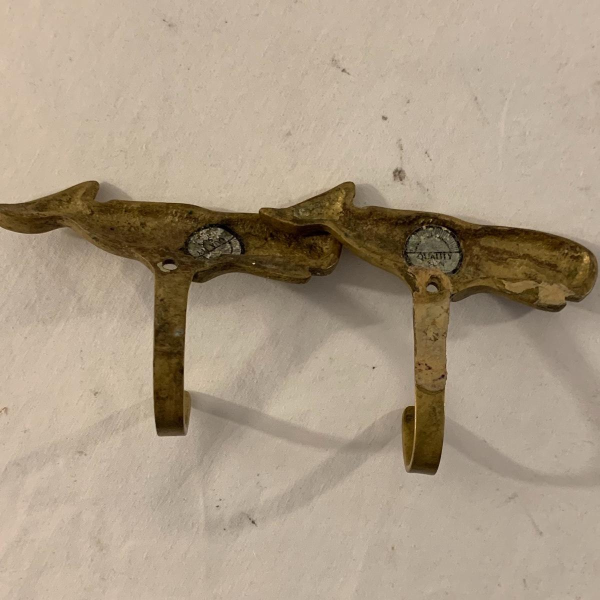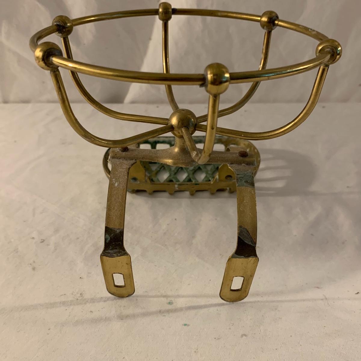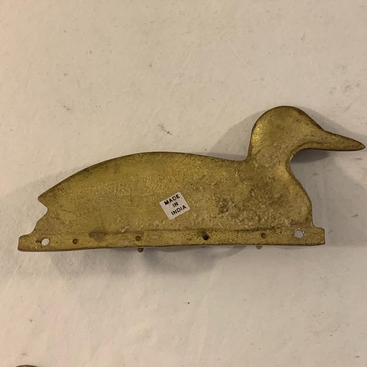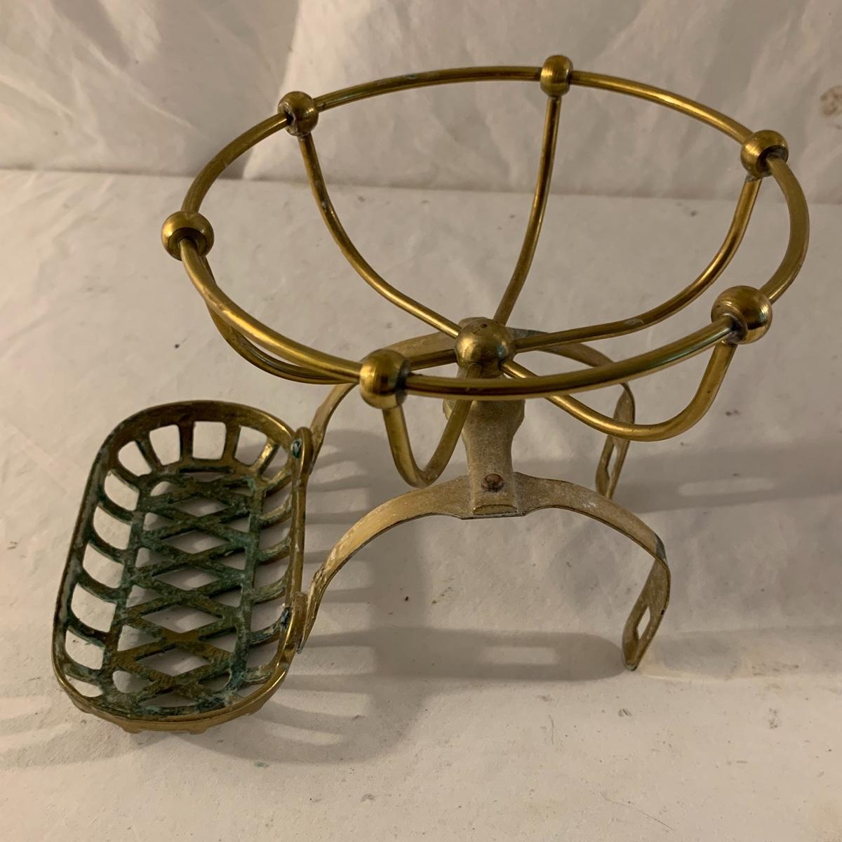 This lot contains an eclectic collection of brass and vanity items. There is a lovely antique countertop mirror in an ornate brass frame and stand. It can stand straight or be at an angle. It’s a little dusty and has some tarnishing from its age, but is overall in good condition. It is 15.5” tall. You’ll also find a brass soap holder that can be mounted to the wall. It’s attached to a little baskets that you can put other bathroom items in. There is some oxidation present on the soap holder. There are two brass duck key hooks that mount to the wall. They feature little baby ducks swimming alongside their mama and each have four hooks and are 7” long. There are two brass whale shaped hooks as well, that each have one hook and are 4” long. There is also an item that has a brass bar and two hand-shaped clips on the end that measures about 10” long. In addition to the brass items there is a ceramic box, a glass dish, and a ceramic perfume bottle. The ceramic box is an ornate white box with a lid, perfect for holding jewelry or other small items. The lid is lined with a gold edge. It measures 6” x 4” x 2”. The glass dish is translucent with a neat spiral design and has a gold border. The perfume bottle is in the shape of a floral topiary. Some of the flowers have broken off. It still as a lovely aroma emanating from it. Shipping available.