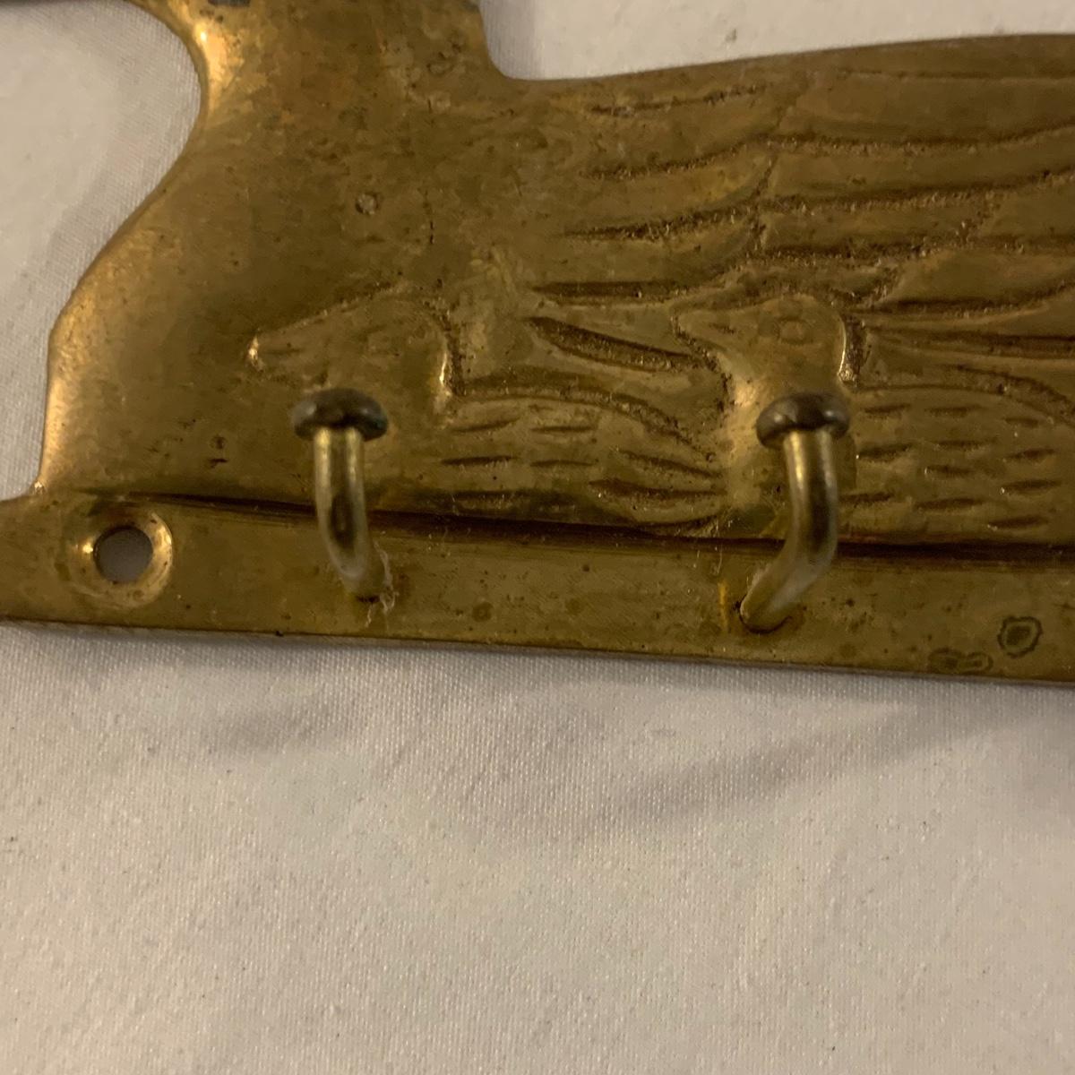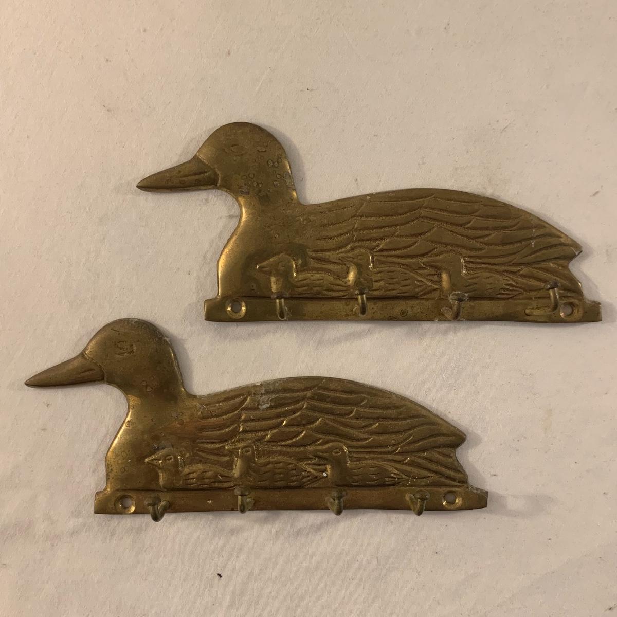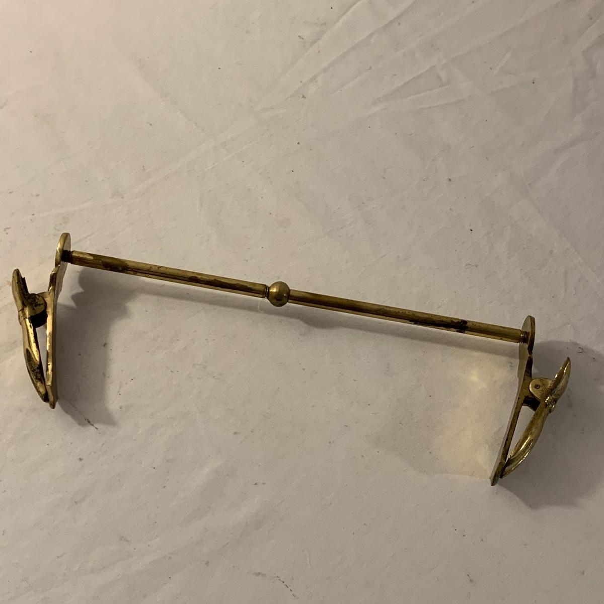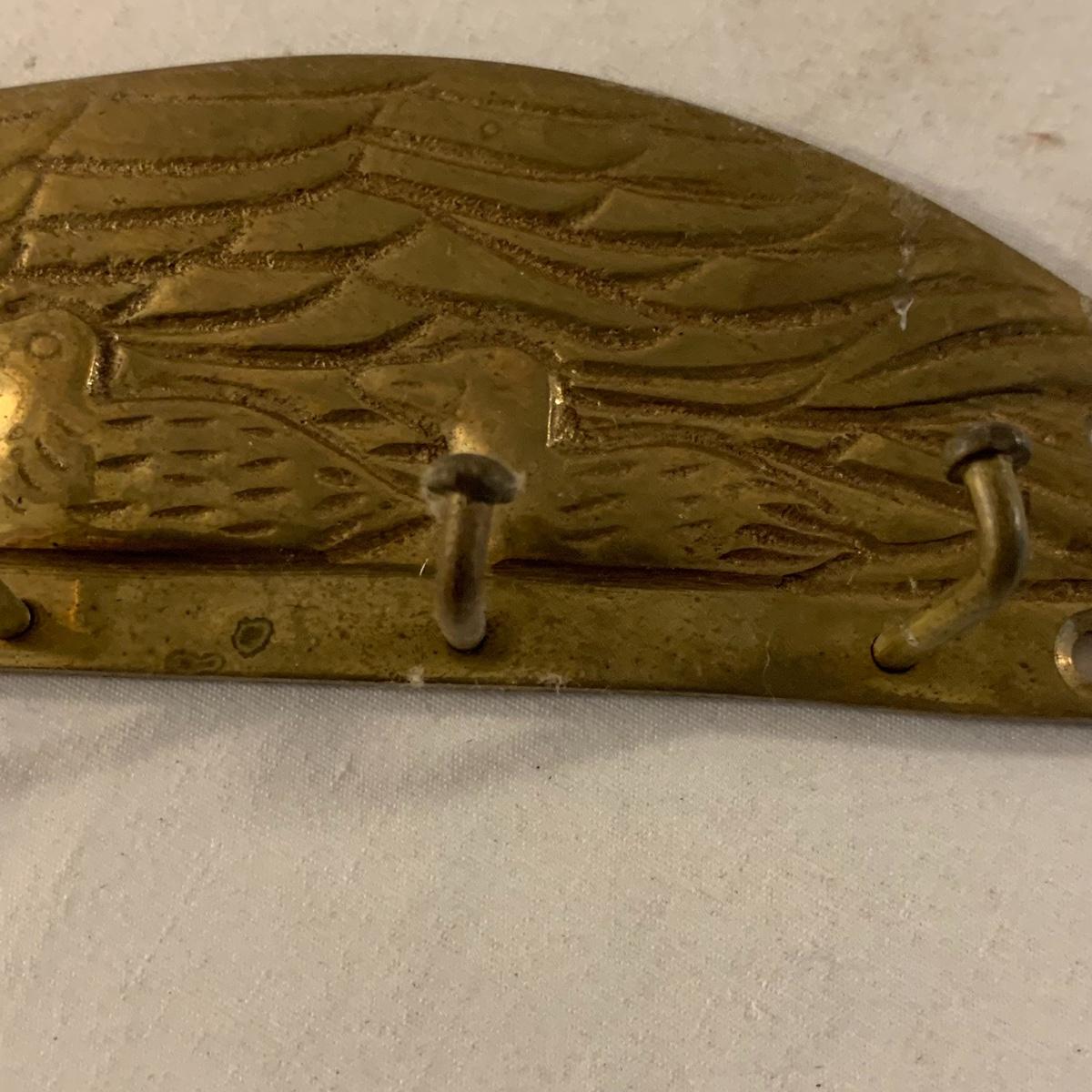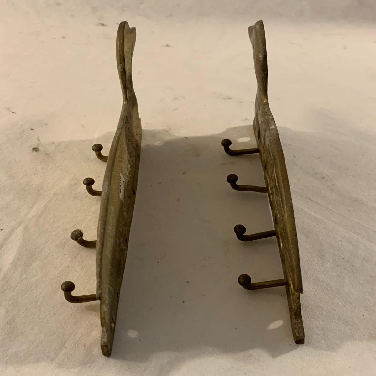 This lot contains an eclectic collection of brass and vanity items. There is a lovely antique countertop mirror in an ornate brass frame and stand. It can stand straight or be at an angle. It’s a little dusty and has some tarnishing from its age, but is overall in good condition. It is 15.5” tall. You’ll also find a brass soap holder that can be mounted to the wall. It’s attached to a little baskets that you can put other bathroom items in. There is some oxidation present on the soap holder. There are two brass duck key hooks that mount to the wall. They feature little baby ducks swimming alongside their mama and each have four hooks and are 7” long. There are two brass whale shaped hooks as well, that each have one hook and are 4” long. There is also an item that has a brass bar and two hand-shaped clips on the end that measures about 10” long. In addition to the brass items there is a ceramic box, a glass dish, and a ceramic perfume bottle. The ceramic box is an ornate white box with a lid, perfect for holding jewelry or other small items. The lid is lined with a gold edge. It measures 6” x 4” x 2”. The glass dish is translucent with a neat spiral design and has a gold border. The perfume bottle is in the shape of a floral topiary. Some of the flowers have broken off. It still as a lovely aroma emanating from it. Shipping available.