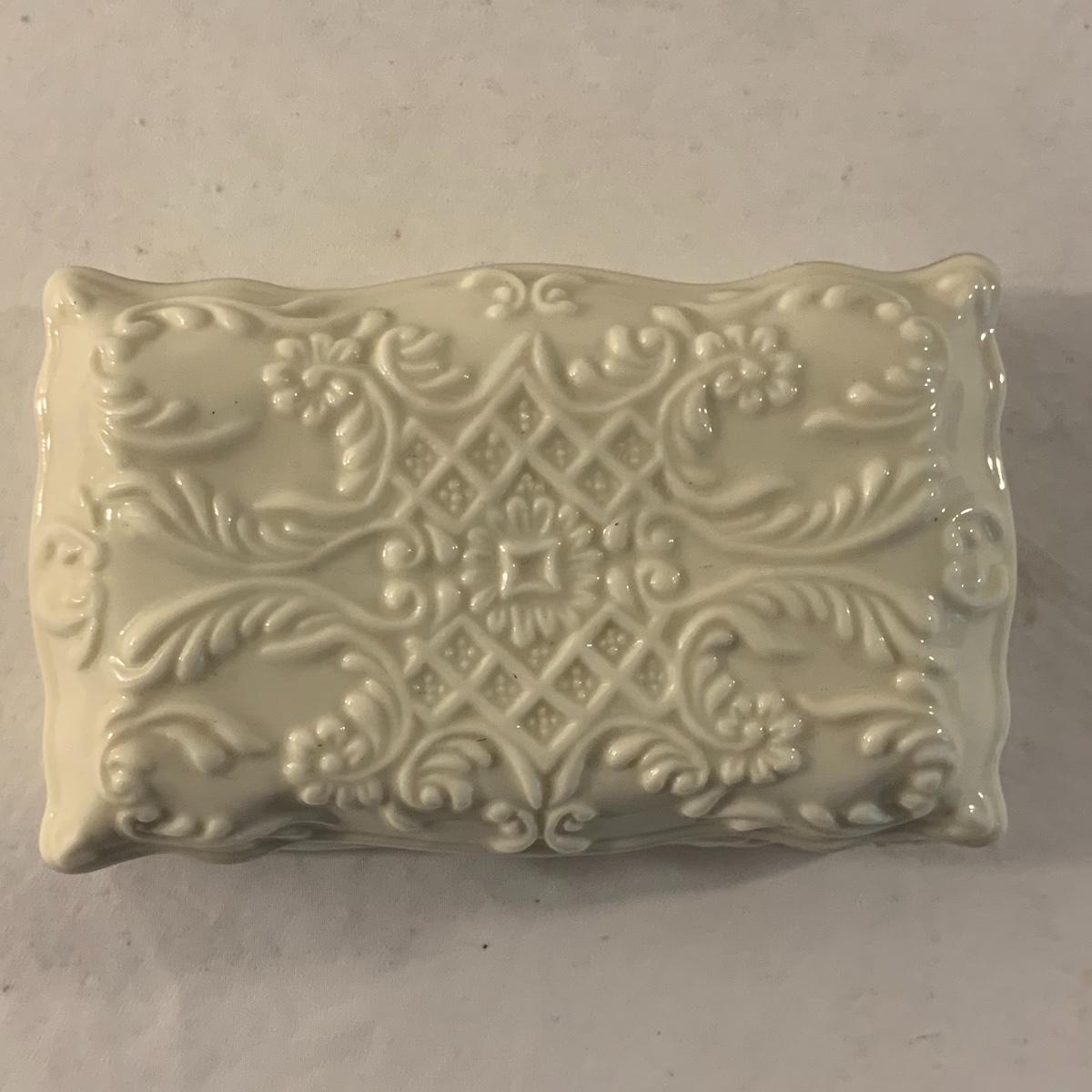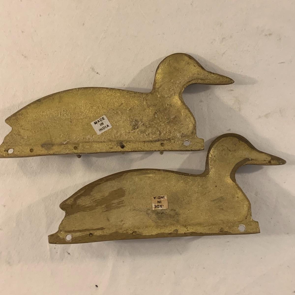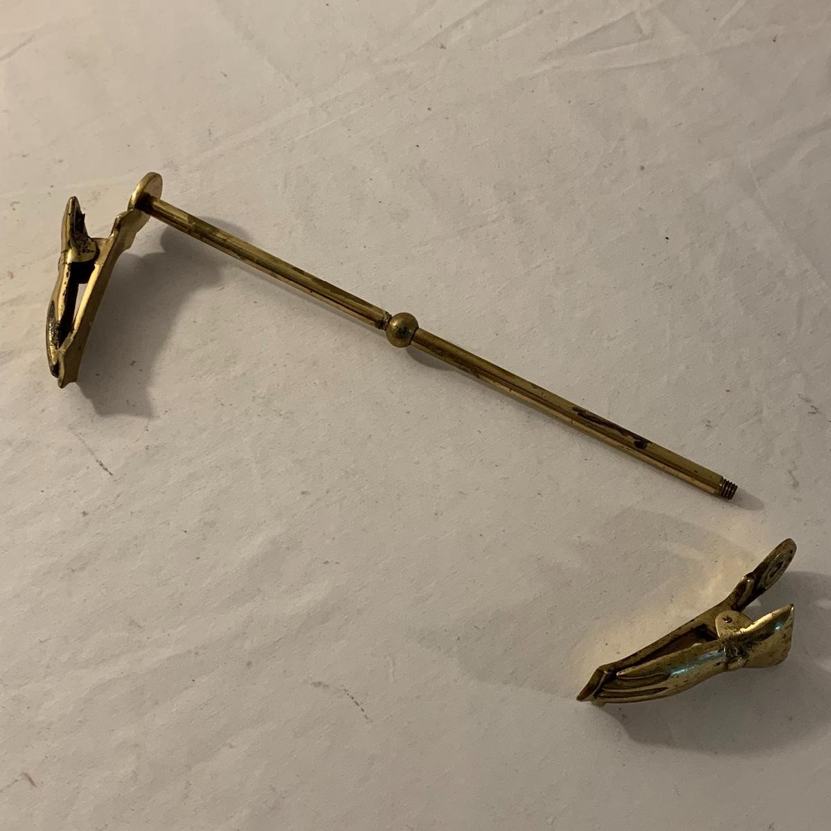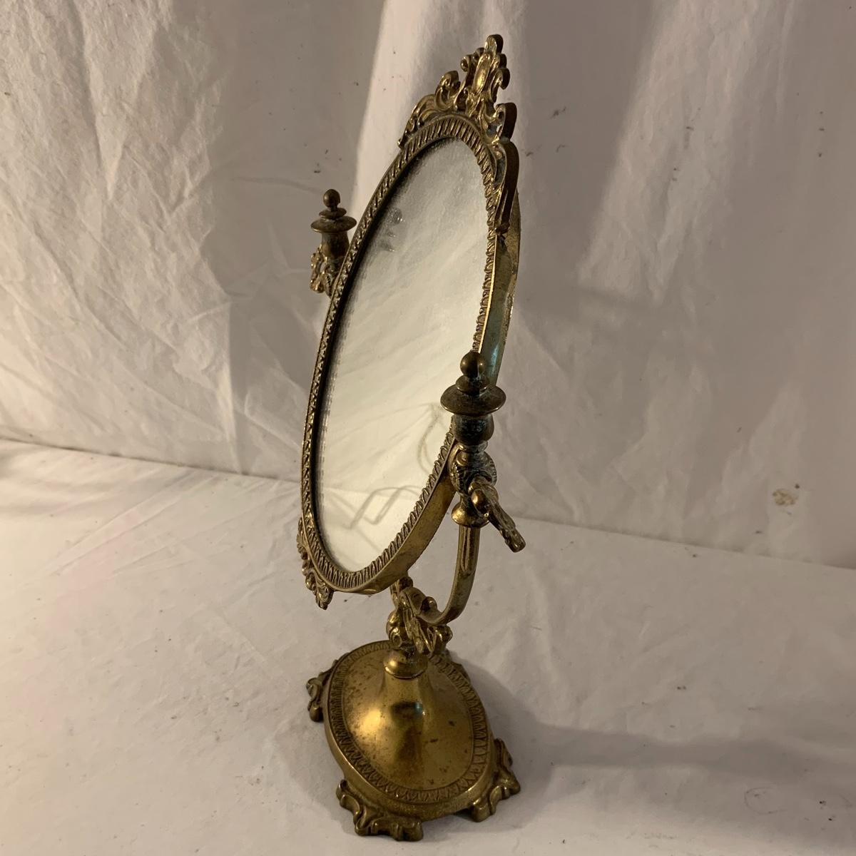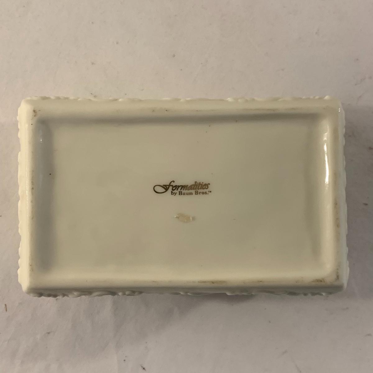 This lot contains an eclectic collection of brass and vanity items. There is a lovely antique countertop mirror in an ornate brass frame and stand. It can stand straight or be at an angle. It’s a little dusty and has some tarnishing from its age, but is overall in good condition. It is 15.5” tall. You’ll also find a brass soap holder that can be mounted to the wall. It’s attached to a little baskets that you can put other bathroom items in. There is some oxidation present on the soap holder. There are two brass duck key hooks that mount to the wall. They feature little baby ducks swimming alongside their mama and each have four hooks and are 7” long. There are two brass whale shaped hooks as well, that each have one hook and are 4” long. There is also an item that has a brass bar and two hand-shaped clips on the end that measures about 10” long. In addition to the brass items there is a ceramic box, a glass dish, and a ceramic perfume bottle. The ceramic box is an ornate white box with a lid, perfect for holding jewelry or other small items. The lid is lined with a gold edge. It measures 6” x 4” x 2”. The glass dish is translucent with a neat spiral design and has a gold border. The perfume bottle is in the shape of a floral topiary. Some of the flowers have broken off. It still as a lovely aroma emanating from it. Shipping available.