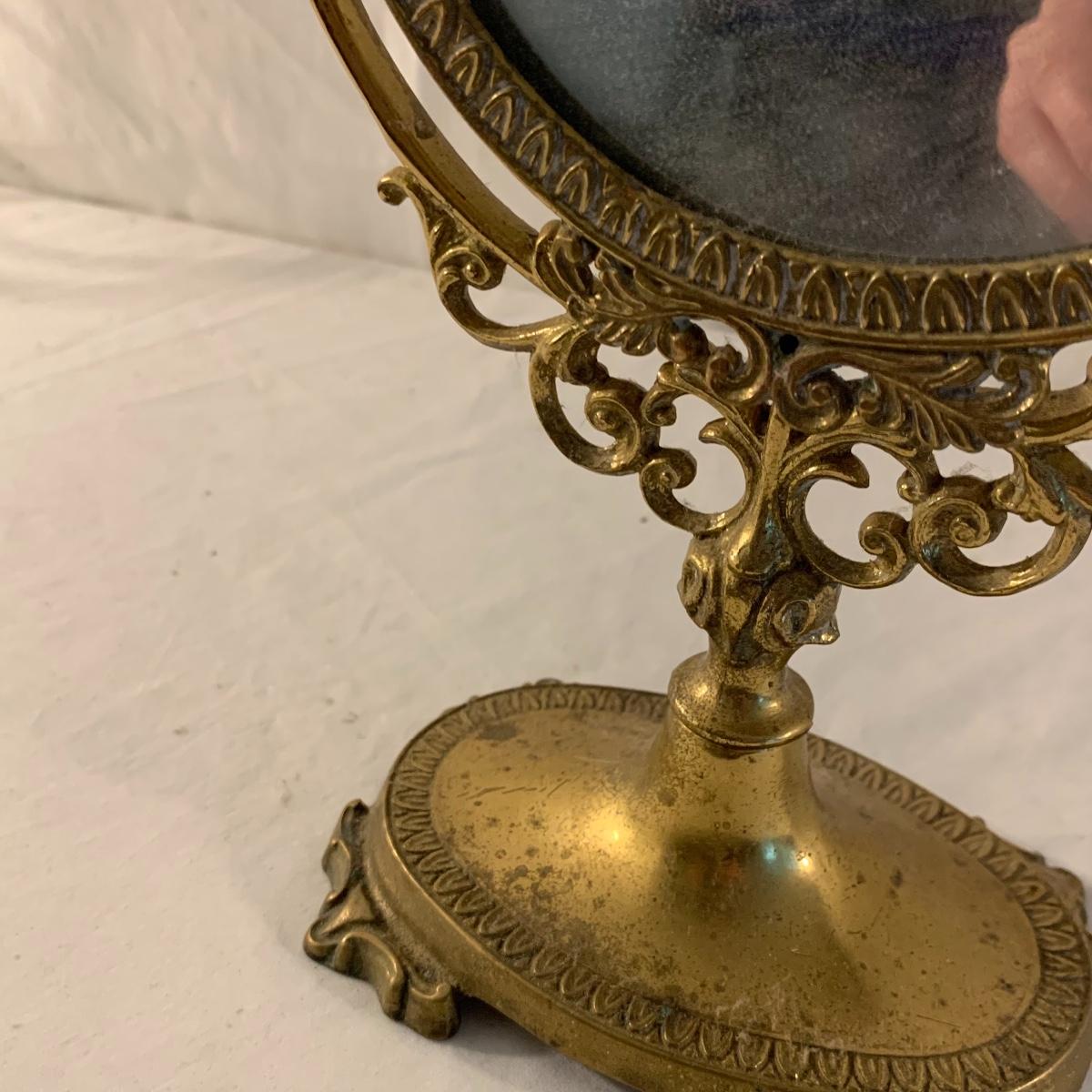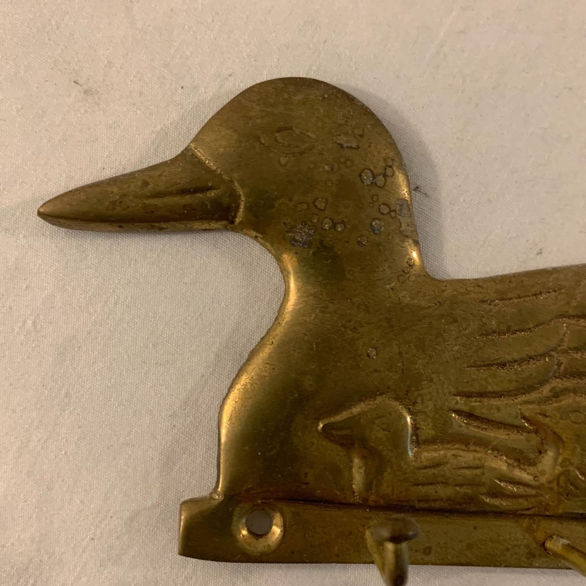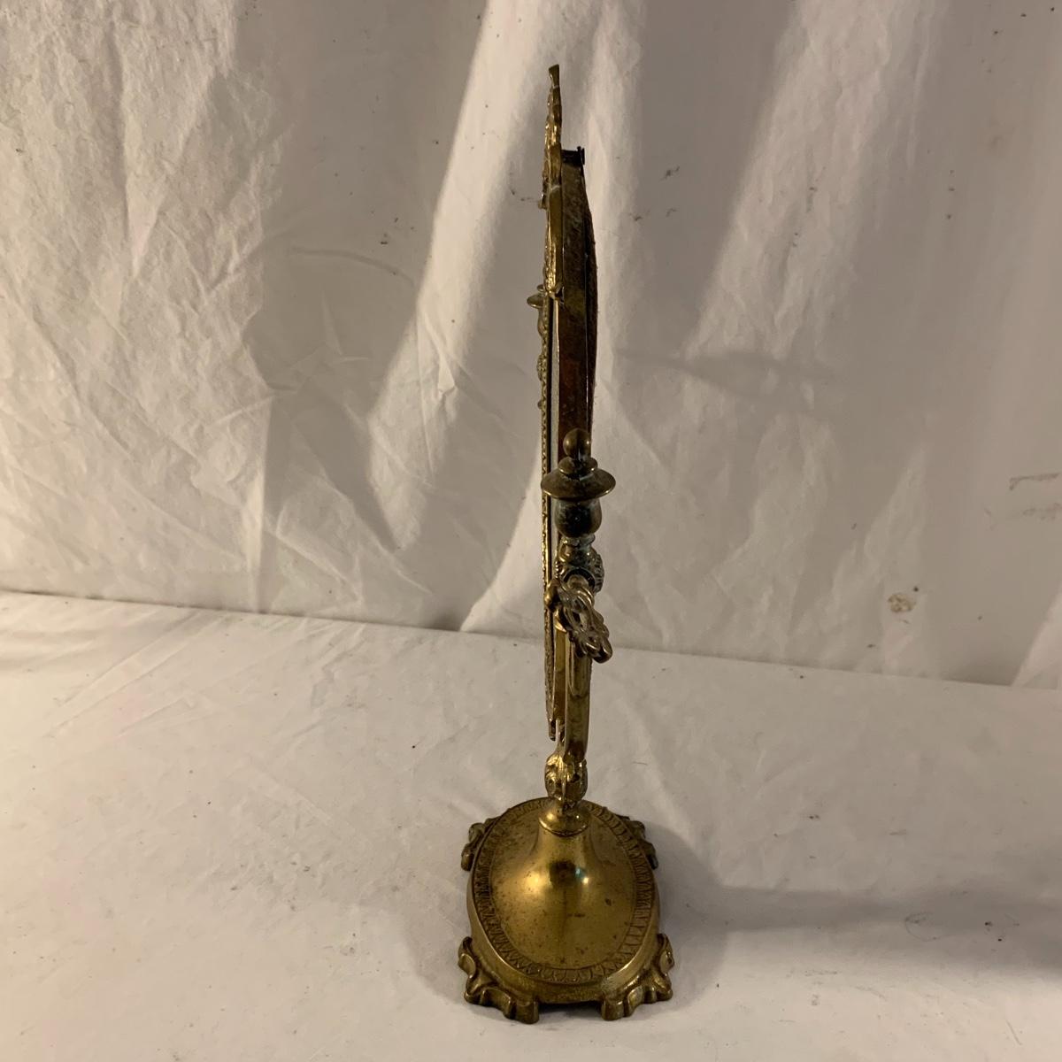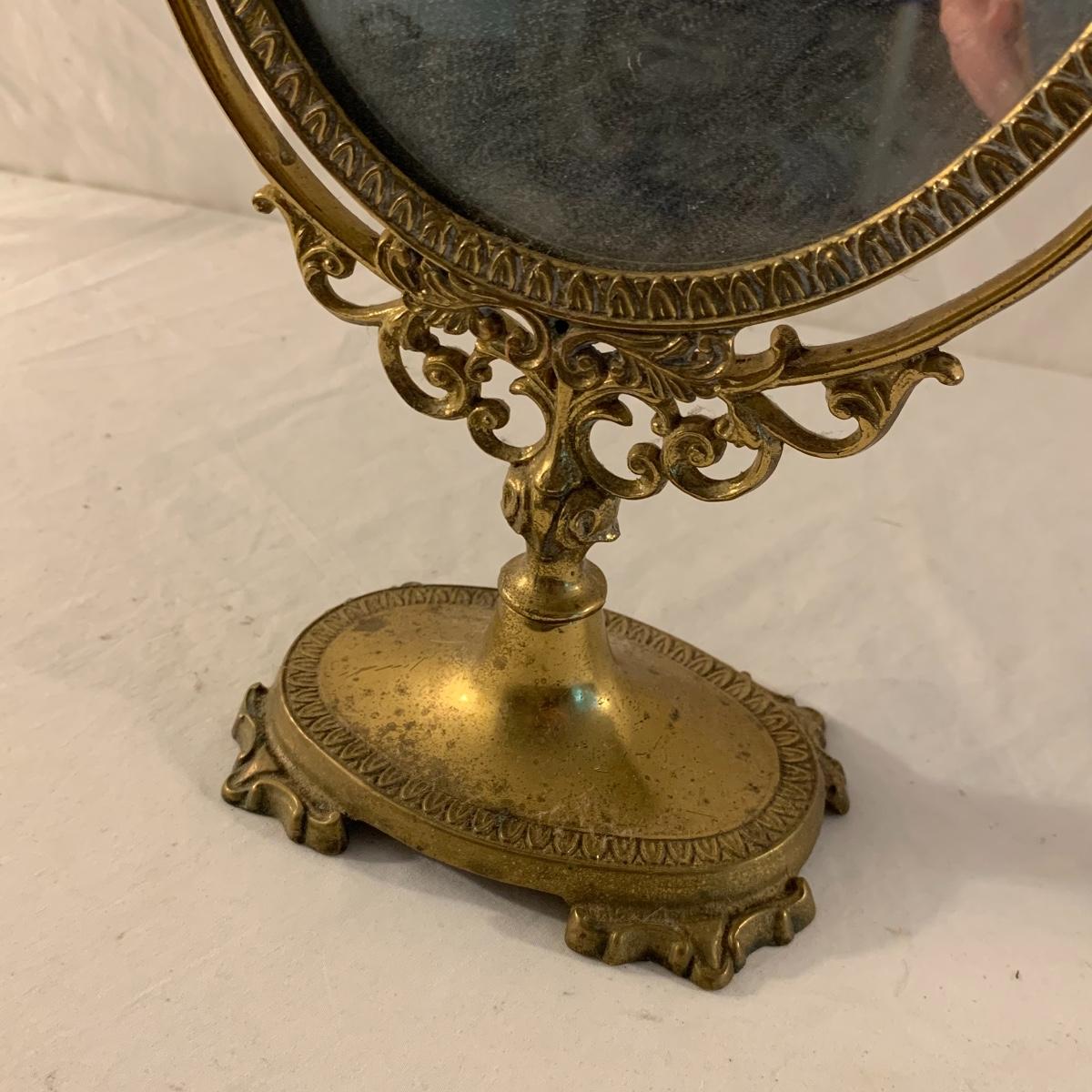 This lot contains an eclectic collection of brass and vanity items. There is a lovely antique countertop mirror in an ornate brass frame and stand. It can stand straight or be at an angle. It’s a little dusty and has some tarnishing from its age, but is overall in good condition. It is 15.5” tall. You’ll also find a brass soap holder that can be mounted to the wall. It’s attached to a little baskets that you can put other bathroom items in. There is some oxidation present on the soap holder. There are two brass duck key hooks that mount to the wall. They feature little baby ducks swimming alongside their mama and each have four hooks and are 7” long. There are two brass whale shaped hooks as well, that each have one hook and are 4” long. There is also an item that has a brass bar and two hand-shaped clips on the end that measures about 10” long. In addition to the brass items there is a ceramic box, a glass dish, and a ceramic perfume bottle. The ceramic box is an ornate white box with a lid, perfect for holding jewelry or other small items. The lid is lined with a gold edge. It measures 6” x 4” x 2”. The glass dish is translucent with a neat spiral design and has a gold border. The perfume bottle is in the shape of a floral topiary. Some of the flowers have broken off. It still as a lovely aroma emanating from it. Shipping available.