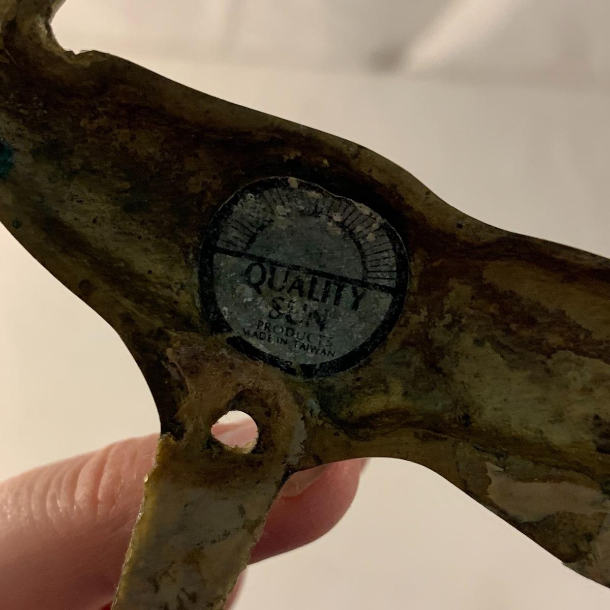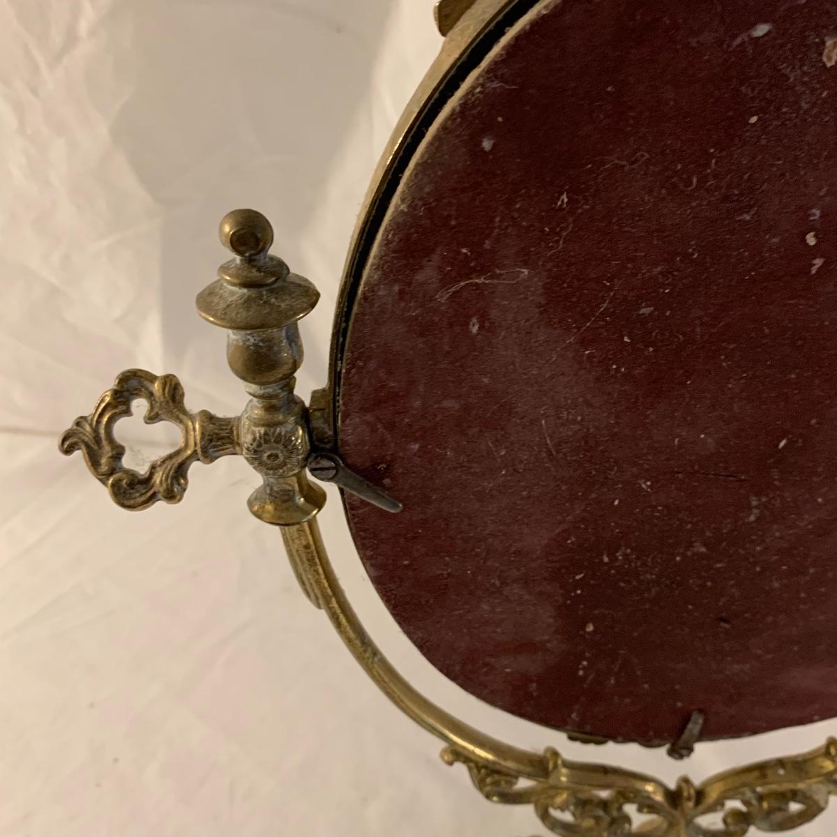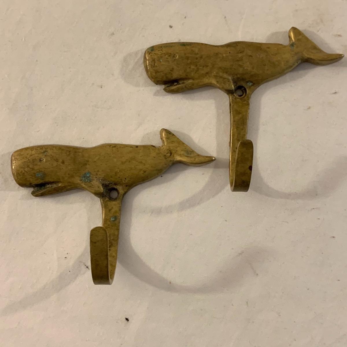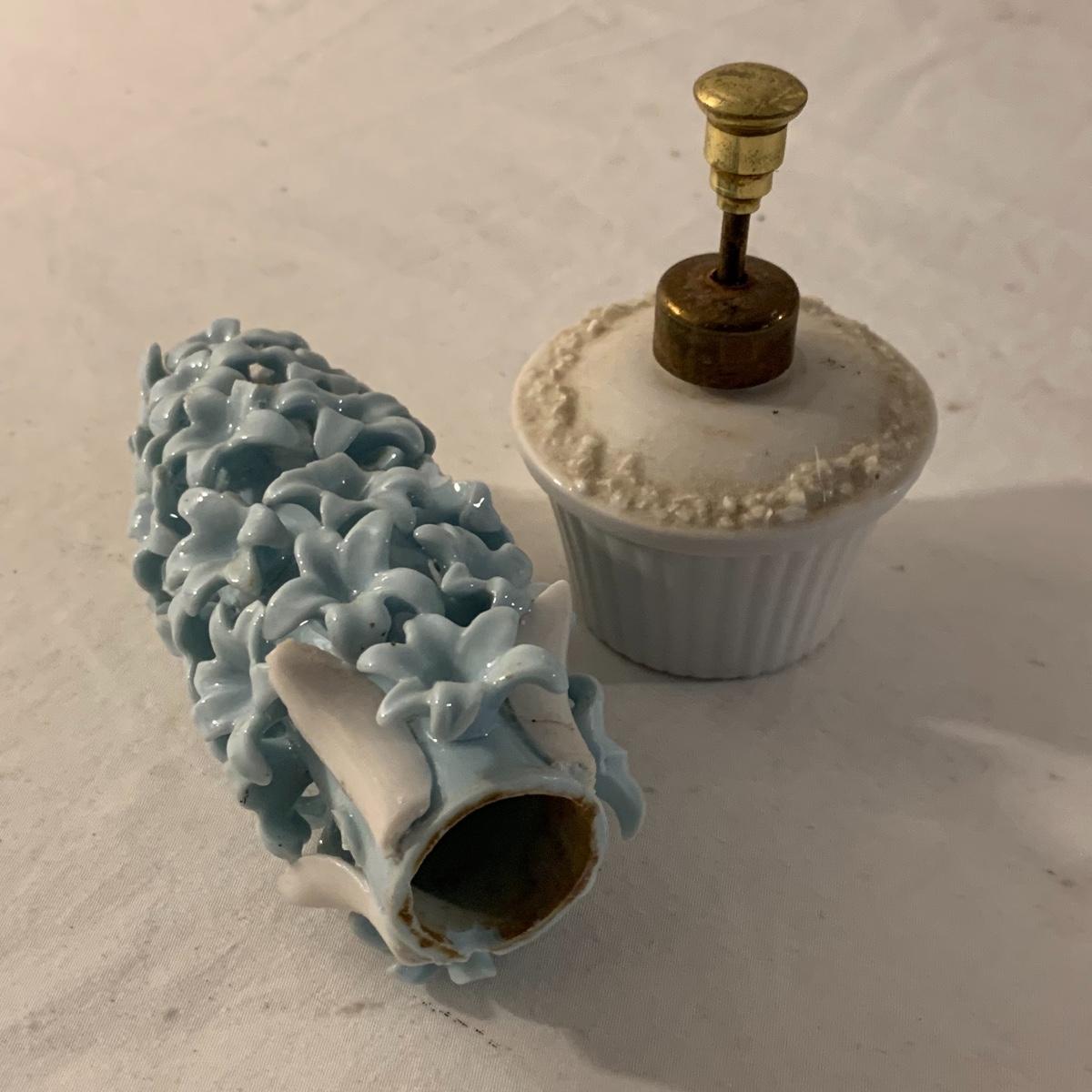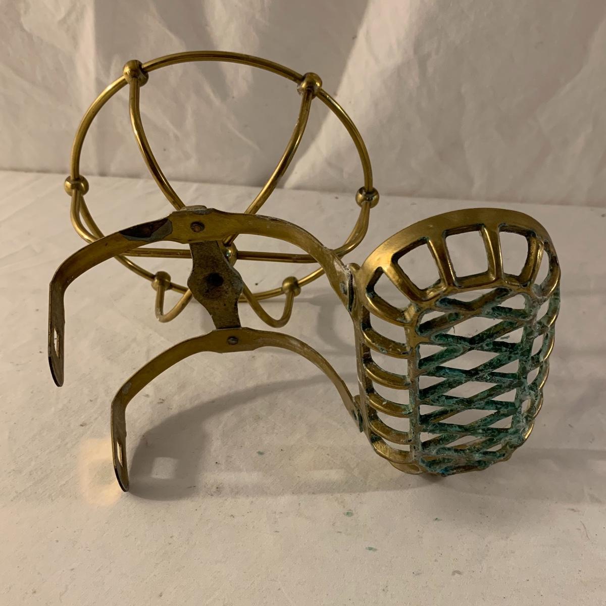 This lot contains an eclectic collection of brass and vanity items. There is a lovely antique countertop mirror in an ornate brass frame and stand. It can stand straight or be at an angle. It’s a little dusty and has some tarnishing from its age, but is overall in good condition. It is 15.5” tall. You’ll also find a brass soap holder that can be mounted to the wall. It’s attached to a little baskets that you can put other bathroom items in. There is some oxidation present on the soap holder. There are two brass duck key hooks that mount to the wall. They feature little baby ducks swimming alongside their mama and each have four hooks and are 7” long. There are two brass whale shaped hooks as well, that each have one hook and are 4” long. There is also an item that has a brass bar and two hand-shaped clips on the end that measures about 10” long. In addition to the brass items there is a ceramic box, a glass dish, and a ceramic perfume bottle. The ceramic box is an ornate white box with a lid, perfect for holding jewelry or other small items. The lid is lined with a gold edge. It measures 6” x 4” x 2”. The glass dish is translucent with a neat spiral design and has a gold border. The perfume bottle is in the shape of a floral topiary. Some of the flowers have broken off. It still as a lovely aroma emanating from it. Shipping available.