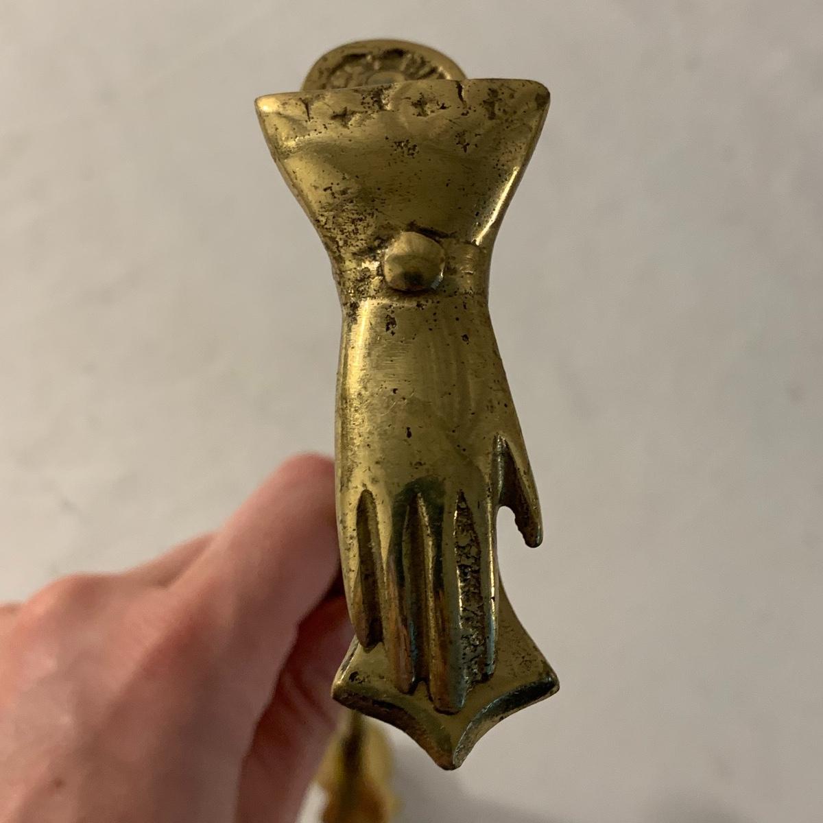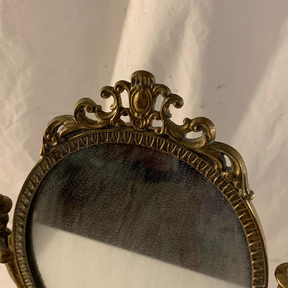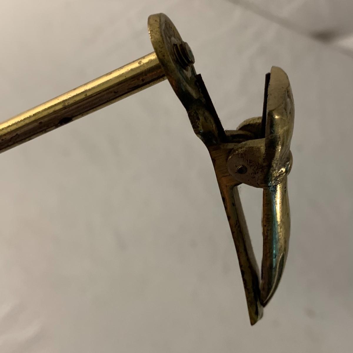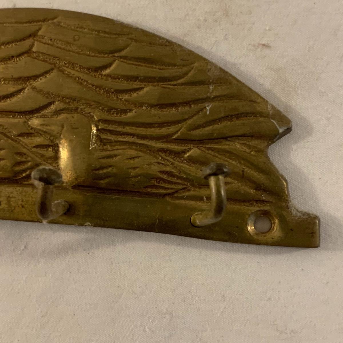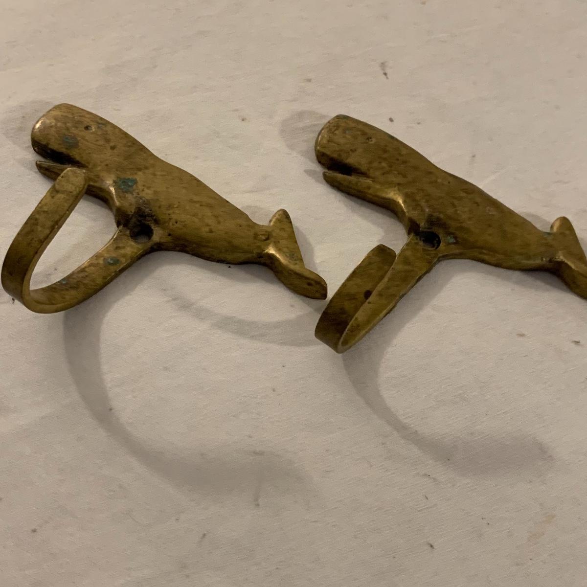 This lot contains an eclectic collection of brass and vanity items. There is a lovely antique countertop mirror in an ornate brass frame and stand. It can stand straight or be at an angle. It’s a little dusty and has some tarnishing from its age, but is overall in good condition. It is 15.5” tall. You’ll also find a brass soap holder that can be mounted to the wall. It’s attached to a little baskets that you can put other bathroom items in. There is some oxidation present on the soap holder. There are two brass duck key hooks that mount to the wall. They feature little baby ducks swimming alongside their mama and each have four hooks and are 7” long. There are two brass whale shaped hooks as well, that each have one hook and are 4” long. There is also an item that has a brass bar and two hand-shaped clips on the end that measures about 10” long. In addition to the brass items there is a ceramic box, a glass dish, and a ceramic perfume bottle. The ceramic box is an ornate white box with a lid, perfect for holding jewelry or other small items. The lid is lined with a gold edge. It measures 6” x 4” x 2”. The glass dish is translucent with a neat spiral design and has a gold border. The perfume bottle is in the shape of a floral topiary. Some of the flowers have broken off. It still as a lovely aroma emanating from it. Shipping available.