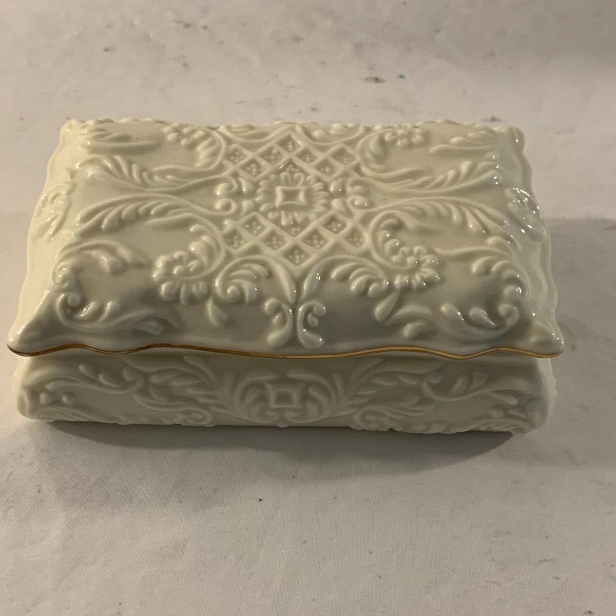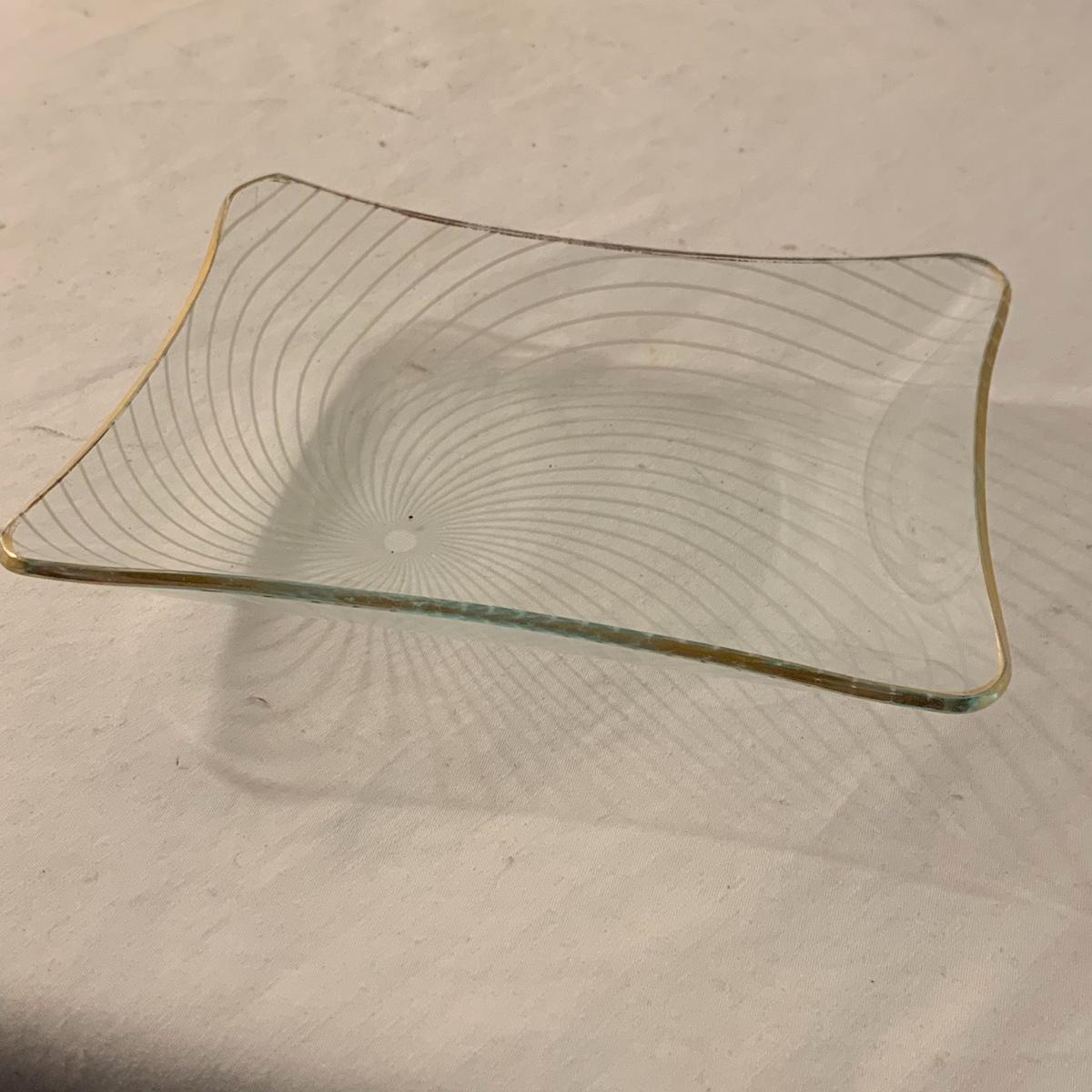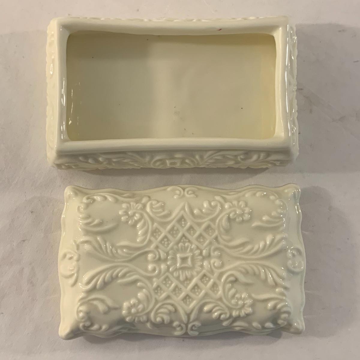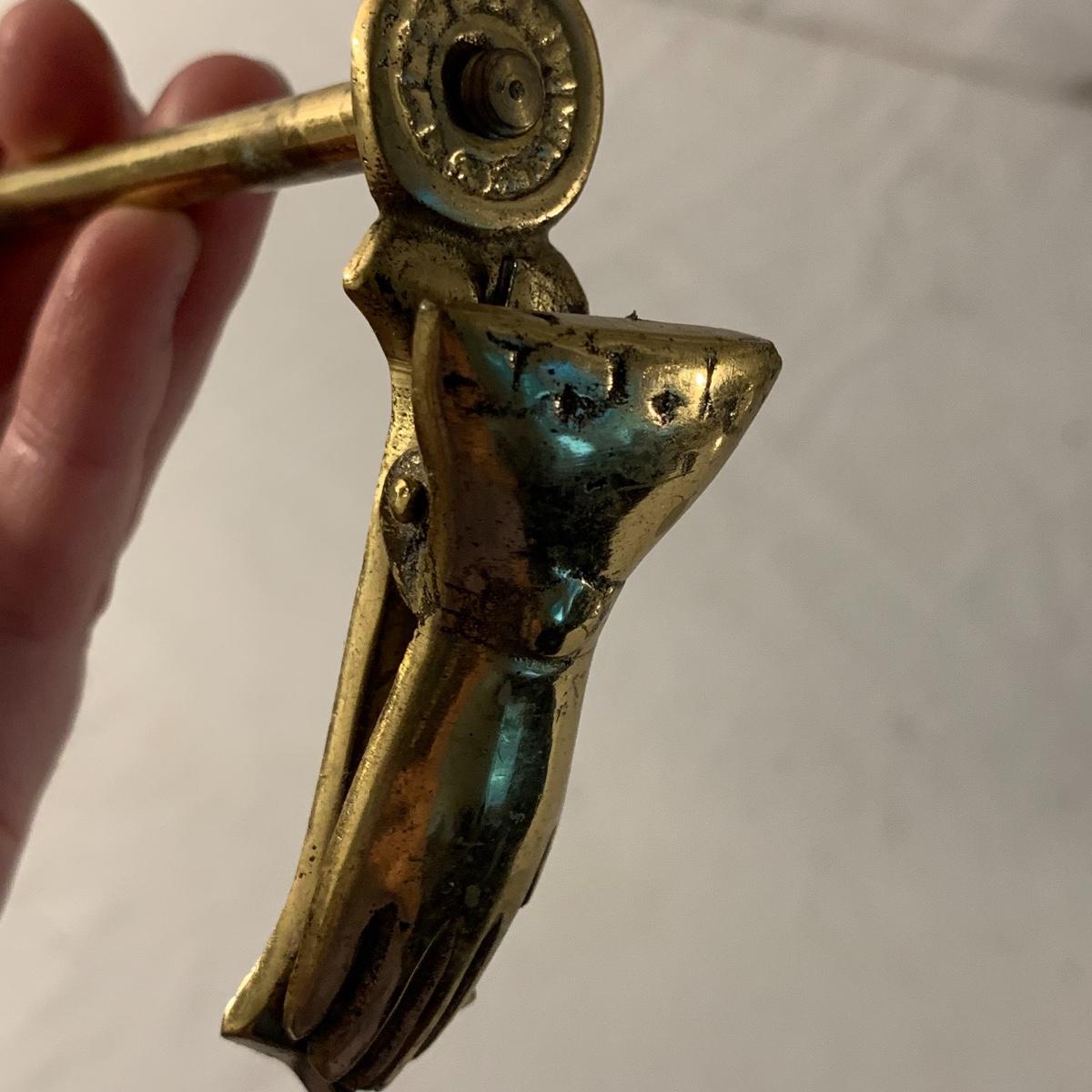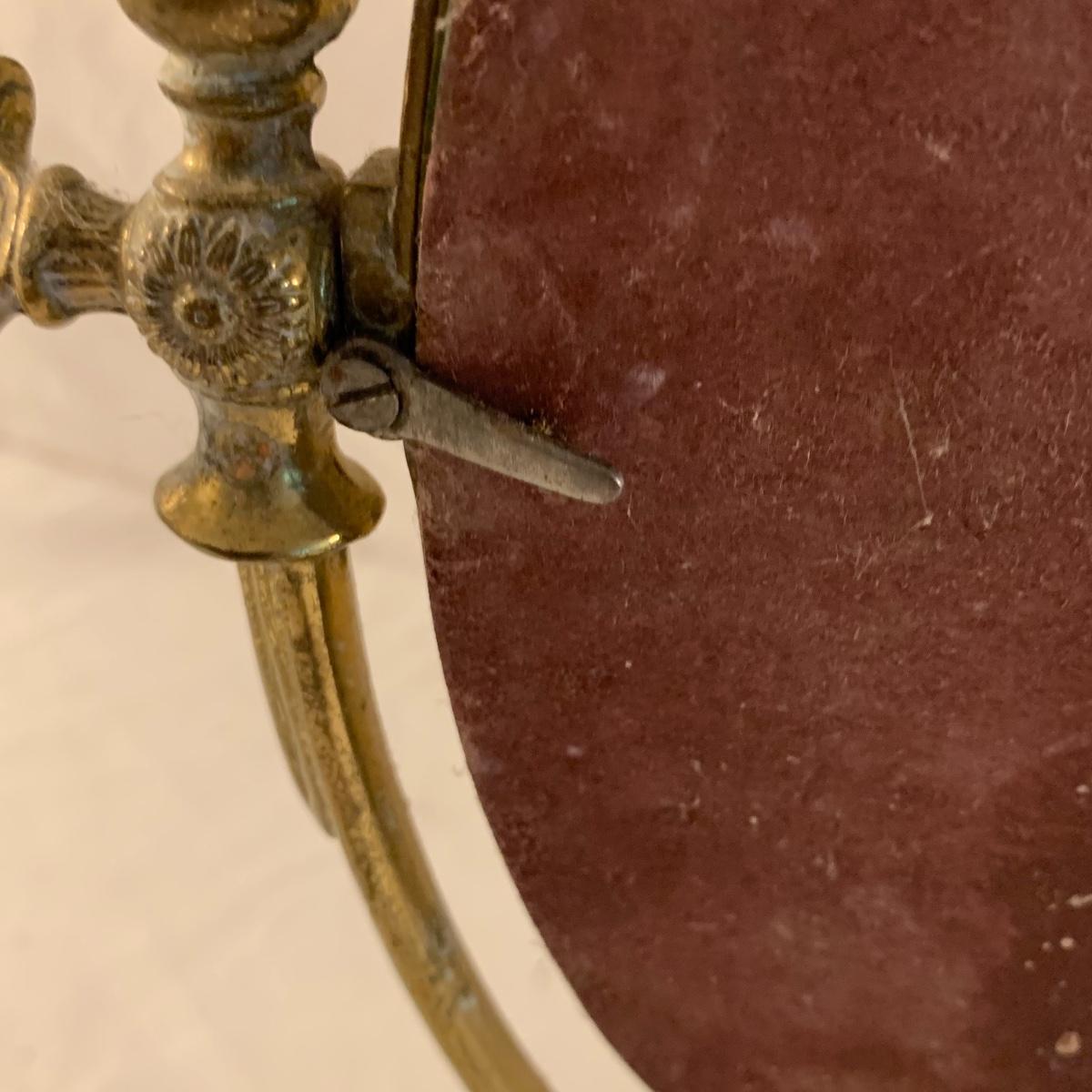 This lot contains an eclectic collection of brass and vanity items. There is a lovely antique countertop mirror in an ornate brass frame and stand. It can stand straight or be at an angle. It’s a little dusty and has some tarnishing from its age, but is overall in good condition. It is 15.5” tall. You’ll also find a brass soap holder that can be mounted to the wall. It’s attached to a little baskets that you can put other bathroom items in. There is some oxidation present on the soap holder. There are two brass duck key hooks that mount to the wall. They feature little baby ducks swimming alongside their mama and each have four hooks and are 7” long. There are two brass whale shaped hooks as well, that each have one hook and are 4” long. There is also an item that has a brass bar and two hand-shaped clips on the end that measures about 10” long. In addition to the brass items there is a ceramic box, a glass dish, and a ceramic perfume bottle. The ceramic box is an ornate white box with a lid, perfect for holding jewelry or other small items. The lid is lined with a gold edge. It measures 6” x 4” x 2”. The glass dish is translucent with a neat spiral design and has a gold border. The perfume bottle is in the shape of a floral topiary. Some of the flowers have broken off. It still as a lovely aroma emanating from it. Shipping available.