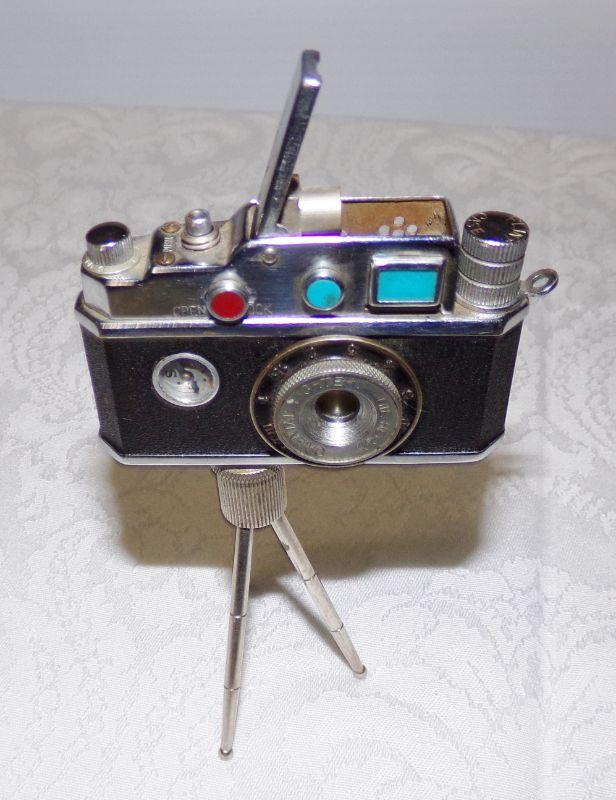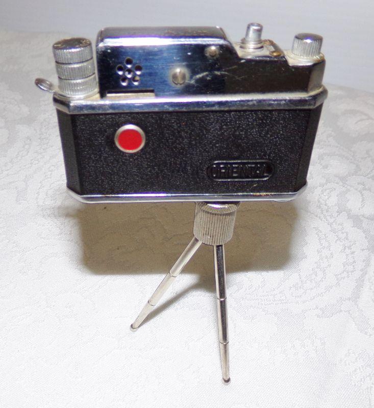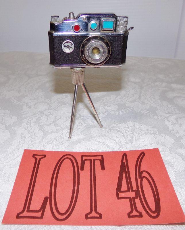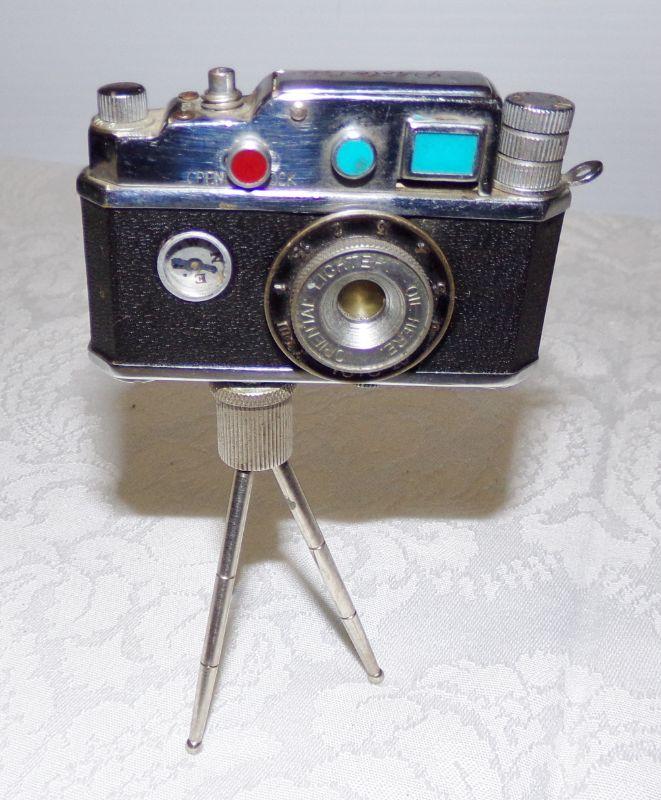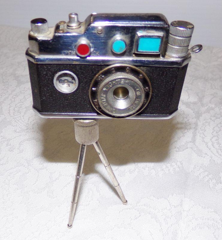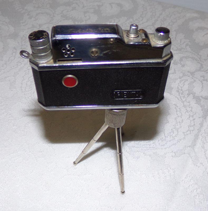 CAMERA WITH TRIPOD TABLE LIGHTER PROBABLY NEEDS FLUID AND FLINT IN ORDER TO LIGHT