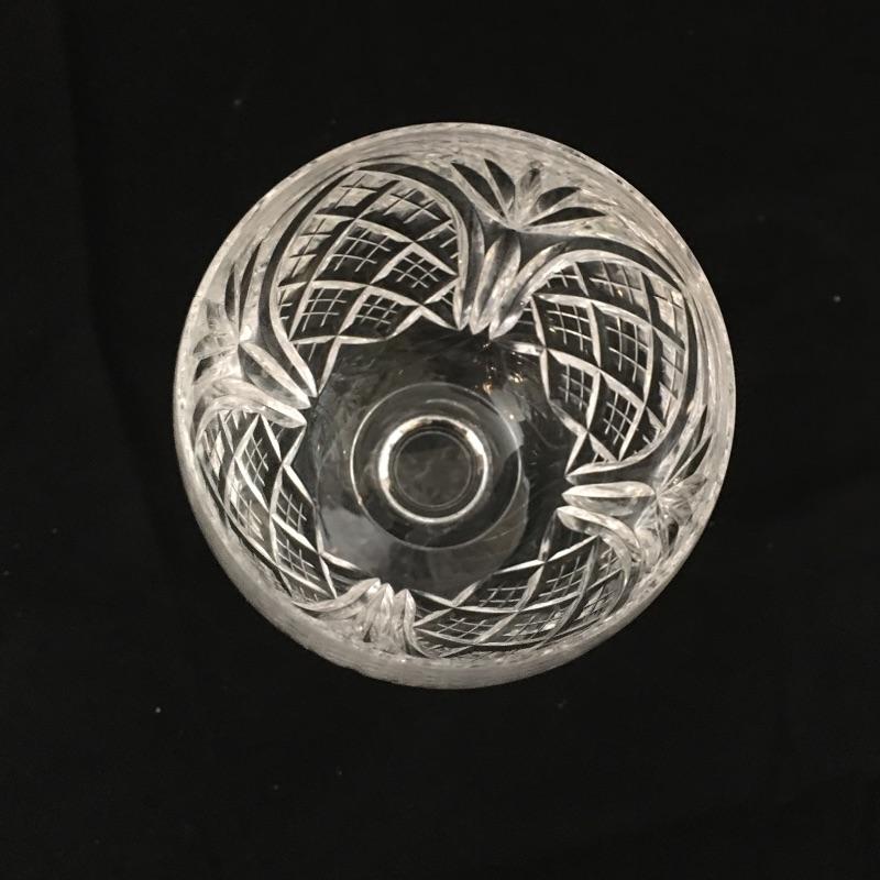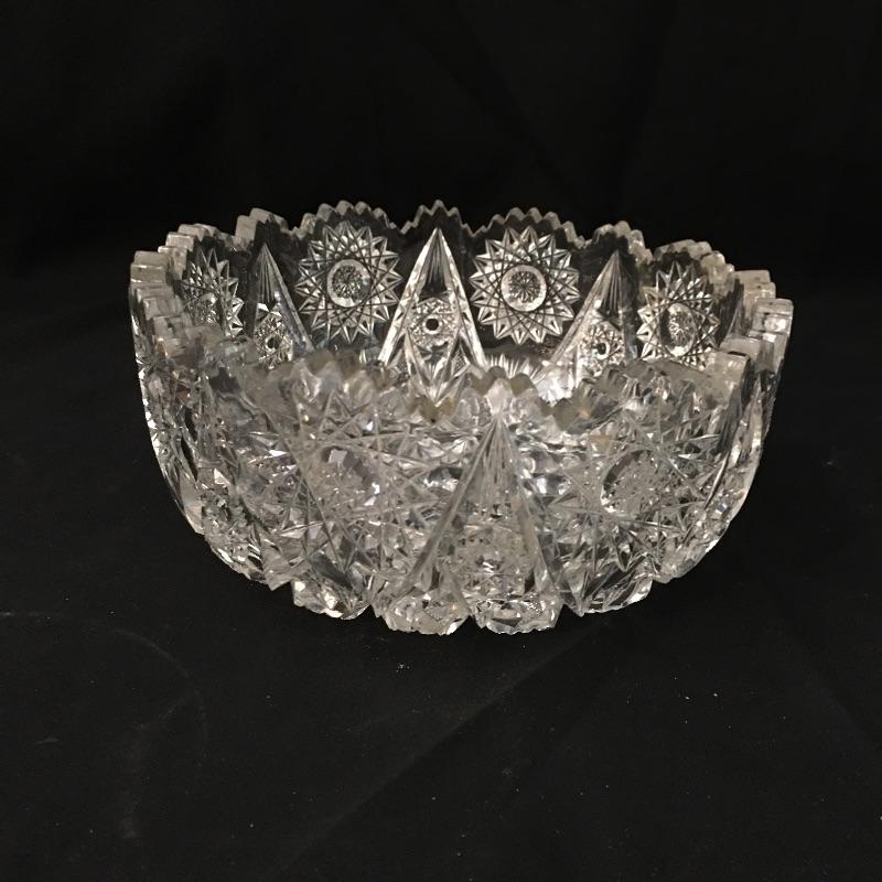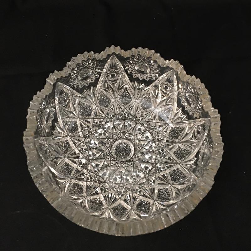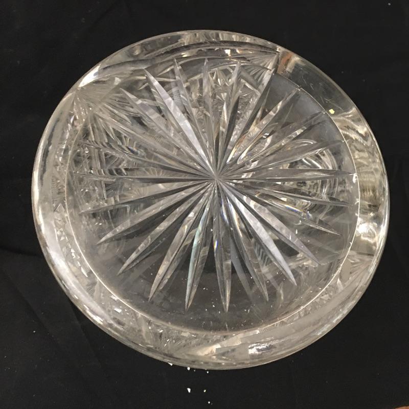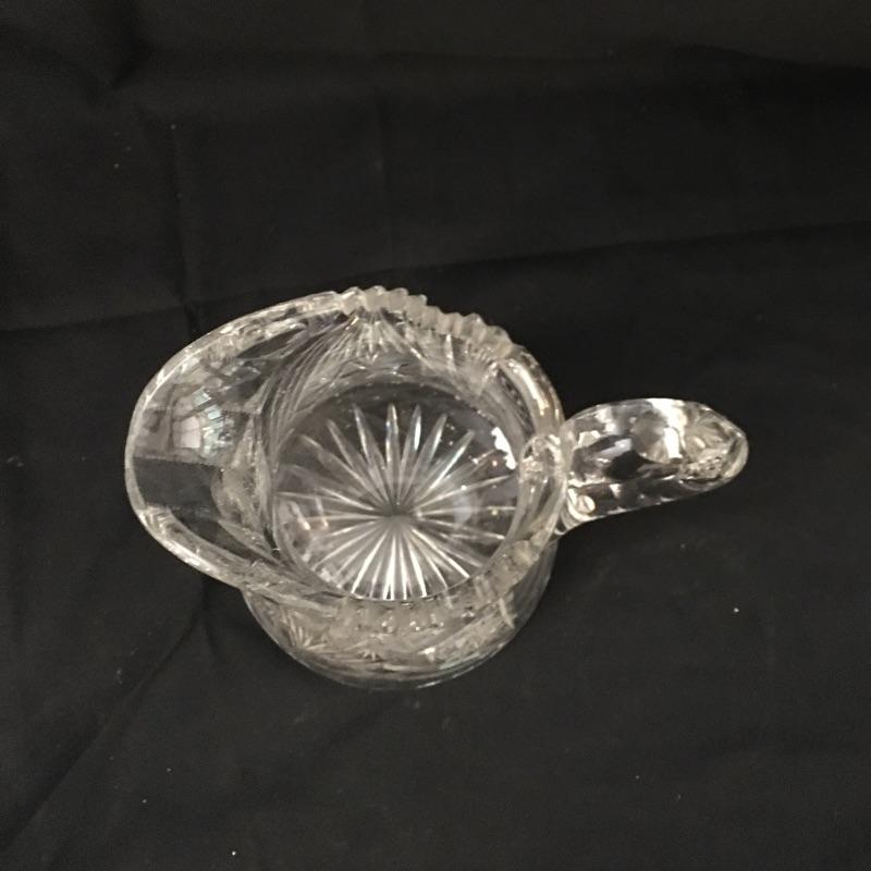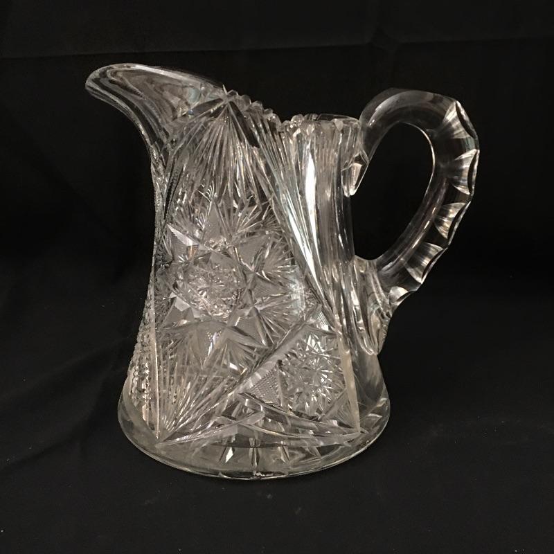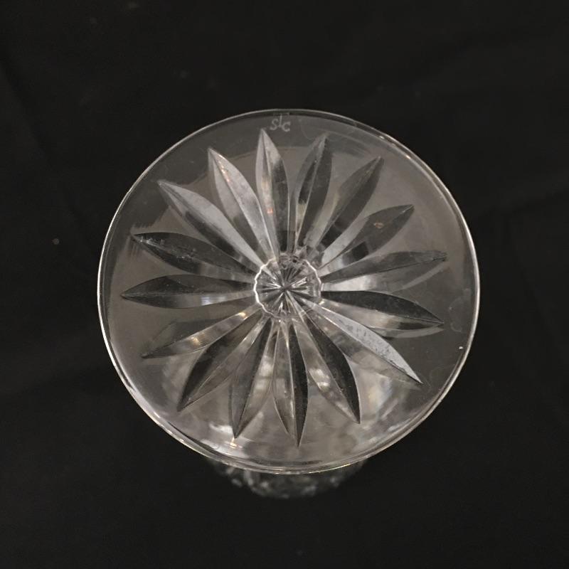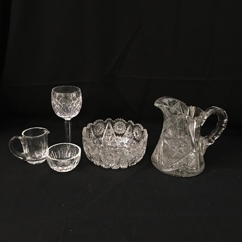 Cut glass collection. Lot includes bowl with Russian starburst design, pitcher, footed goblet signed STC (zoom the image showing bottom of glass), small bowl and mug. Pitcher measures 6.5”D x 8” tall.