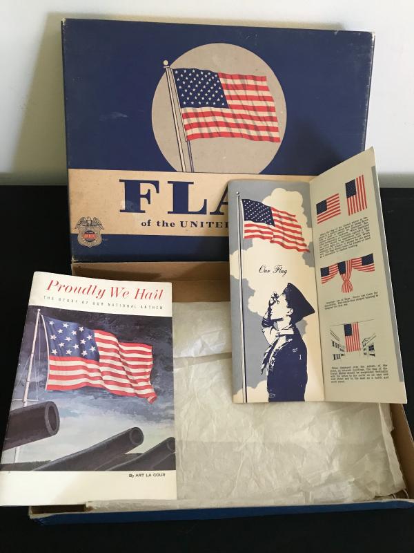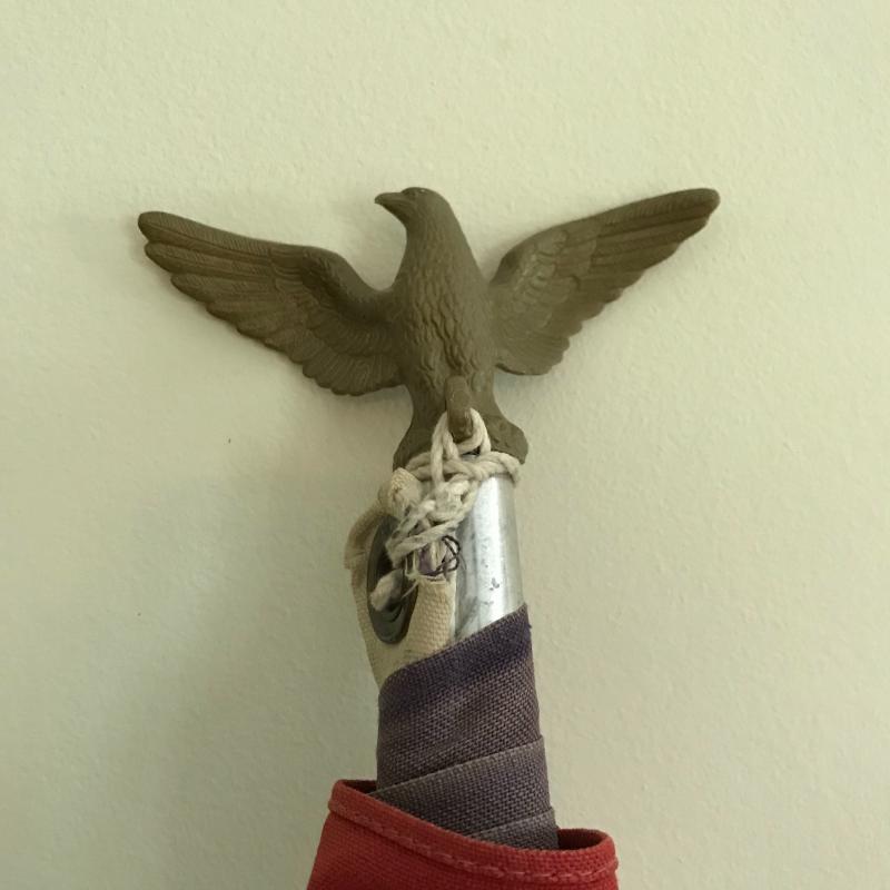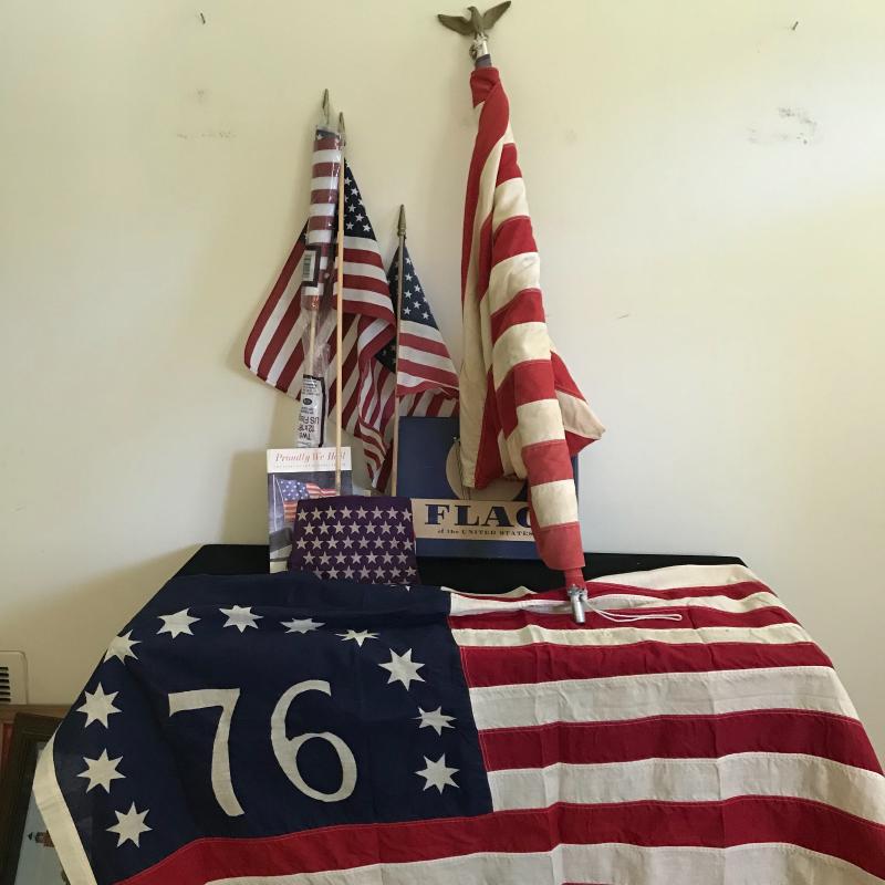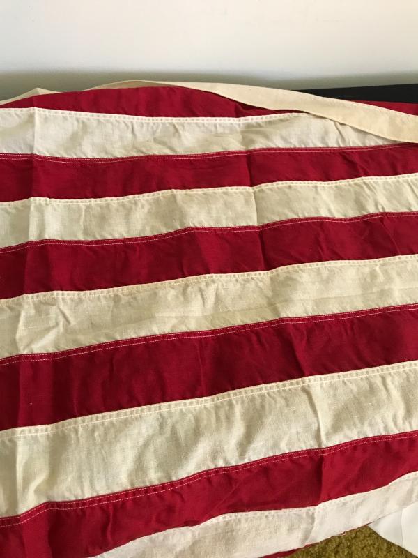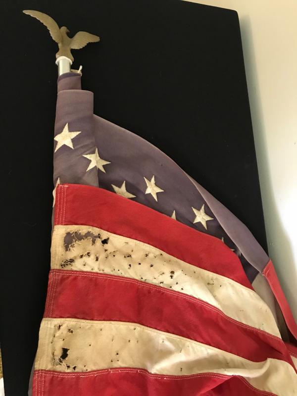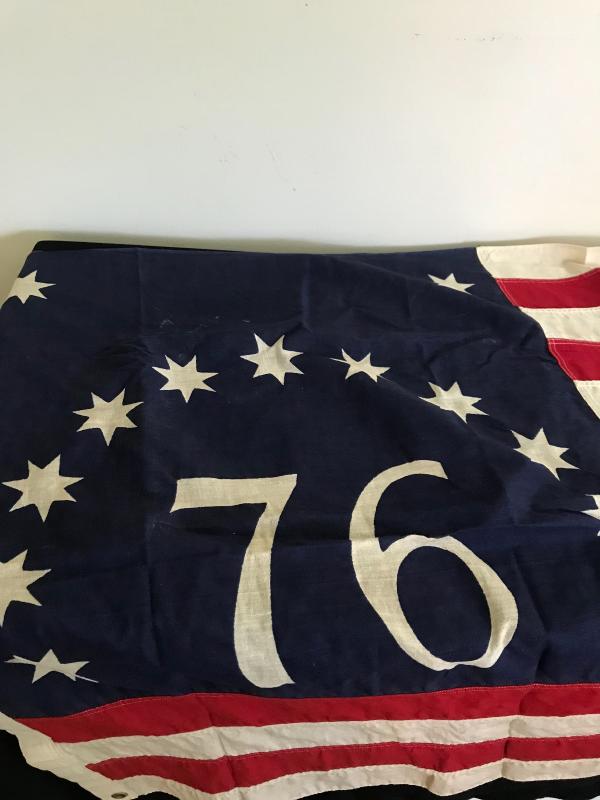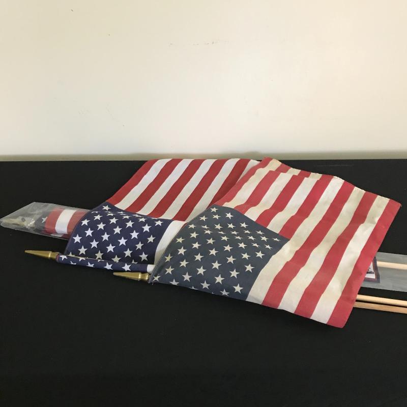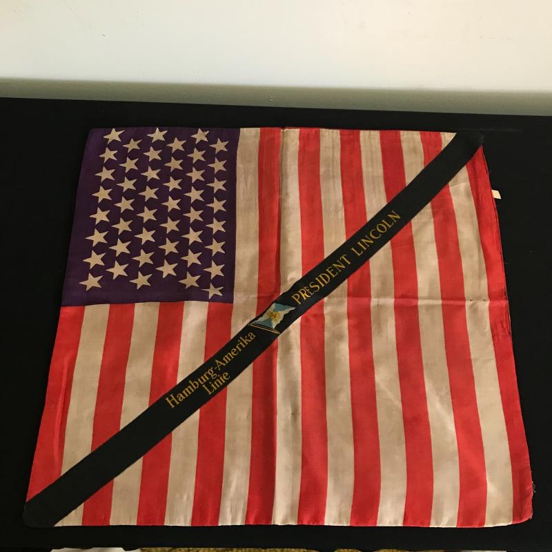 Two large American flags and three smaller ones. The largest flag is on a section of pole with a bald eagle mounted on top and measures approx. 58” x 32”. Faded with some holes. Slightly smaller and in nice condition is the Bennington American flag. Lot also includes 3 flags on wooden dowels that measure approx. 18” x 12”. Lastly, flag with “Hamburg-Amerika Linie President Lincoln” attached banner and fabric sewn on back. Local pick up only.