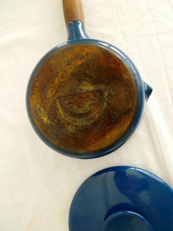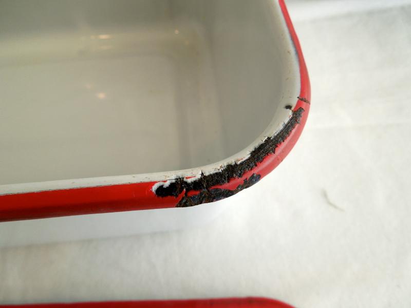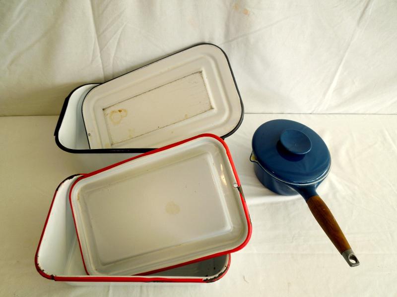 This lot includes two rectangular enamel storage containers. The red trimmed is 12" x 8" x 4". The black trimmed is 14" x8" x 5". Copco enamel saucepn with wooden handle and lid. All have been used and have chipping to enamel as shown.