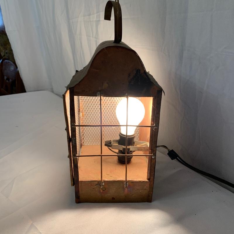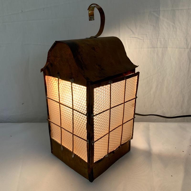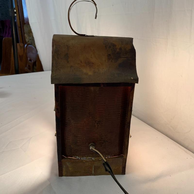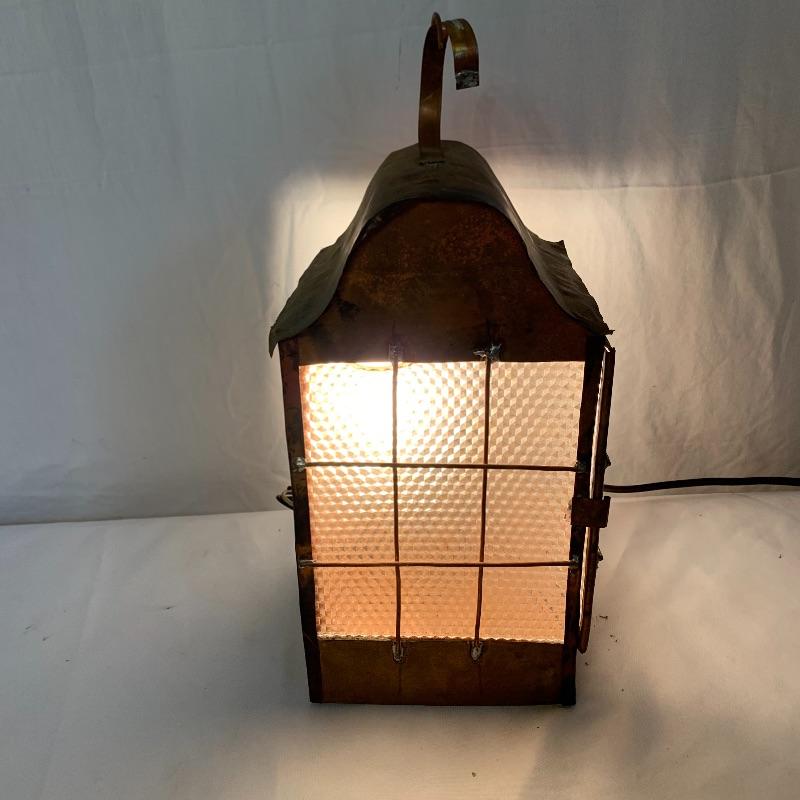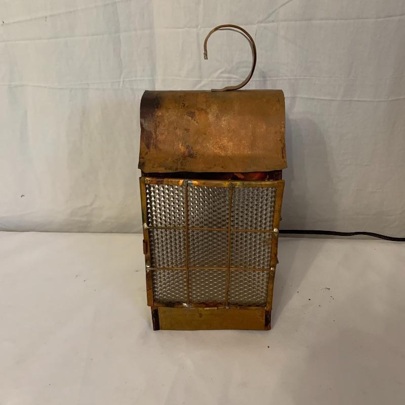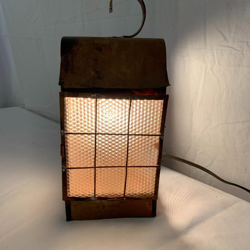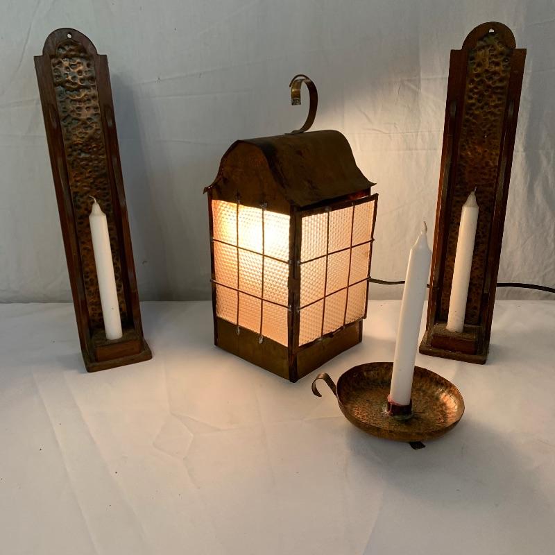 Light up your life with this lovely set of handmade copper candle holders and lantern style light. Everything in this lot is homemade. Lot 46 includes a pair of matching candle holders measuring 18” tall x 3 1/2” wide. These two can be freestanding or hung on a wall. The single candle holder is a bowl style with an adorable little handle and measures 5 1/2 across, and 2” tall. Last but not least is this super cool handmade lantern style light, measuring 12” tall, and 6 1/2 square. It’s in great working condition and features plastic lenses on 2 sides, and a whimsical handle on top. Shipping available.