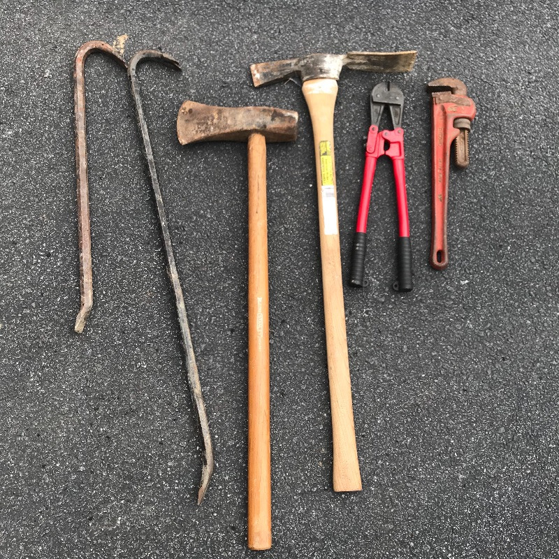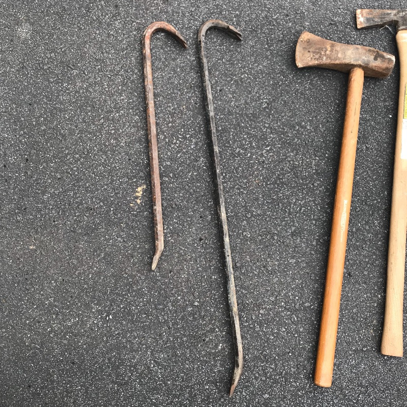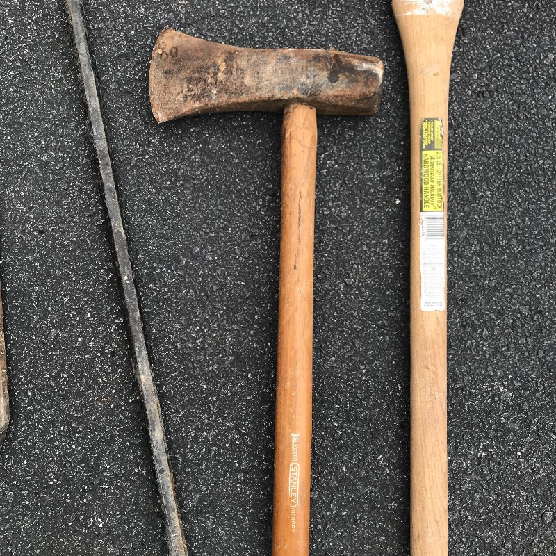 Attack those heavy duty jobs with this collection of tools. Included is a Stanley sledgehammer and Ludell fully drop forged head pick axe. Red Pittsburgh cutter and orange Rigid heavy duty clamp are both 18”. Lot also includes two crowbars, the largest is 35”.