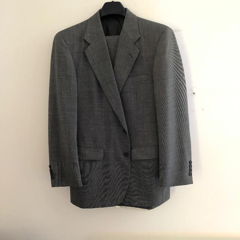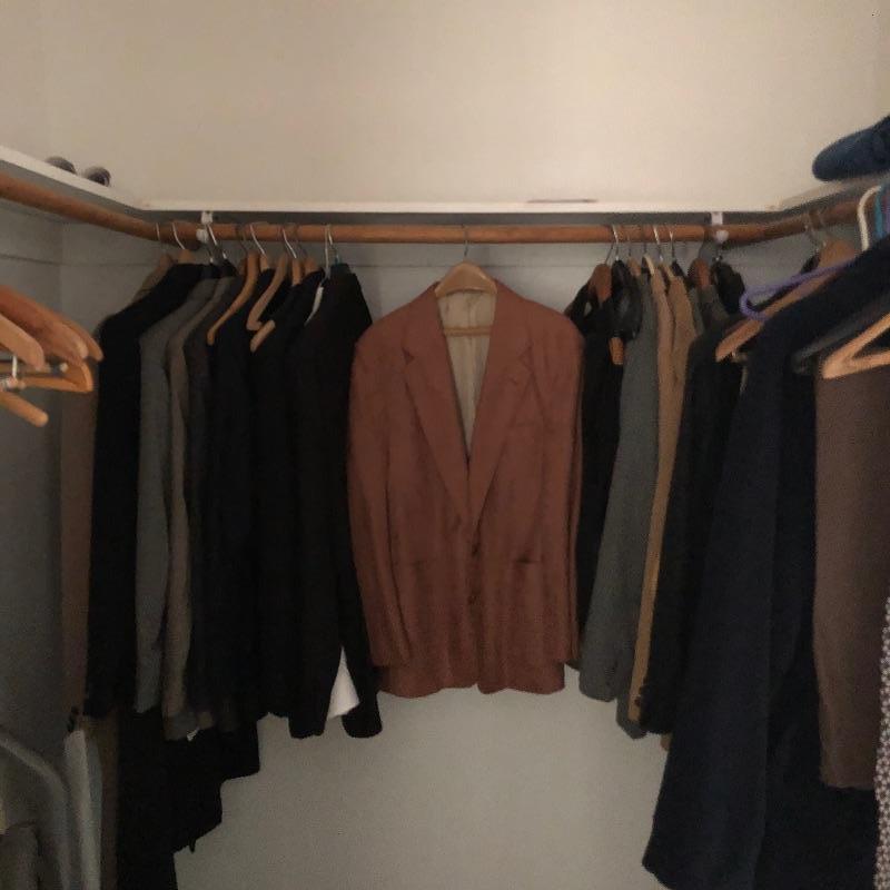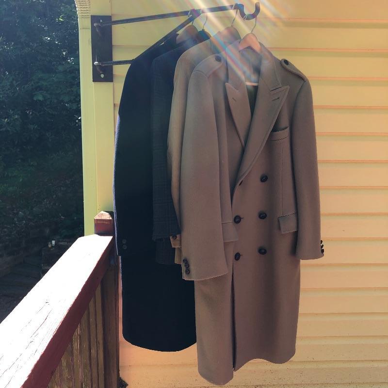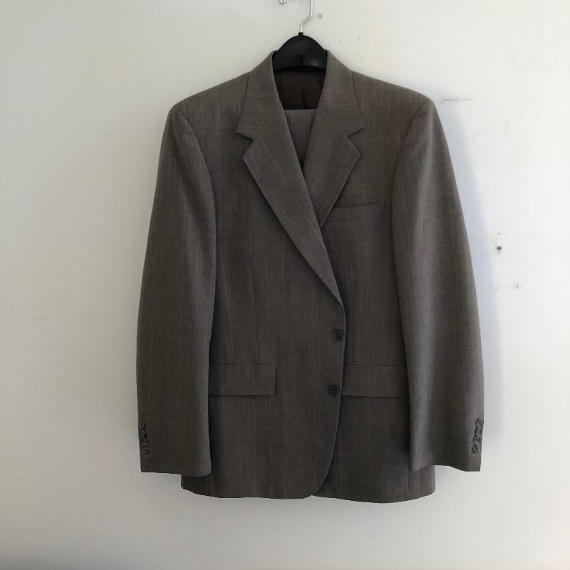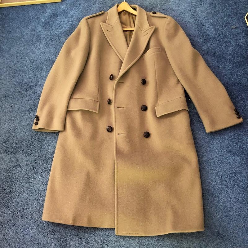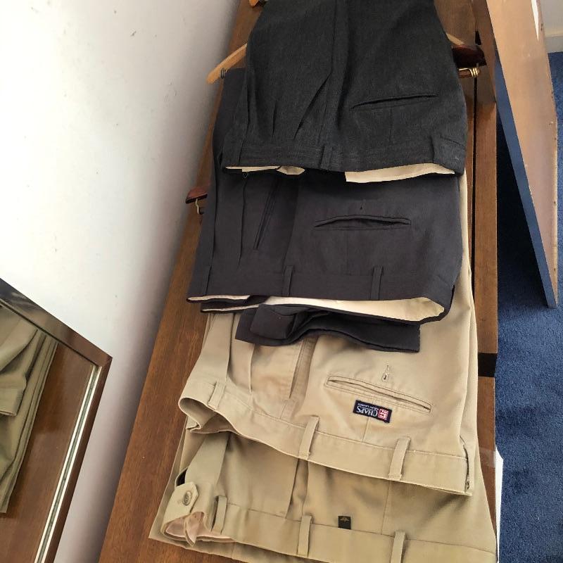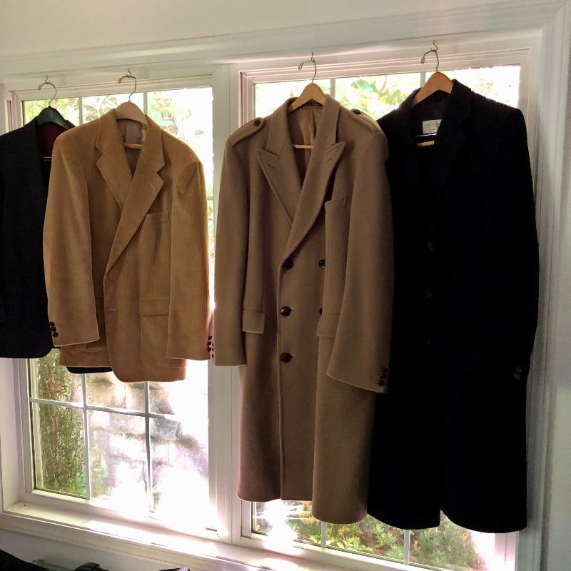 Two high end wool coats, oodles of suits, waistcoats and more here. The camel colored merino wool coat is made in England, the pocket has a row of the letter SSSSS’s on it, which might be the logo for the brand? No size was found but it measures approximately 20” across shoulders, 25” across chest and 30” at waist. The other coat is 100% wool Pierre Cardin and appears to be a similar size. Over 10 suit’s that include name brands such as Calvin Klein, Arnold Palmer and much more. Pants appear to be approximately 34” waist, 30” inseam and suit jackets approximately 19” shoulder, 21” chest and 23” hip.