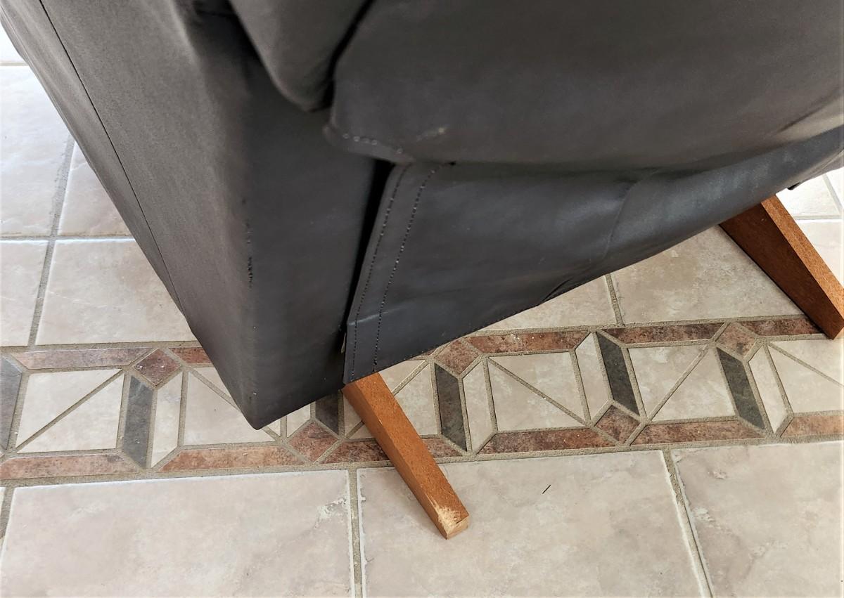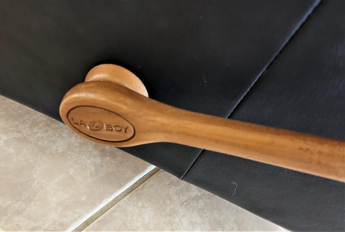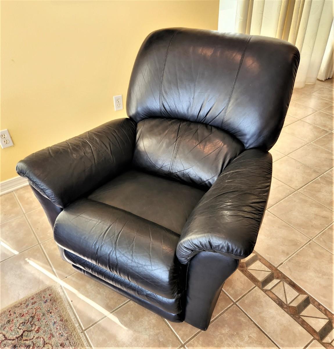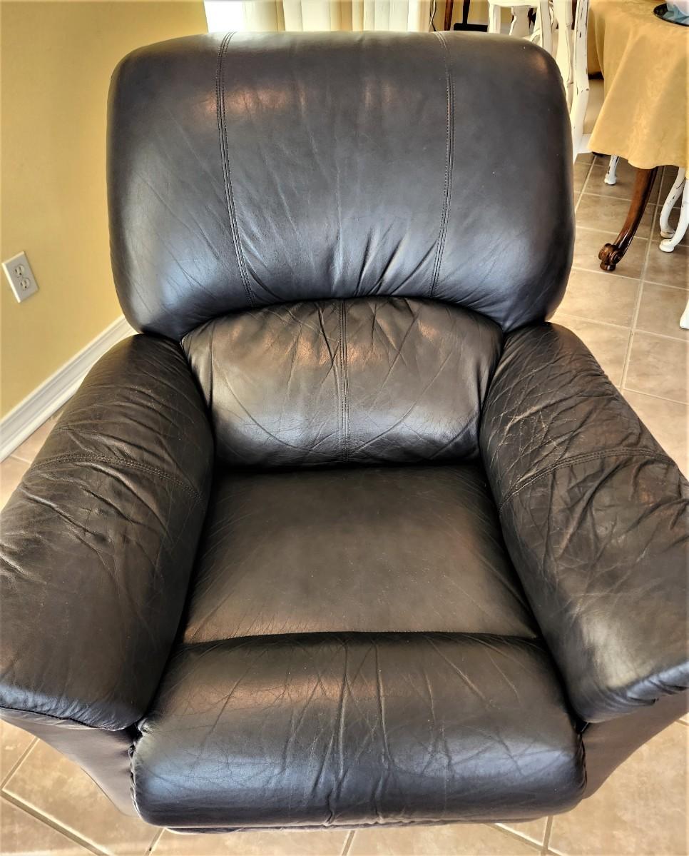 This Oh-so-comfy Lazy-Boy recliner is only gently used - part of their Casual oak line. Note: appears a doggy nipped a bit at one of the rockers in the back. A bit of wear on the inner arms (shown - nothing unexpected). 36" tall, 37" across. Will fully recline. Feels like leather, but not noted on piece.