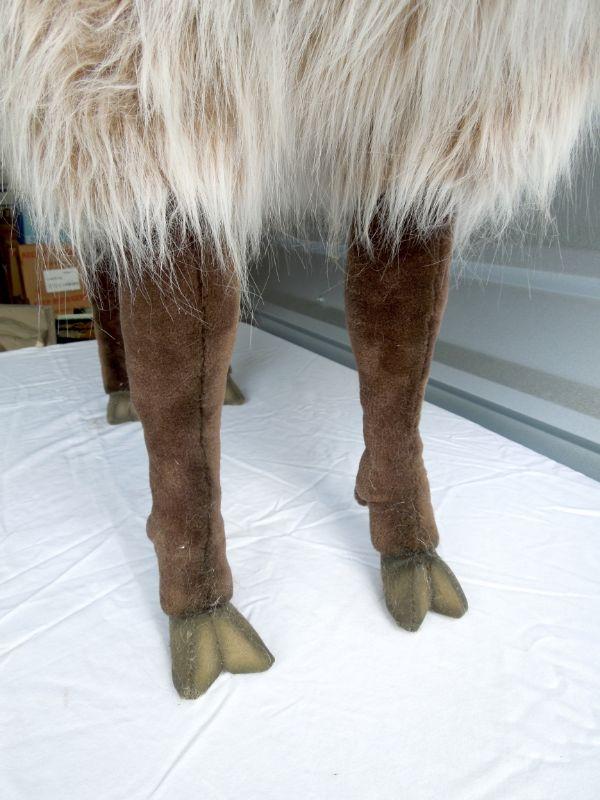 Handcrafted synthetic fiber. Internal metal frame. This life-size lamb has an exceptionally strong and lightweight frames that provide ride-on experiences for children of all ages and adults up to 150 pounds. 42" L x 16" W x 35" H. There is some type of sticky residue on the bottom of the feet. No holes or damage. Retails for over $400.
