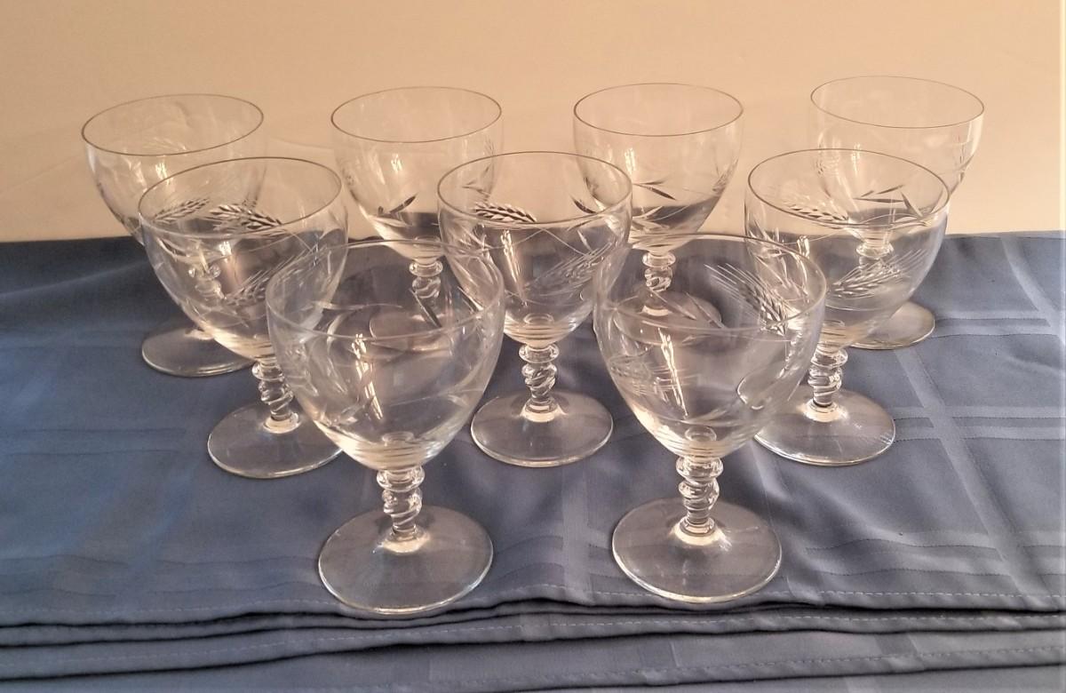 Another group of glasses that matches the set in lots 31 and 39. These are in good condition and stand 5.25" tall. Acid-etched wheat design.