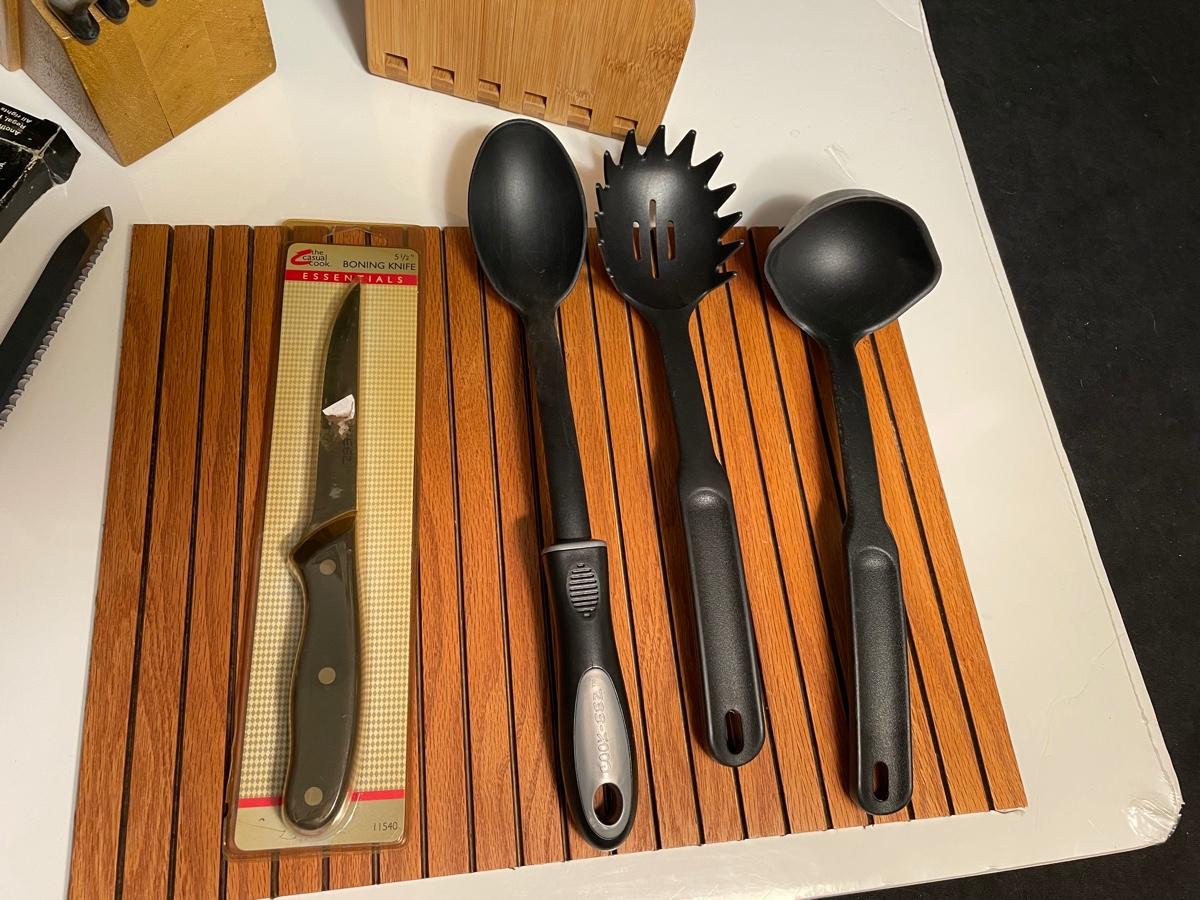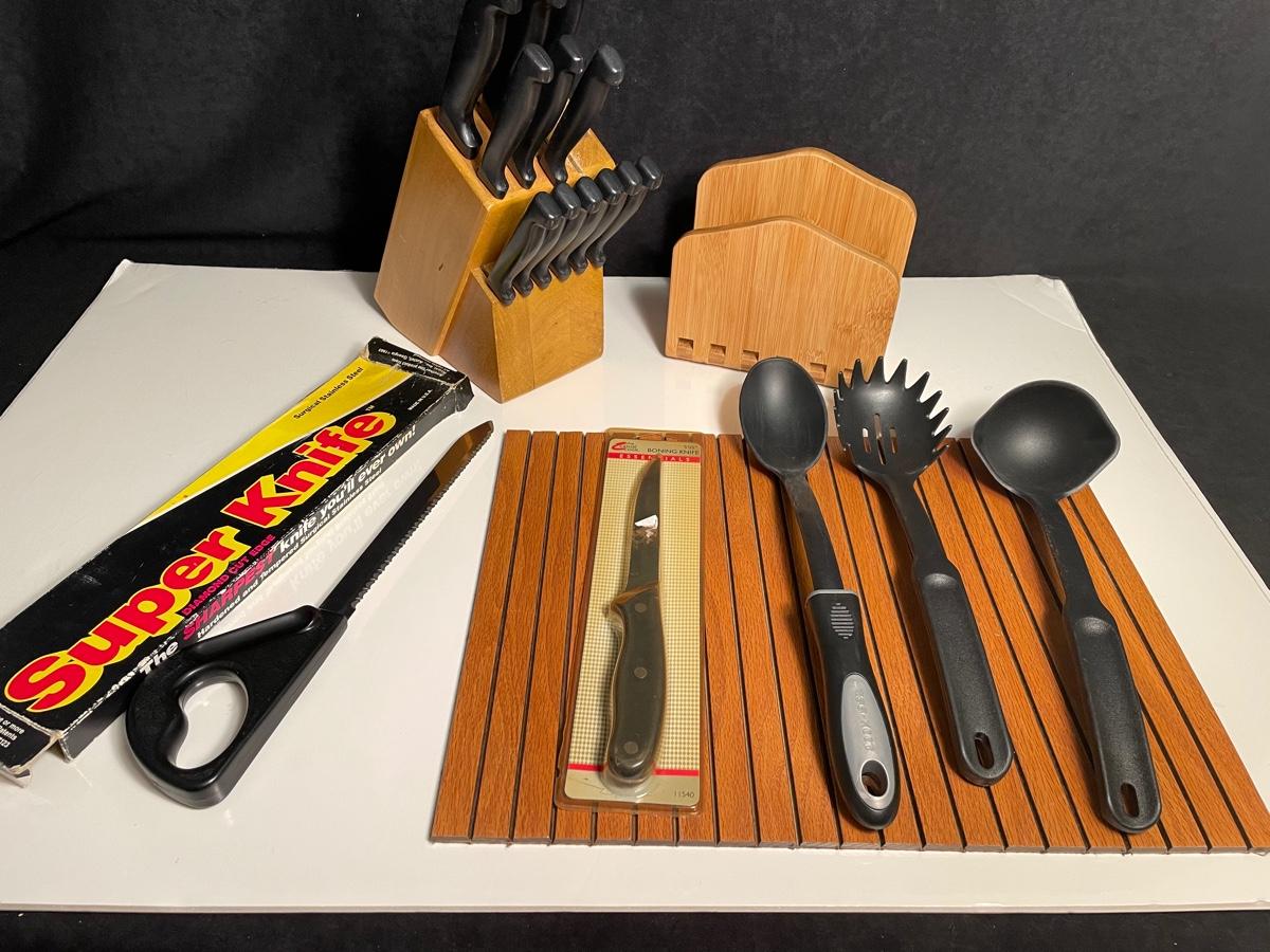 Knife block, napkin holder, Super-knife, paring knife and three plastic cooking utensils and a wooden, placemat-size trivet