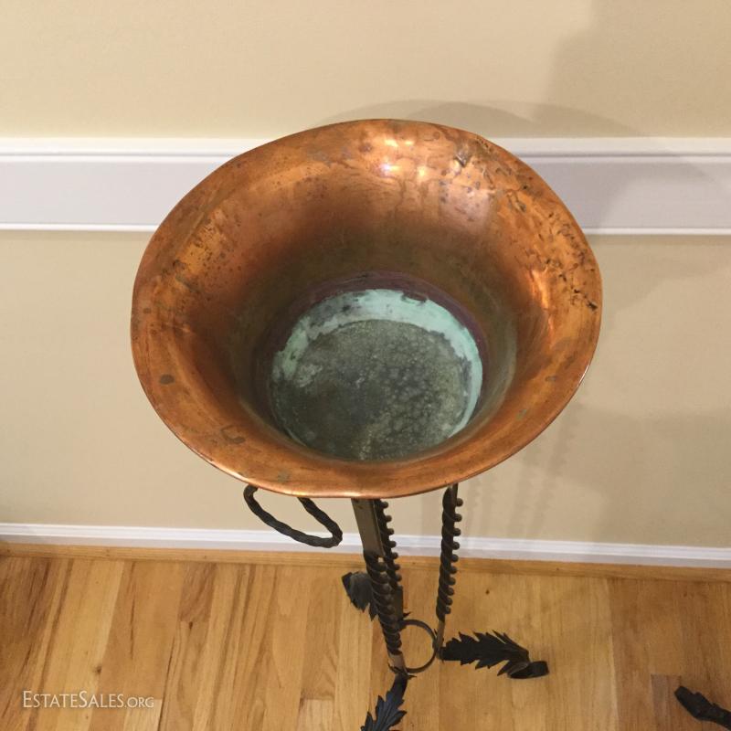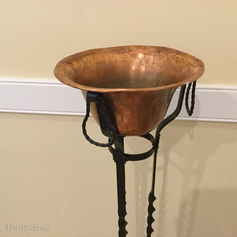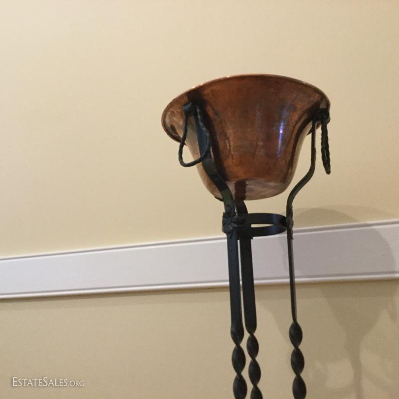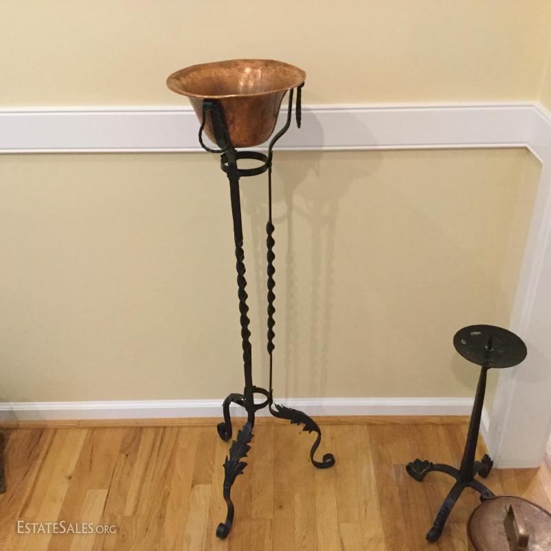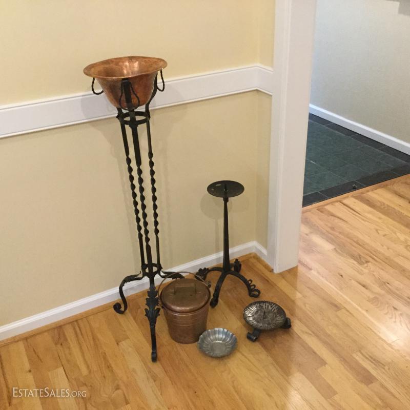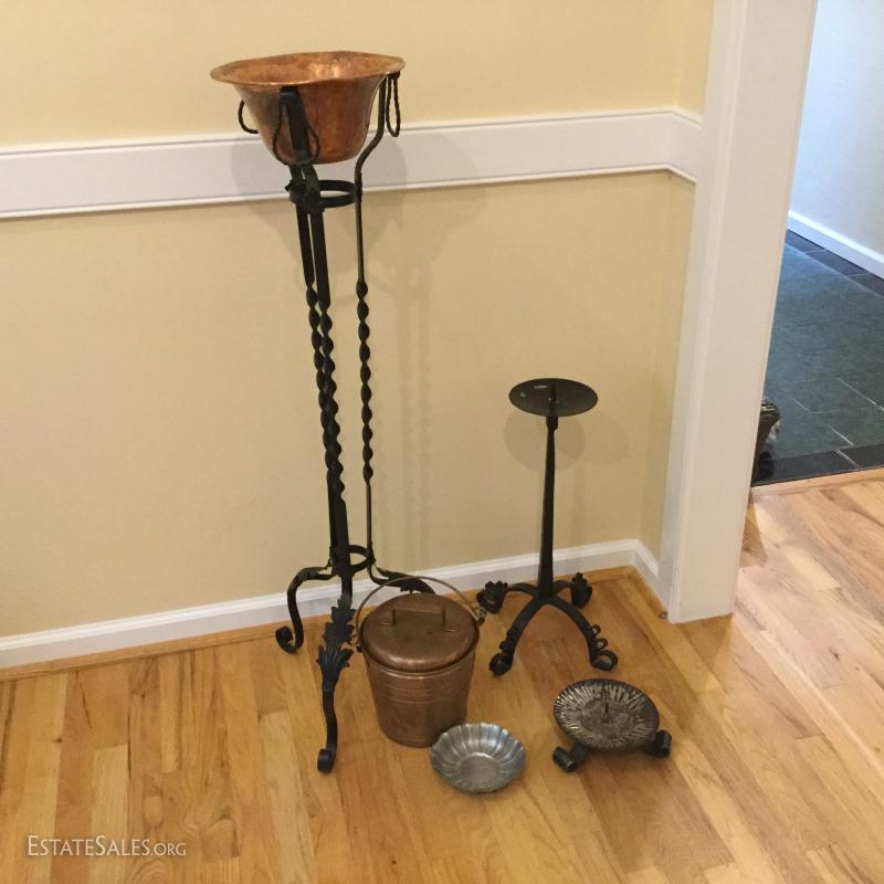 Several metal pieces. Includes candle holders in different heights. Largest is 44.5" high with Cooper bowl. Also includes Copper Smith and Hawkin bucket with lid, 20"h. See photos.